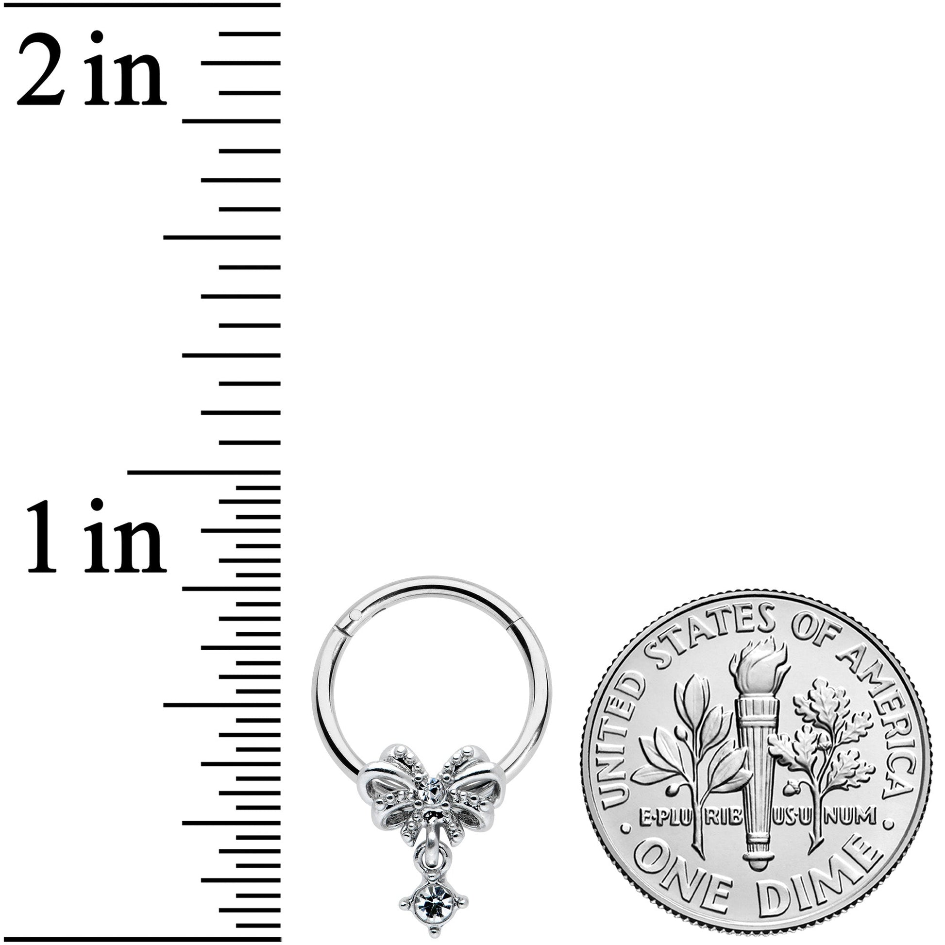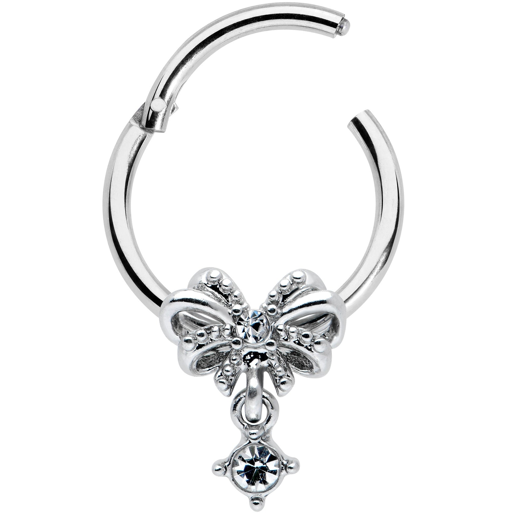 Simple style is simply stupendous on this 16 gauge septum ring! It's made with a 10mm durable 316L surgical grade stainless steel hinged circular ring. It features a bow charm, with criss-crossing loops, some of which are paved with textured embellishment and the rest are left unadorned for contrast. The bow is set with a clear gem at the center to give a coordinated look. Dangling from the bottom is a short length of matching chain, supporting one last clear gem. It also features a hinged, non-removable segment that makes insertion and removal a snap. You can even boast this bow in multiple piercings including septum, helix, and tragus. Wrap your look up with a bow with the simple style of this beautiful bow cartilage jewelry!Specifications