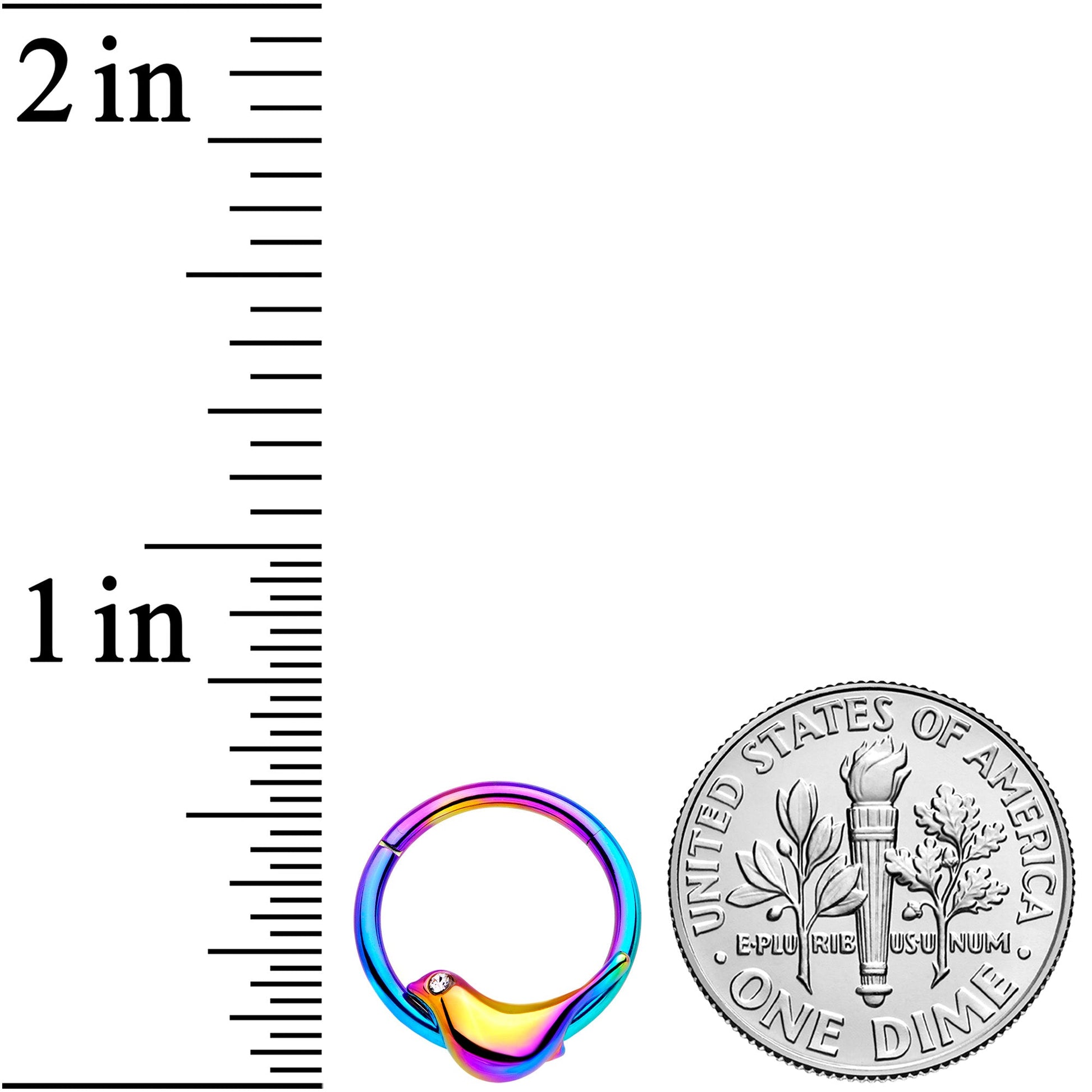 There's no way you can feel gloomy when you have this 16 gauge cartilage ring in your cartilage piercing! It's made with a 10mm rainbow PVD over 316L surgical grade stainless steel hinged circular ring. Perched upon the septum ring is a matching rainbow color bird charm. The bird features a clear gem eye and sleek, modern lines. It also features non-removable, hinged segment that makes insertion and removal a snap. And you can rock this bird in multiple piercings including septum, helix, and tragus. You'll be singing a happy tune with this classy and colorful bird cartilage earring nesting in your piercing!Specifications