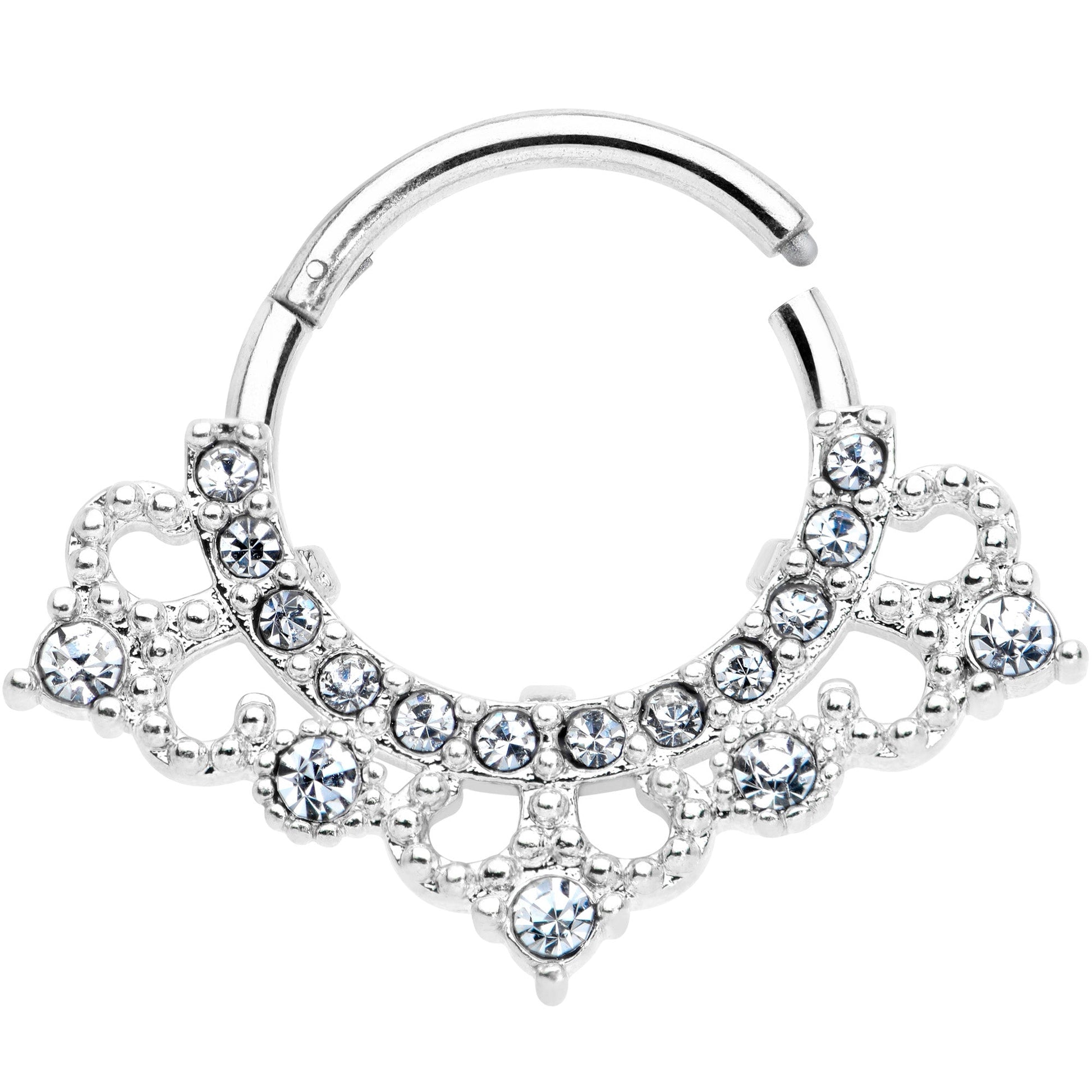 Crown your cartilage piercings in beauty with this 16 gauge septum ring! It's made with a 10mm durable 316L surgical grade stainless steel hinged circular ring. The bottom curved is paved in small clear gems. Beneath it is an elegantly styled embellishment that resembles a royal crown. There are clear gems set at the tips for a cohesive and opulent appearance. It also features a hinged, non-removable segment that makes insertion and removal a snap. And you can rock this cartilage jewelry in multiple piercings including helix, tragus, and septum piercings! Let our piercings feel like royalty with this elegant, extravagant tragus jewelry!Specifications