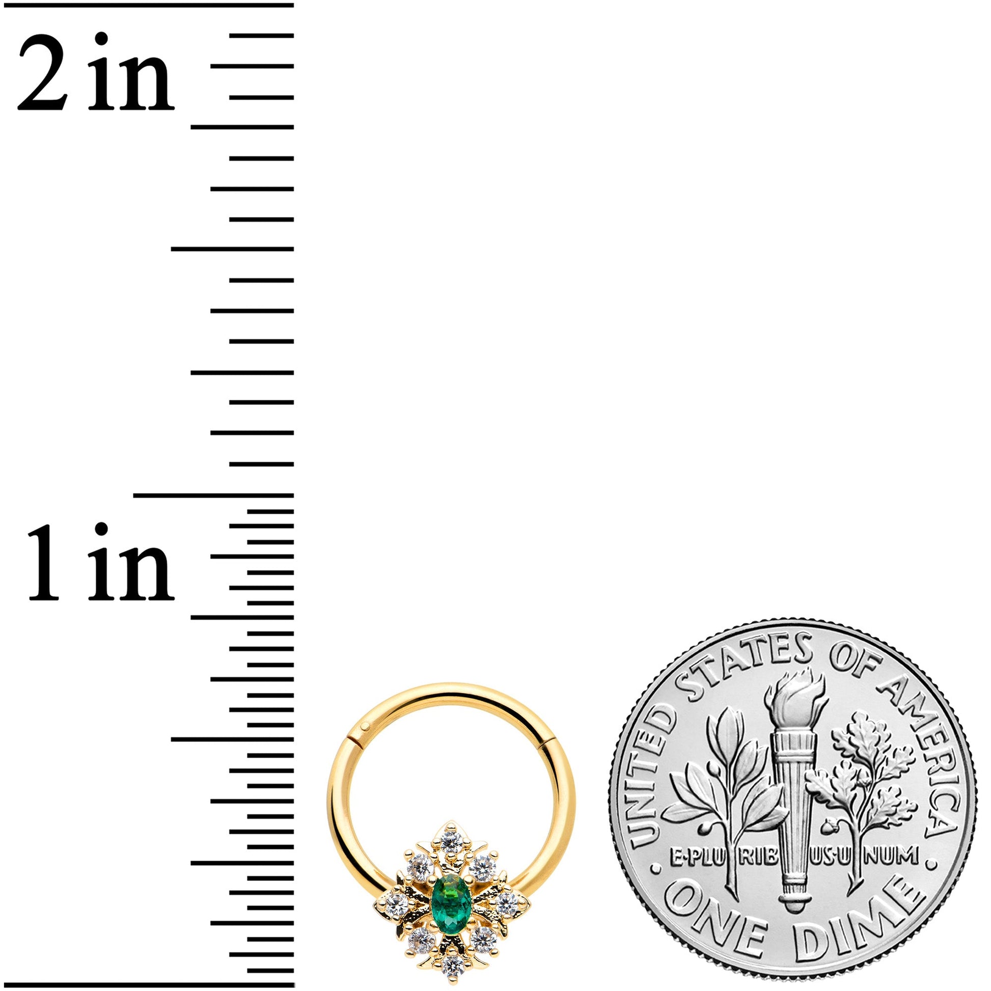 Take your cartilage piercings back in time with this antique-inspired 16 gauge septum ring! It's made with a 10mm gold tone PVD over 316L surgical grade stainless steel hinged circular ring. It features a large, oval green gem charm, set in a stylized rhombus that's embellished with clear gems for an elegantly retro appearance. It also features a hinged, non-removable segment that makes insertion and removal a snap. You can even rock this rhombus in multiple piercings including tragus, helix, and septum piercings. Give an antique-inspired look to a modern piercing with this Art Deco styled cartilage jewelrySpecifications