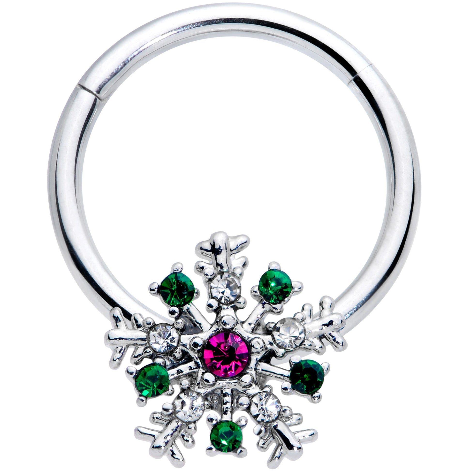Even the snow is all spruced up for the holidays on this 16 gauge septum ring! It's made with a 10mm durable 316L surgical grade stainless steel hinged circular ring. It features an elegantly styled snowflake charm. The snowflake is set with clear, pink, and green gems for color contrast and an added touch of festivity that's sure to make you want to celebrate. It also features a non-removable, hinged segment that makes insertion and removal a breeze. You can even wear it in multiple piercings including tragus, helix, and septum piercings.This winter, celebrate in colorful style with this festive snowflake cartilage piercing ring!Specifications