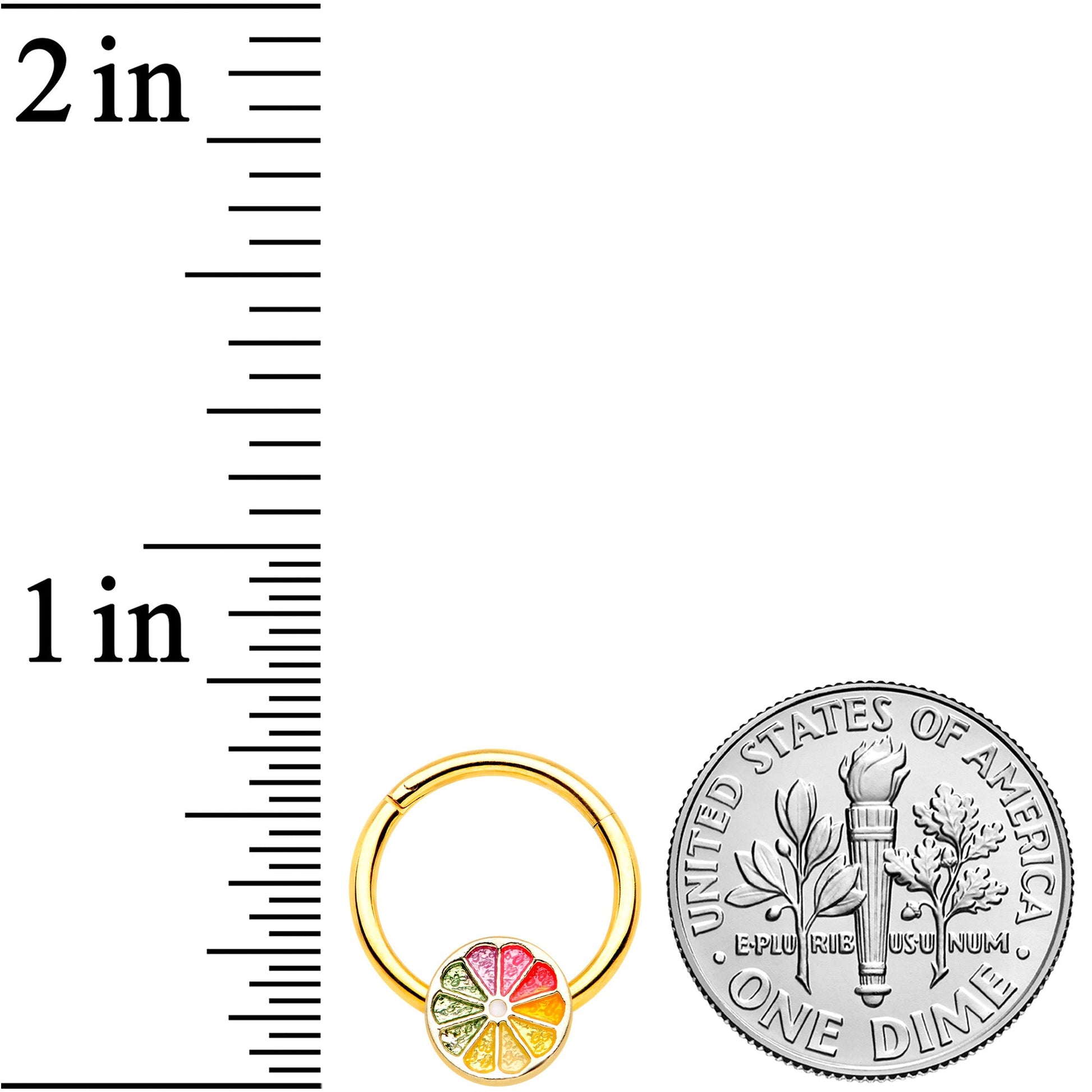 This grapefruit won't just make for a tasty breakfast, it'll glam up your cartilage piercing at every meal with this 16 gauge cartilage ring!! It's made with a 10mm gold tone PVD over 316L surgical grade stainless steel hinged circular ring. It features a sliced grapefruit charm with a ring of white around the outer edge - just like the real thing. However, this grapefruit has segments in a rainbow of colors! It also features a non-removable, hinged segment that makes insertion and removal a breeze. And you can wear it in multiple cartilage piercings including your septum, helix, daith, rook, and tragus piercings! Now that's a juicy piece of cartilage jewelry!Specifications