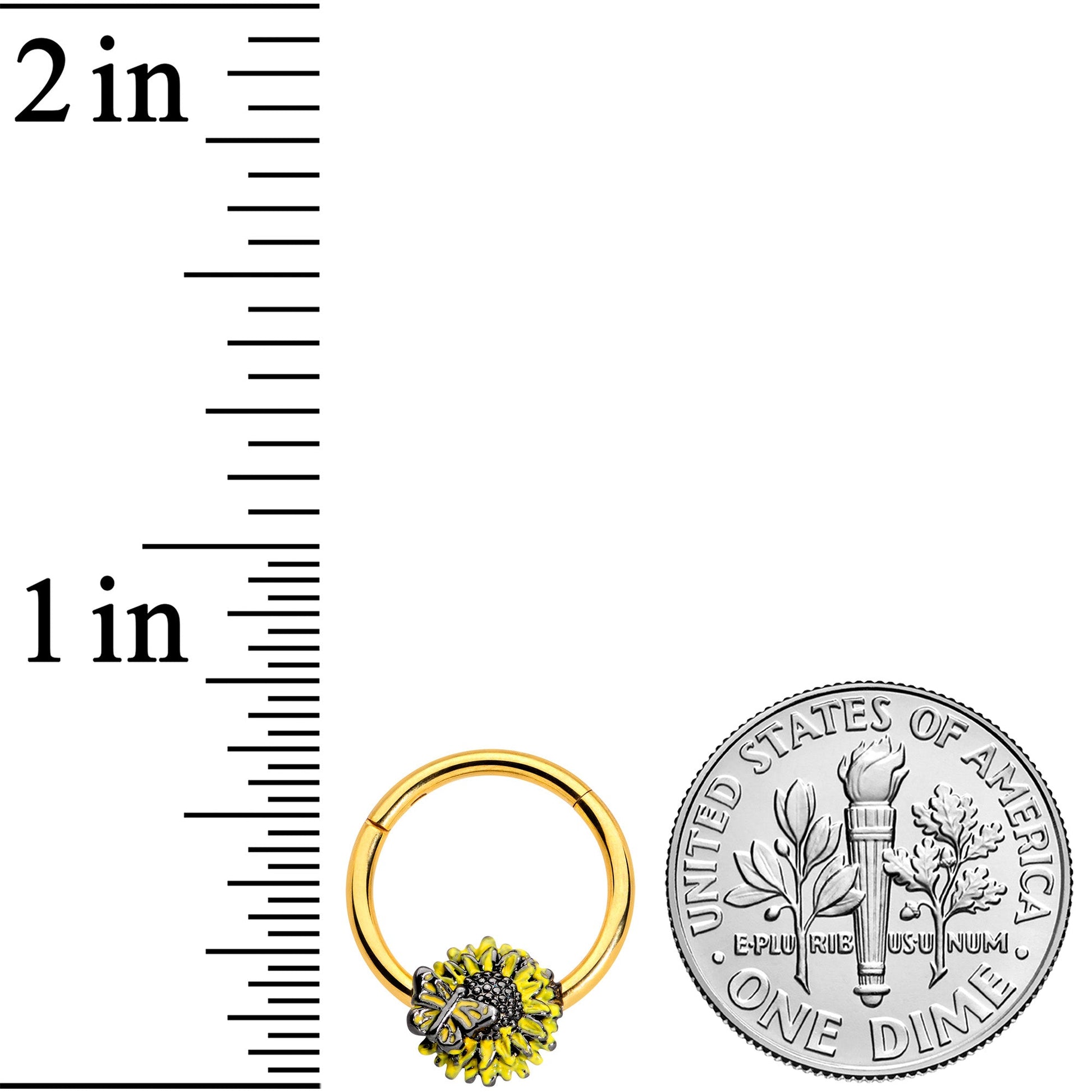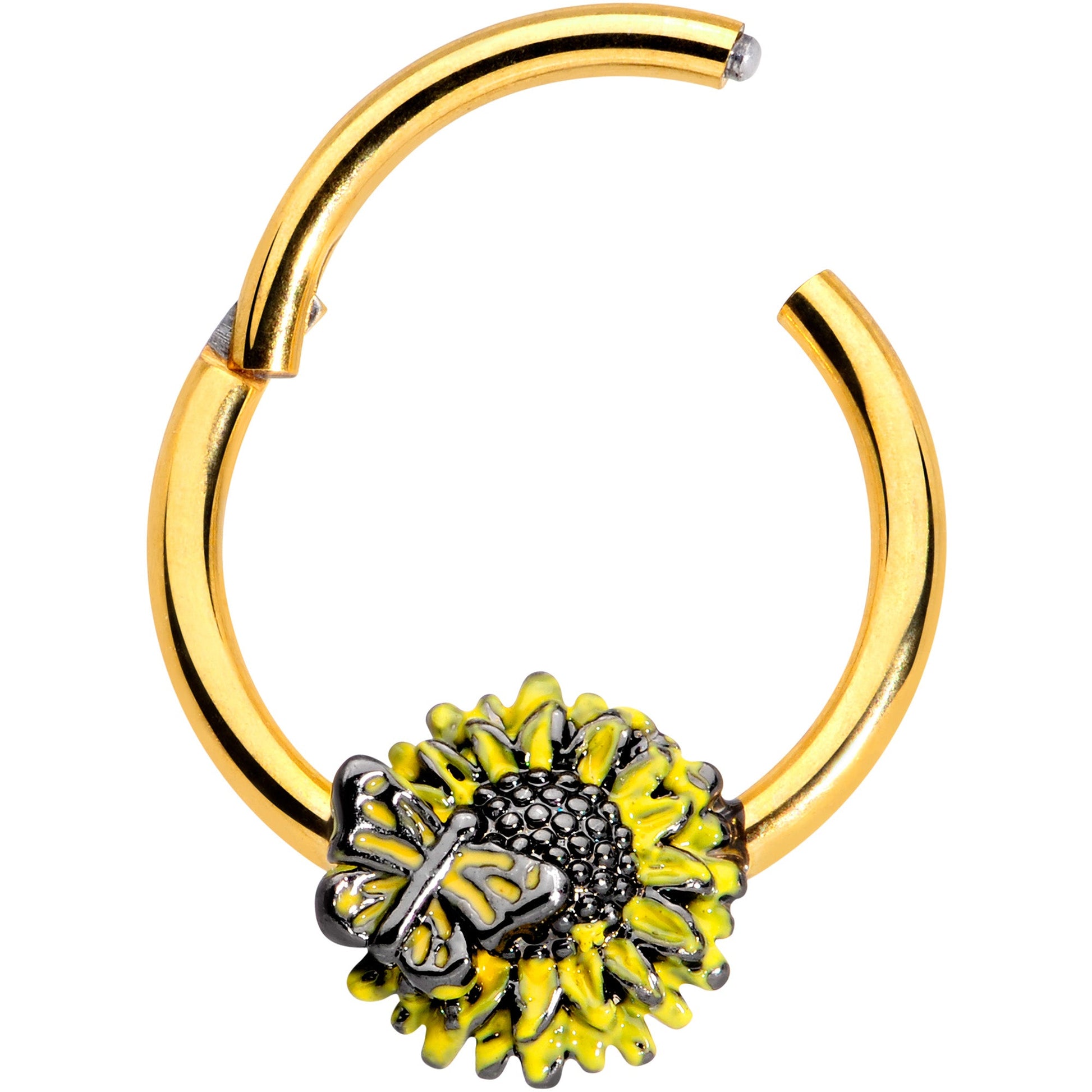 Add a little sunshine to your day - every day with this 16 gauge cartilage jewelry! It's made with a 10mm gold tone PVD over 316L surgical grade stainless steel hinged circular ring. It features a sunflower charm with a textured center and yellow embellishment for a realistic appearance. Perched on the sunflower is a tiny butterfly in matching black and yellow. You can even sport this sunflower in multiple piercings including helix, tragus, and septum piercings. Let the sun shine all year round with this fabulous floral septum ring!Specifications