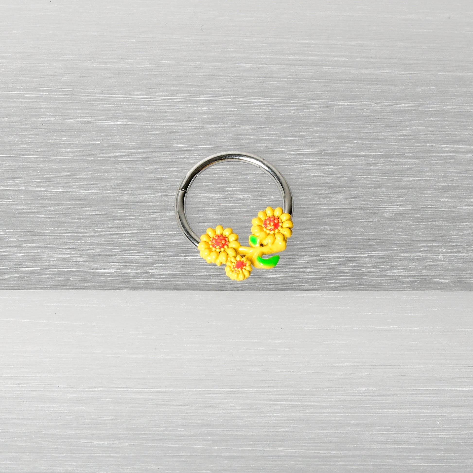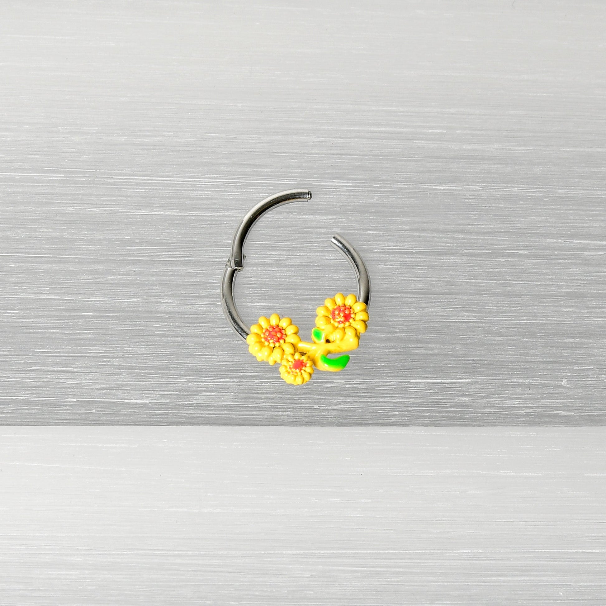 The sun is out...and it's brought some friends on this 16 gauge septum ring! It's made with a 10mm durable 316L surgical grade stainless steel hinged circular ring. It features a triple yellow sunflower charm with textured detailing at their centers. They're further embellished with a pair of green leaves. It also features a non-removable, hinged segment and you can rock these flowers in multiple piercings including tragus, helix, and some daith piercings. Make every day a sunny day with this striking sunflower cartilage jewelry!Specifications