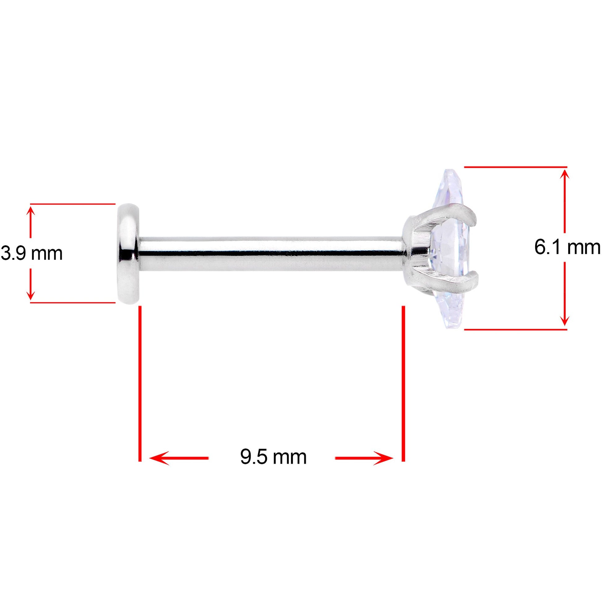 These 16 gauge labret studs are graceful and refined while maintaining a lush look of opulence. Made with a 10mm durable 316L surgical grade stainless steel straight posts, each one is topped with an oval-shaped cubic zirconia gem with pointed tips, a shape that's reminiscent of a cat's eye. You get one each in clear, feminine pink, and a deep opulent red for maximum drama. With their flat backs, these also make perfect jewelry for a monroe or lip piercing as well as cartilage piercings like the tragus! Sold as a set of three.Specifications