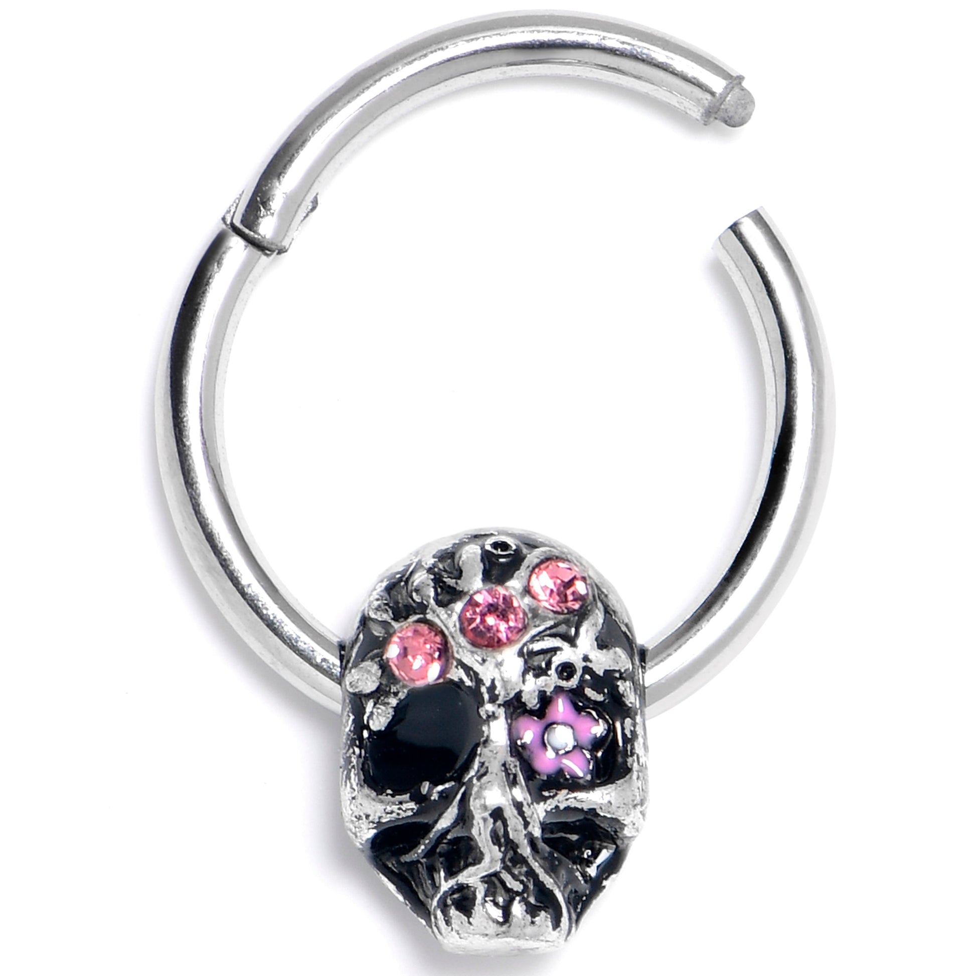 Get spooky, stylish and sexy all at once with this 16 gauge septum ring. It is made with a 10mm durable 316L surgical grade stainless steel hinged circular ring. It features a skull charm, with the skull's face set with pink gems. The skull also has a pink flower eye and a black gem eye for added style. It also features a non-removable, hinged segment that makes insertion and removal a breeze and you can rock it in multiple piercings including tragus, helix, and some daith piercings. Add a bit of creepy cool to your look with this skull-themed cartilage piercing jewelry.Specifications