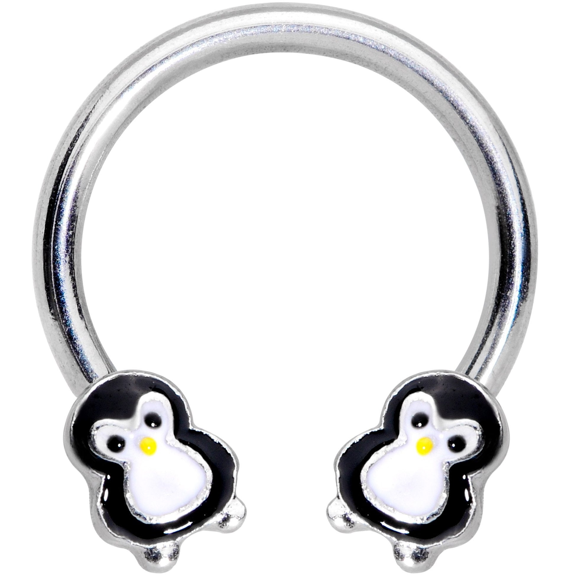 You'll just want to cuddle these pudgy penguins as soon as you see them! This 16 gauge horse barbell ring features a pair of fun, pudgy little penguin charms, both with a yellow beak. The pudgy penguin charms are mounted on the ends of a 10mm horseshoe barbell made with durable 316L surgical grade stainless steel.Specifications