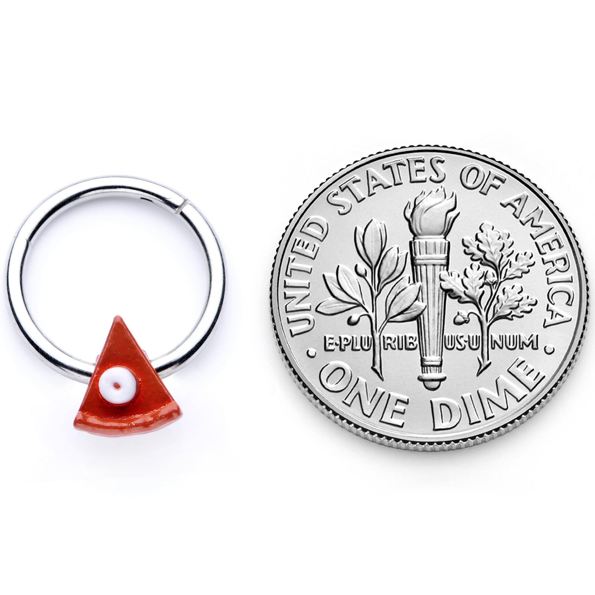 Mmmm.......what's cooking, good looking? Something delicious for the fall season when you're wearing this 16 gauge cartilage ring! It's made with a 10mm durable 316L surgical grade stainless steel hinged circular ring. It features a delicious-looking wedge of pumpkin pie charm embellished with a swirl of white whipped cream on top. This cartilage jewelry features a hinged non-removable segment for easy insertion and removal and it's sure to look sweet in multiple piercings including septum piercings and cartilage piercings like the tragus, helix, daith and more. This autumn or Chrsitmas you can give thanks for how gorgeous you look with this tasty little treat in your cartilage piercing!Specifications