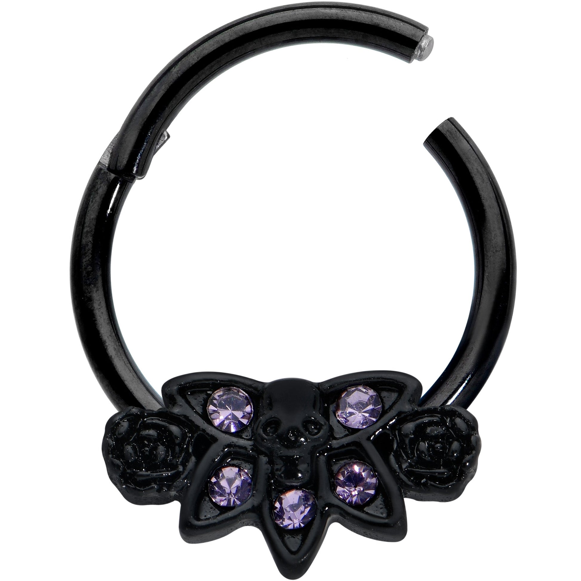 Fall in love with all things dark and creepy with this 16 gauge septum ring! It's made with a 10mm black PVD over 316L surgical grade stainless steel hinged circular ring. It features a blooming floral charm. Each of the petals is set with a purple gem. At the center of the flower is a tiny skull, embellished with raised detailing. It also features a non-removable, hinged segment that makes insertion and removal a breeze. You can even sport this skull in multiple piercings including tragus, helix, and daith piercings. This is one cartilage ring you'll love all the way down to the bone!Specifications