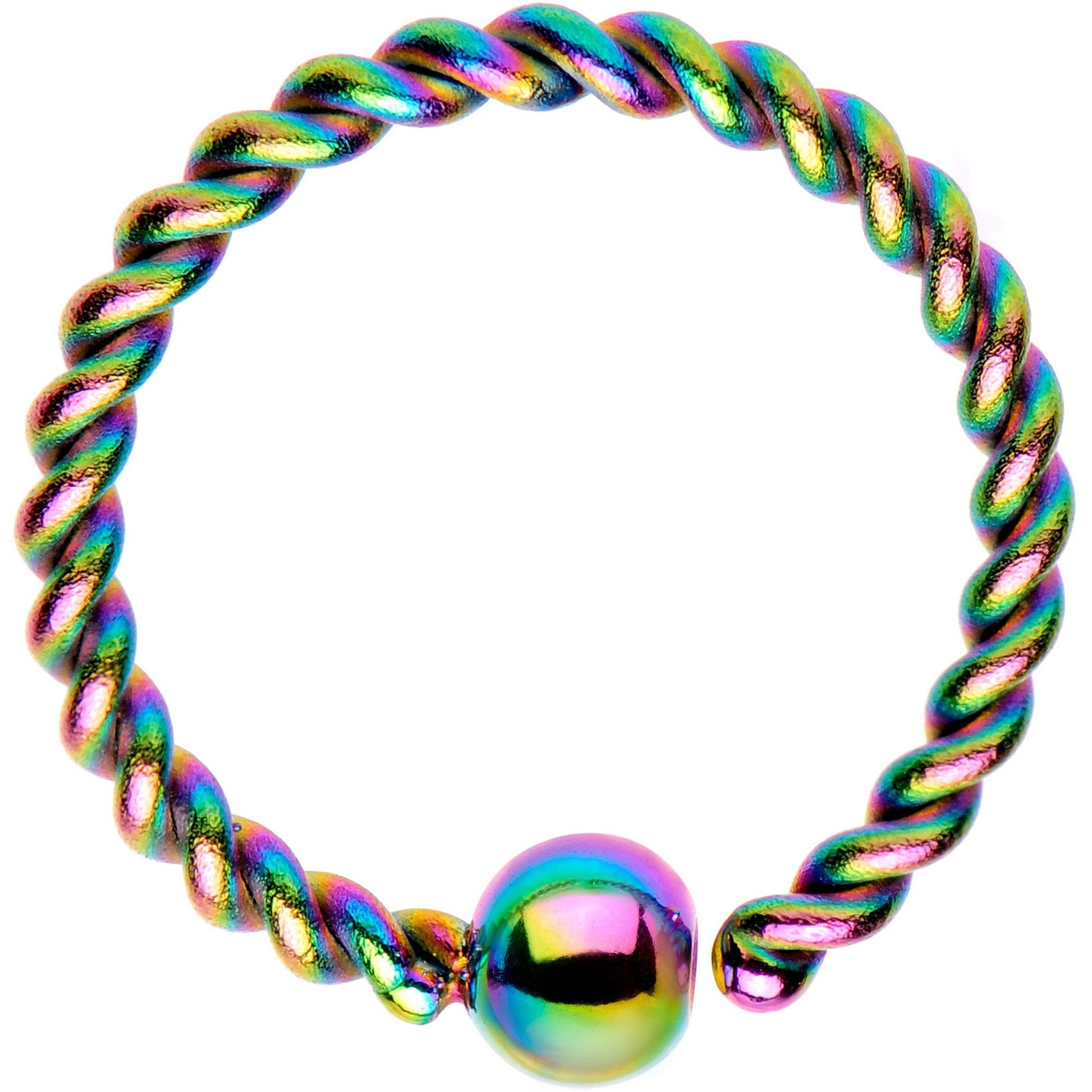 If you love simple style with a fashion twist then you will love this fun 16 gauge fashion captive bead ring. Made with a 10mm rainbow IP over 316L surgical grade stainless steel circular ring with a twist pattern on the barbell, this BCR captive piercing can be worn in a variety of piercings and will always look fashion-forward.