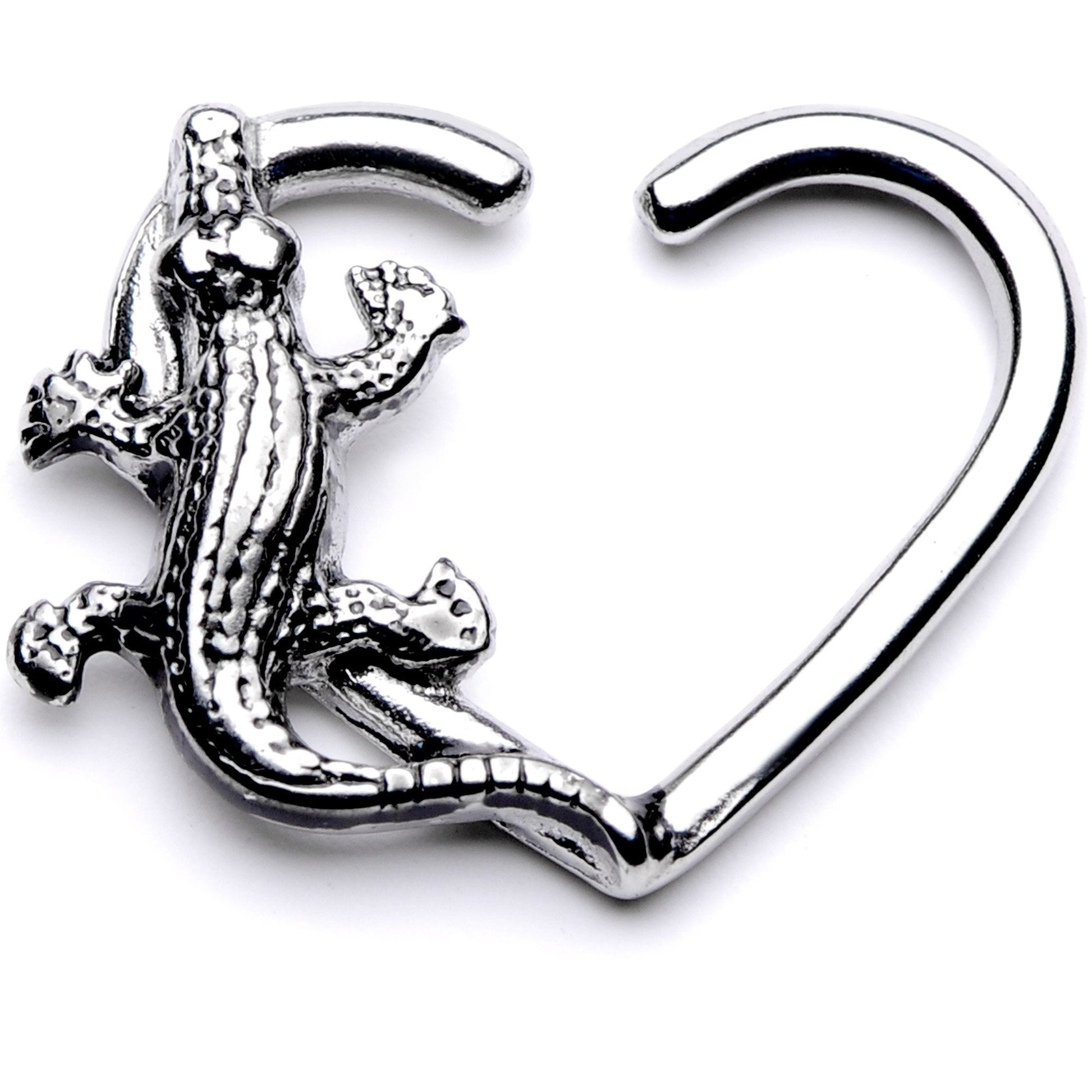This gator looks fierce but he won't bite. This heart-shaped closure ring is decorated with a slithering gator on one side. Designed to be worn in the right ear, this beautiful heart-shaped ring is made with durable 316L surgical grade stainless steel. To use, twist the ends slightly and gently pull away to insert into your piercing. This cartilage earring is perfect for wearing in a variety of ear piercings including the helix, tragus, rook, and daith!Specifications