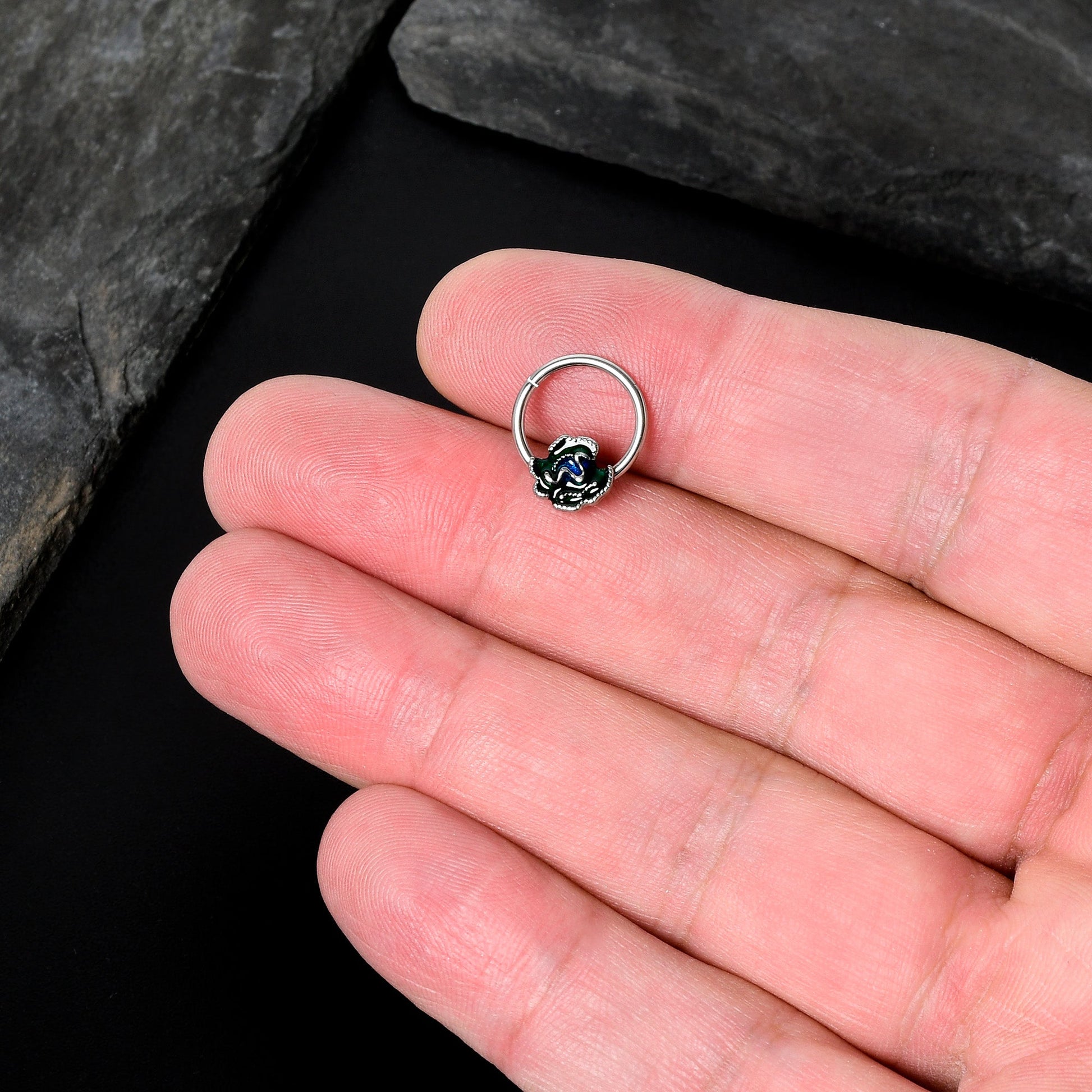 It's always springtime when you're rocking this 16 gauge septum ring! It's made with a 10mm durable 316L surgical grade stainless steel hinged circular ring. It features a multi-dimensional flower charm, embellished with green and blue. It also features a non-removable, hinged segment that makes insertion and removal a breeze and you can even wear it in multiple piercings including tragus, helix, and some daith piercings. Let the flowers bloom with this floral cartilage piercing jewelry!Specifications