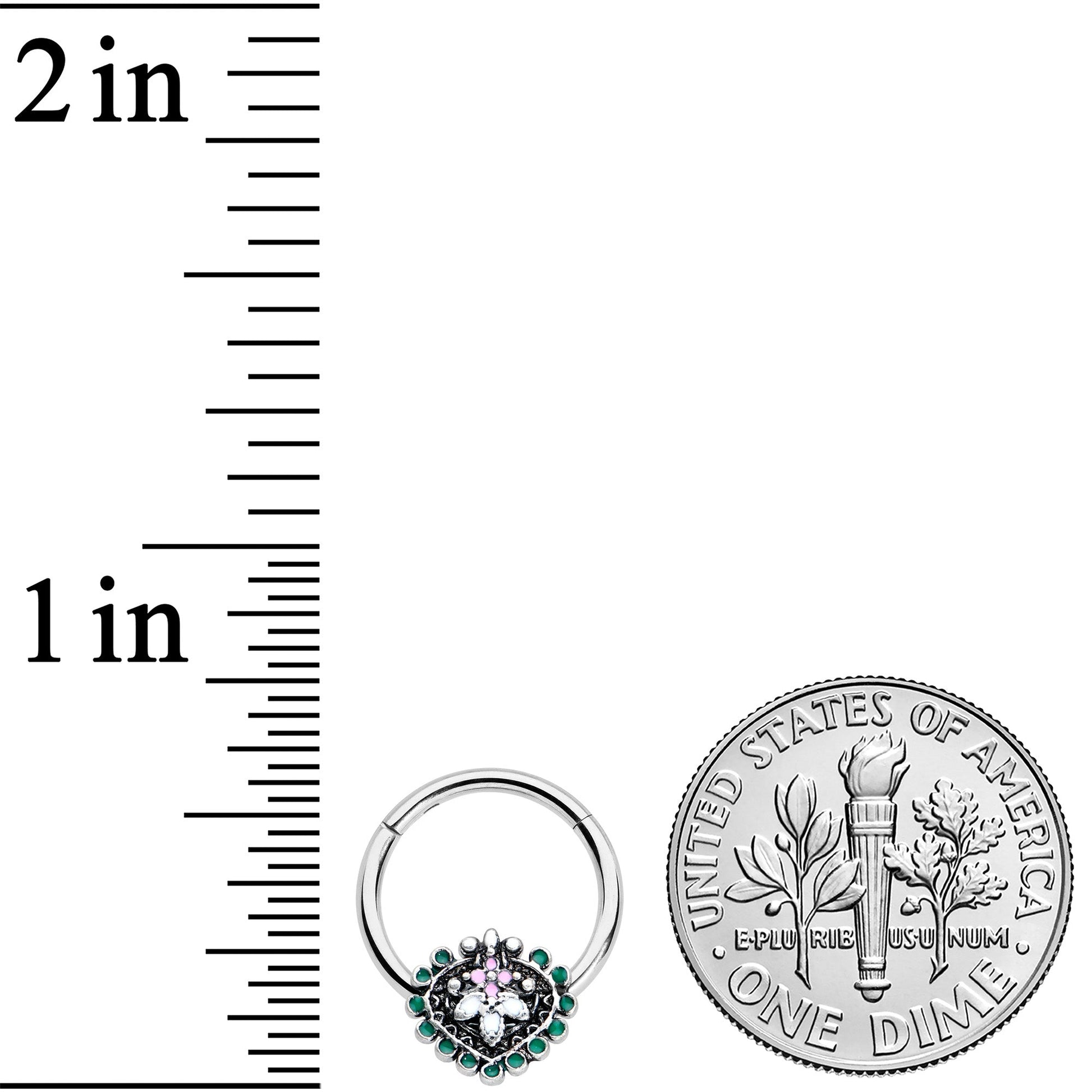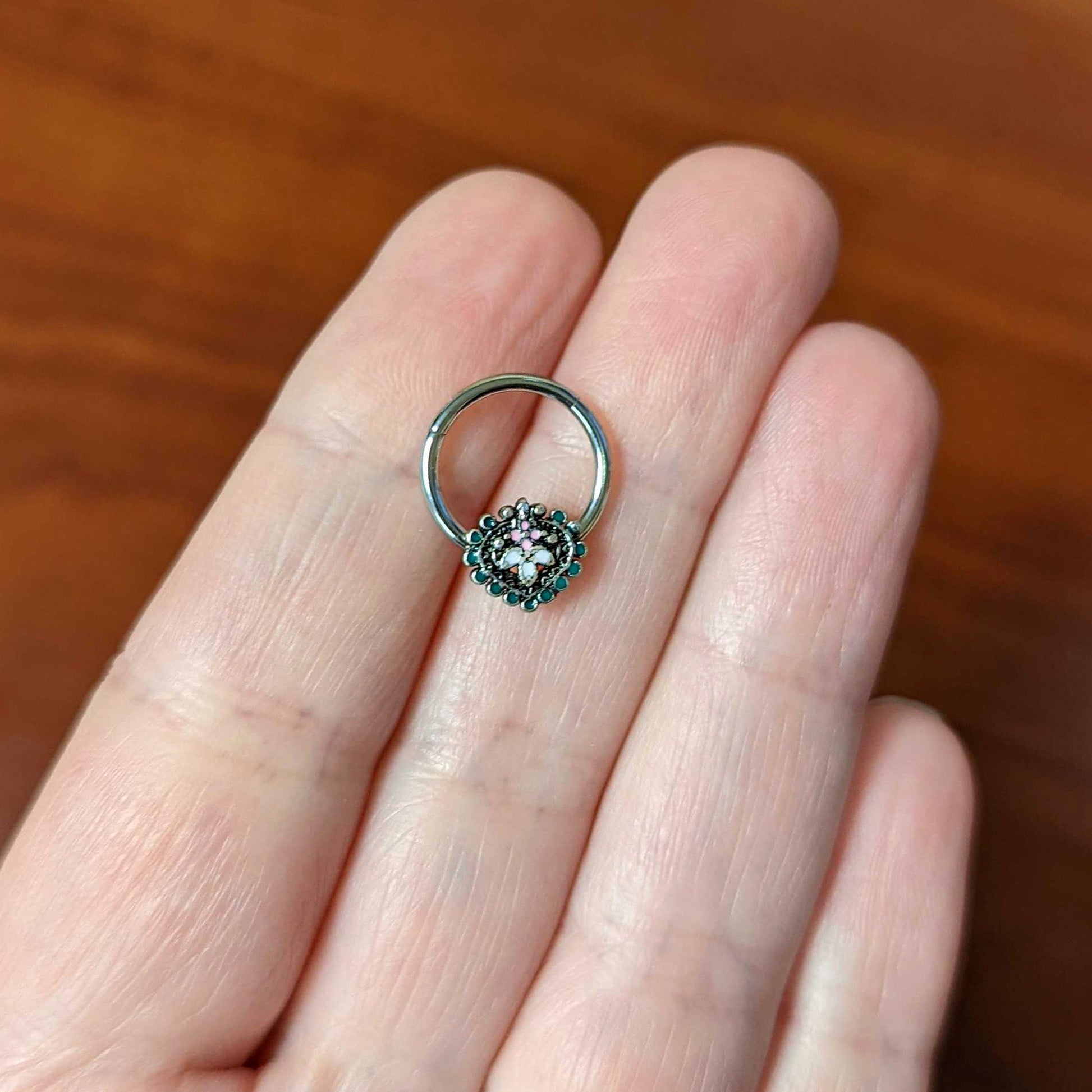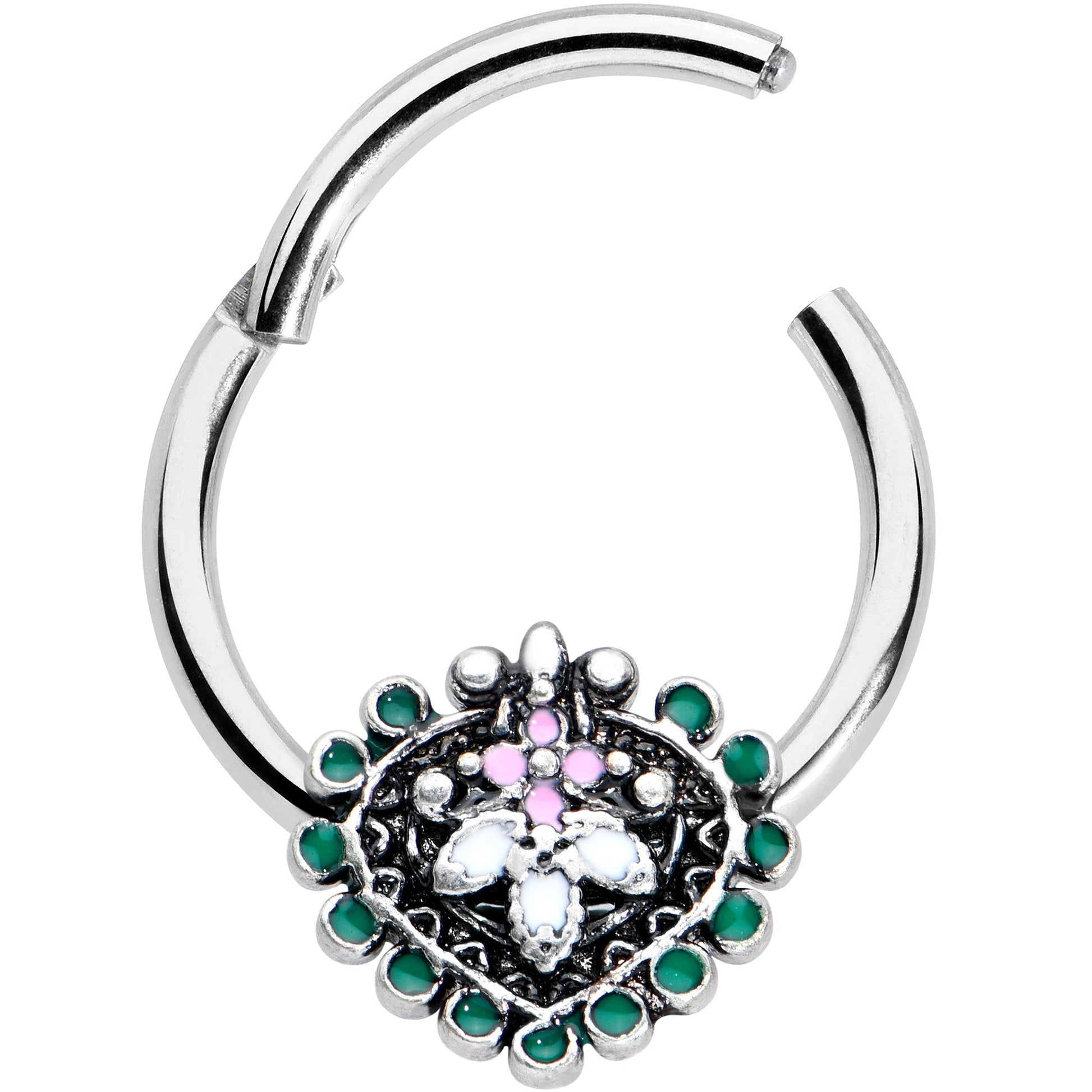 Stylize your look with this 16 gauge septum ring! It's made with a 10mm durable 316L surgical grade stainless steel hinged circular ring. It features a leaf charm composed of colorful ovals. The central ovals are set with white and pink inlay and the whole charm is surrounded by green embellishment. It's further embellished with textured detailing, burnished to make all the details pop. It also features a non-removable, hinged segment that makes insertion and removal a breeze and you can rock it in multiple piercings including tragus, helix, and some daith piercings. Add some abstract style to your look with this elegant, opulent cartilage piercing ring.Specifications