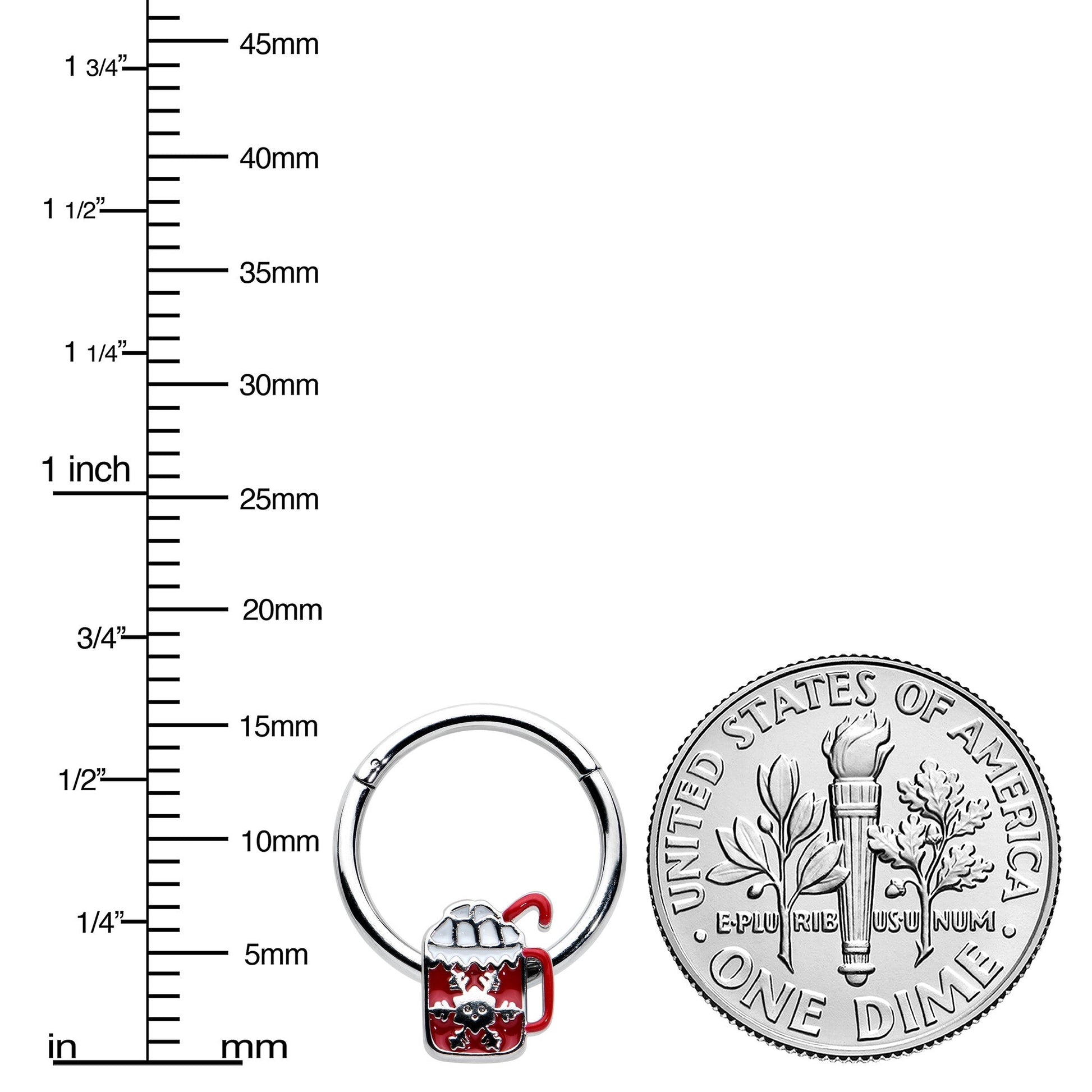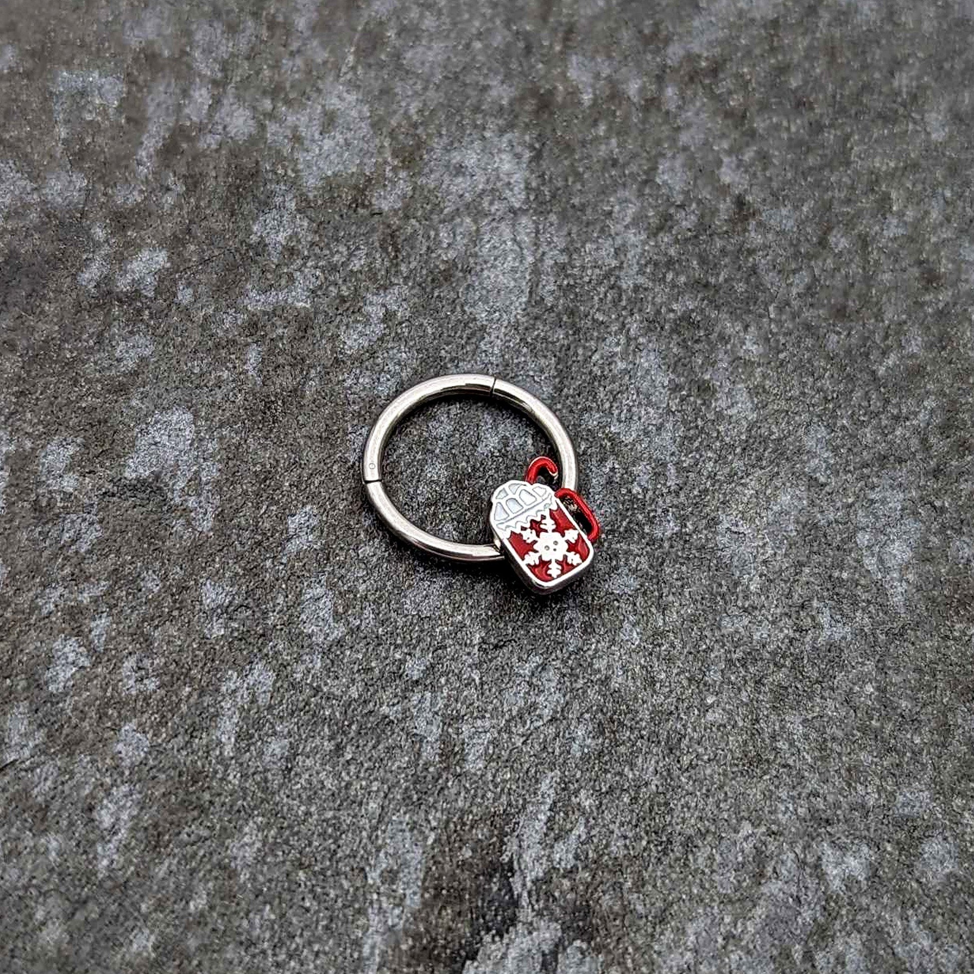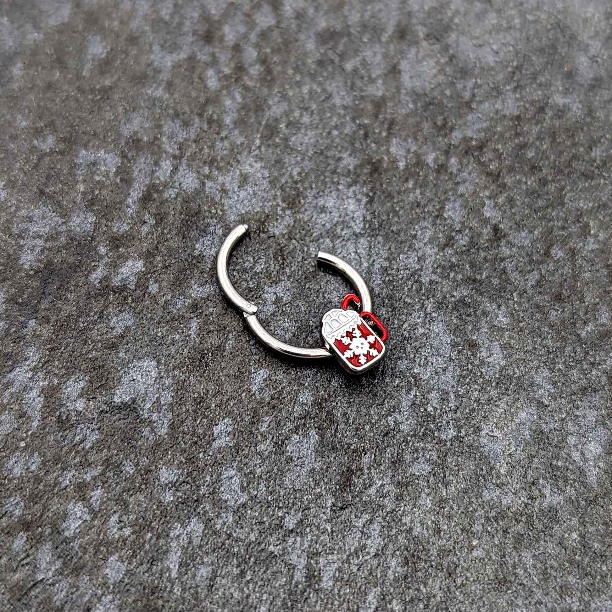 This 16 gauge septum ring will keep you looking sweet and feeling warm at heart for the holiday season! It's made with a 10mm durable 316L surgical grade stainless steel hinged circular ring. It features a mug of cocoa charm, inlaid in red. It also features a marshmallow top and a candy cane embellishment for a truly festive feel. It even features a non-removable, hinged segment that makes insertion and removal a breeze and you can rock it in multiple piercings including tragus, helix, and some daith piercings. Get a look that's as sweet and as hot as you could want with this charming cocoa cartilage jewelry!Specifications