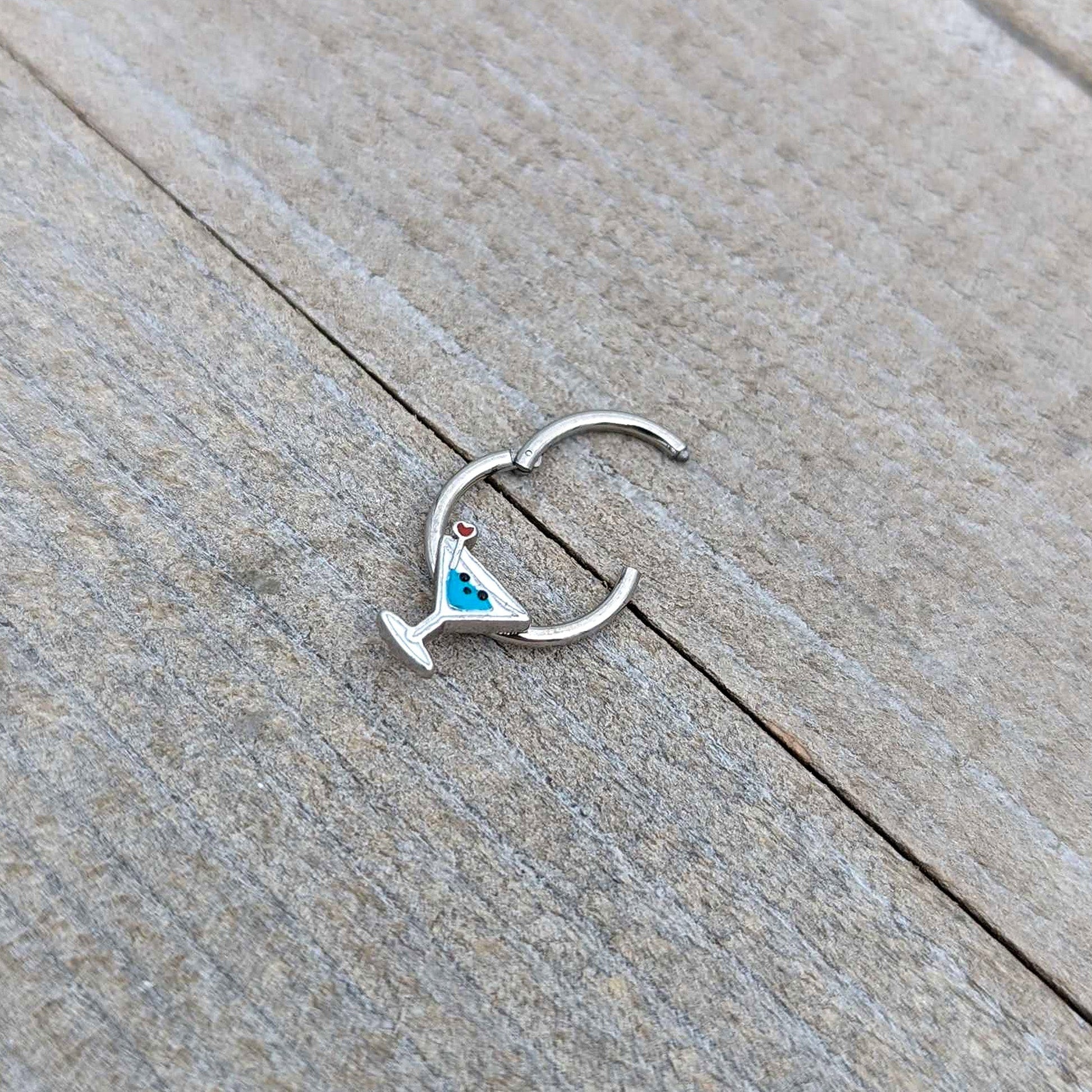 Bottoms up for style, with this 16 gauge septum ring! It's made with a 10mm durable 316L surgical grade stainless steel hinged circular ring. It features a martini glass charm, with blue embellishment and a heart-ended swizzle stick. It also features a face on the glass and a non-removable, hinged segment that makes insertion and removal a breeze. You can even rock it in multiple piercings including tragus, helix, and some daith piercings. Drink in the compliments when you're rocking this cocktail-themed cartilage piercing jewelry!Specifications