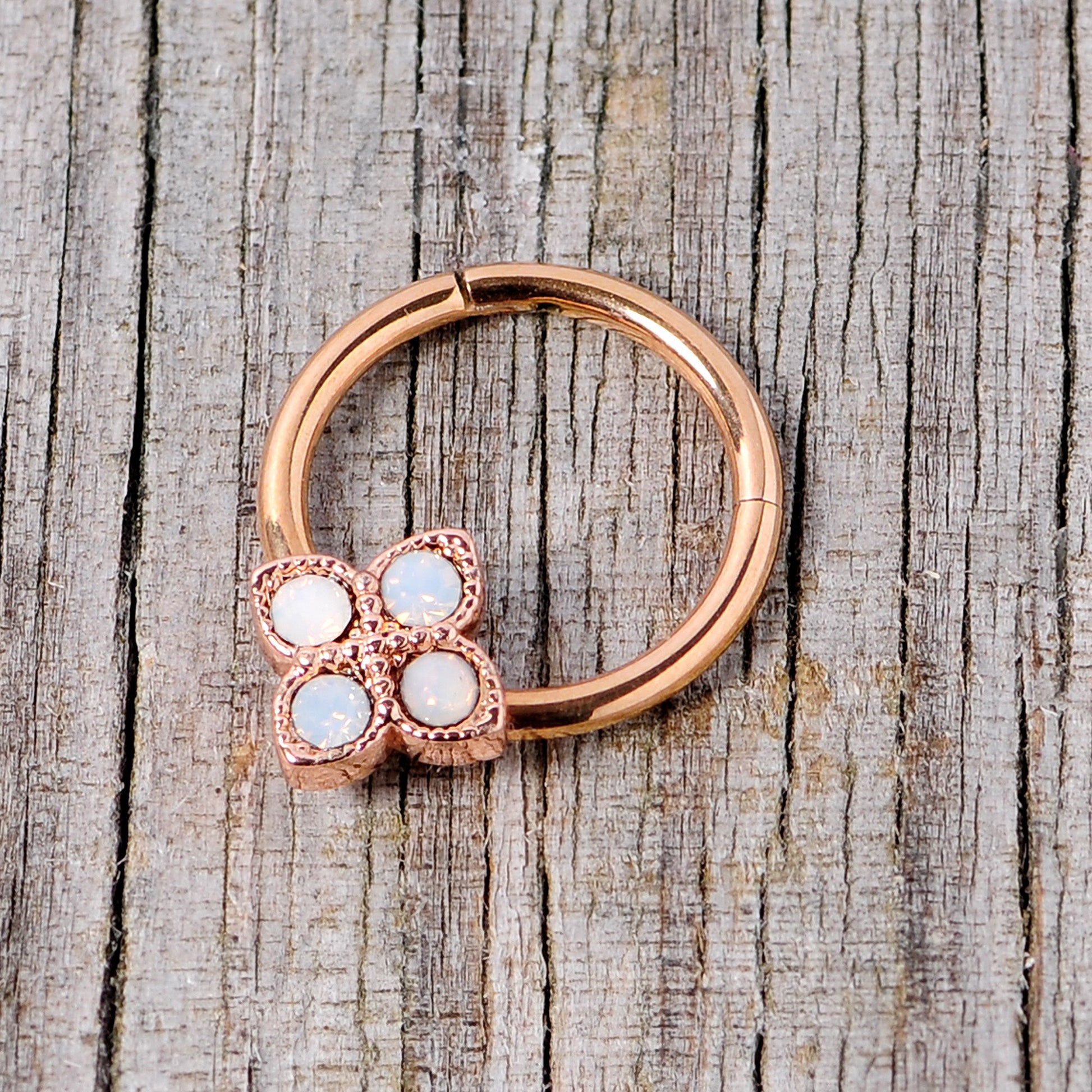 This aristocratic 16 gauge cartilage earring looks like it came straight out of the Renaissance to adorn your piercing! It's made with a 10mm rose gold PVD over 316L surgical grade stainless steel hinged circular ring. It features a rhombus-shaped charm set with white faux opals, which form the shape of a cross. This septum clicker also features a non-removable hinged segment that makes it super easy to insert and remove. You'll love that because this ring works well in multiple piercings including cartilage piercings like the tragus, septum, daith, and more, as well as your septum piercing. Let the modern world fall away with this Renaissance-inspired cartilage jewelry!Specifications