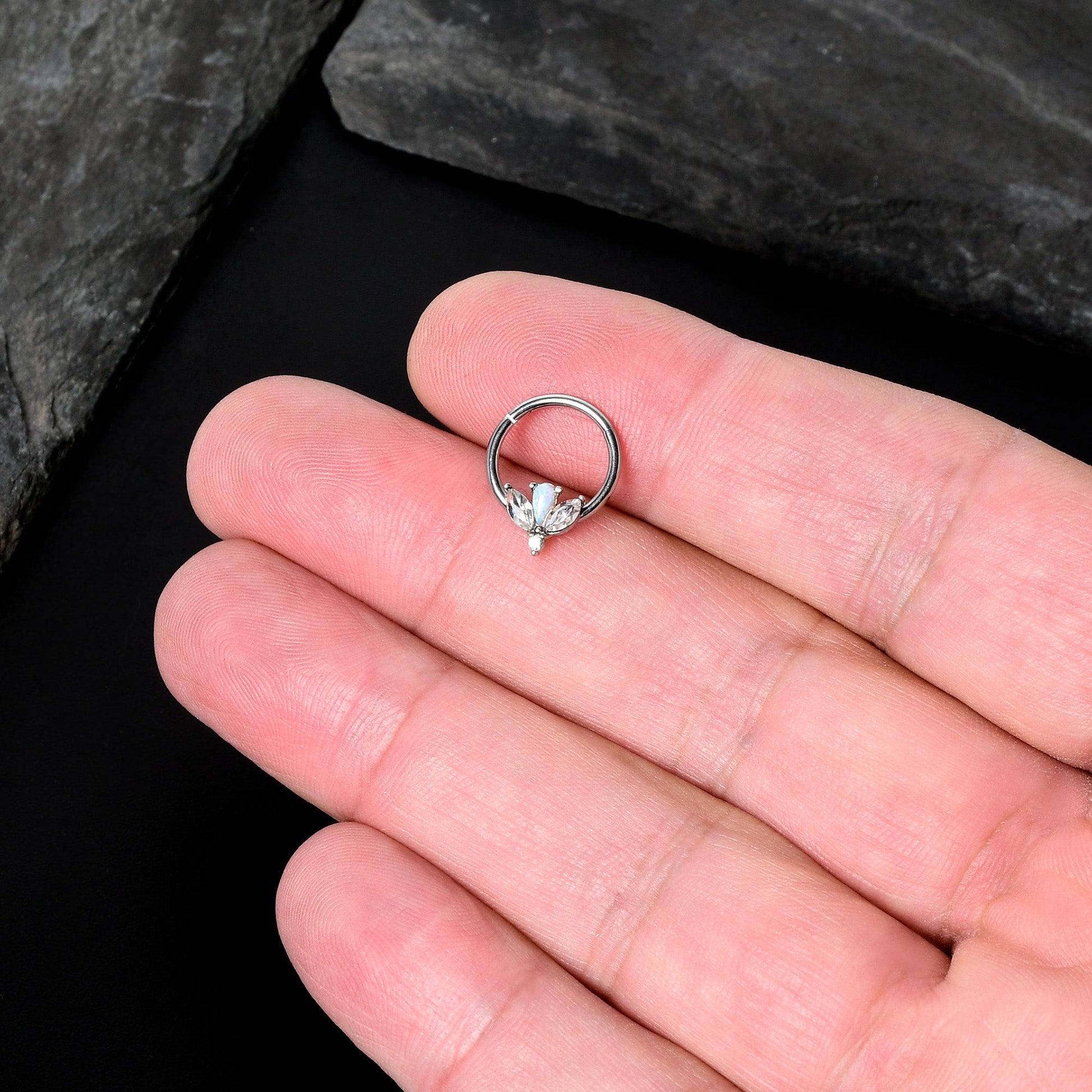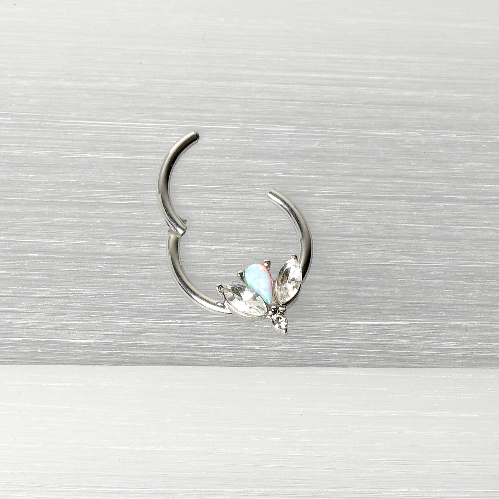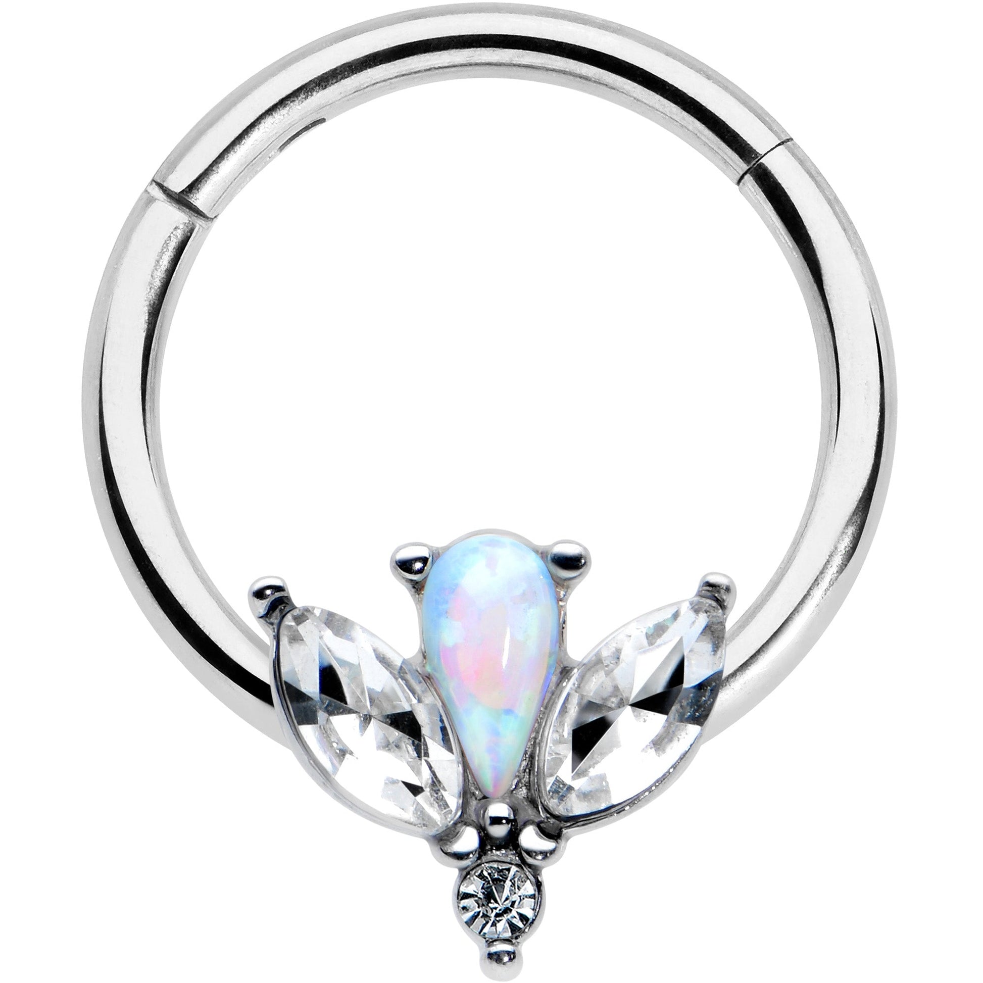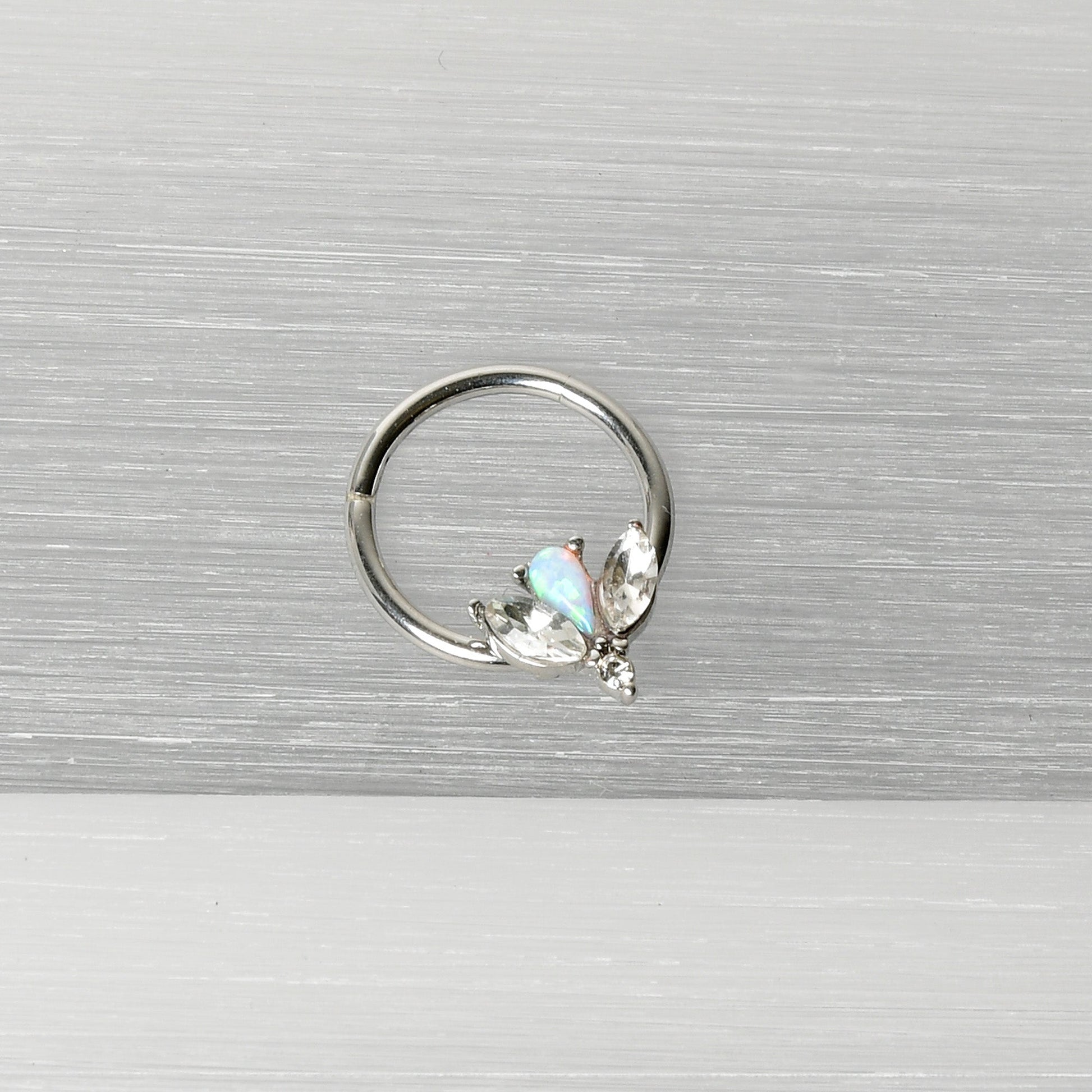 With lovely color and style, you can't help but love this 16 gauge septum ring! It's made with a 10mm durable 316L surgical grade stainless steel hinged circular ring. It features a flower charm, the leaves set with small clear gems and the blossom composed of a white faux opal. It also features a non-removable, hinged segment that makes insertion and removal a breeze and you can rock it in multiple piercings including tragus, helix, and some daith piercings. Keep it simple while keeping it stylish with this fabulous flower cartilage piercing ring!Specifications