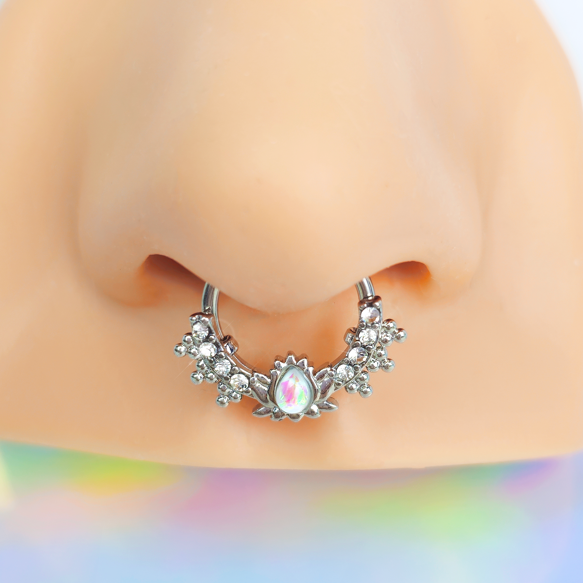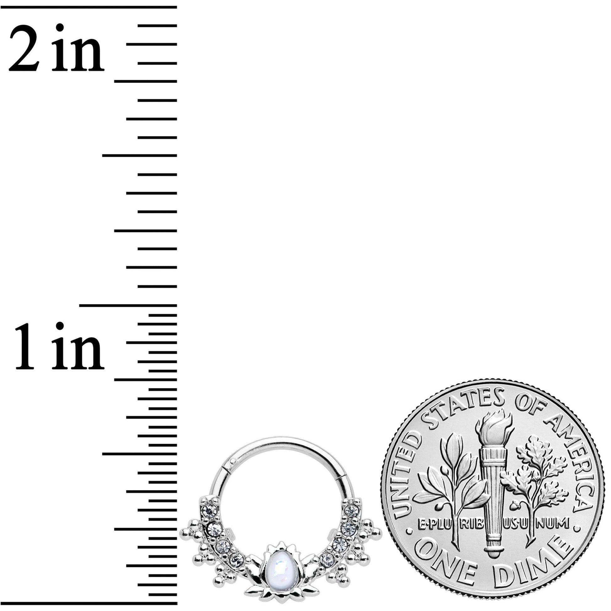 This 16 gauge septum ring is practically oozing with style! It's made with a 10mm durable 316L surgical grade stainless steel hinged circular ring. It features a bottom curved that's paved with clear gems and embellished with and tiny orb-shaped ornaments. At the center is a lotus flower shape, set at the middle with a white faux opal for an added punch of style. It also features a hinged, non-removable segment that makes insertion and removal a breeze. And you can rock this cartilage jewelry in multiple piercings including helix, tragus, and septum piercings! Let this lotus add style and color to your cartilage piercings with this luscious lotus tragus ring!Specifications