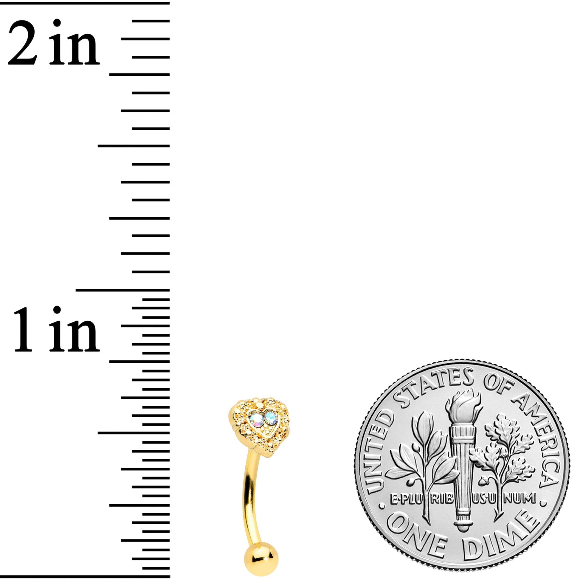 Look luxe without breaking the bank with this 16 gauge cartilage jewelry! It's made with an 8mm gold tone PVD over 316L surgical grade stainless steel curved barbell with a 3mm bottom ball end. The top end features a heart charm, with ornate textured detailing and a pair of aurora gems at the center. You can even rock this Valentine in multiple piercings including tragus, eyebrow, and rook piercings. You're going to fall in love with the baroque look of this heart-themed eyebrow piercing ring!Specifications
