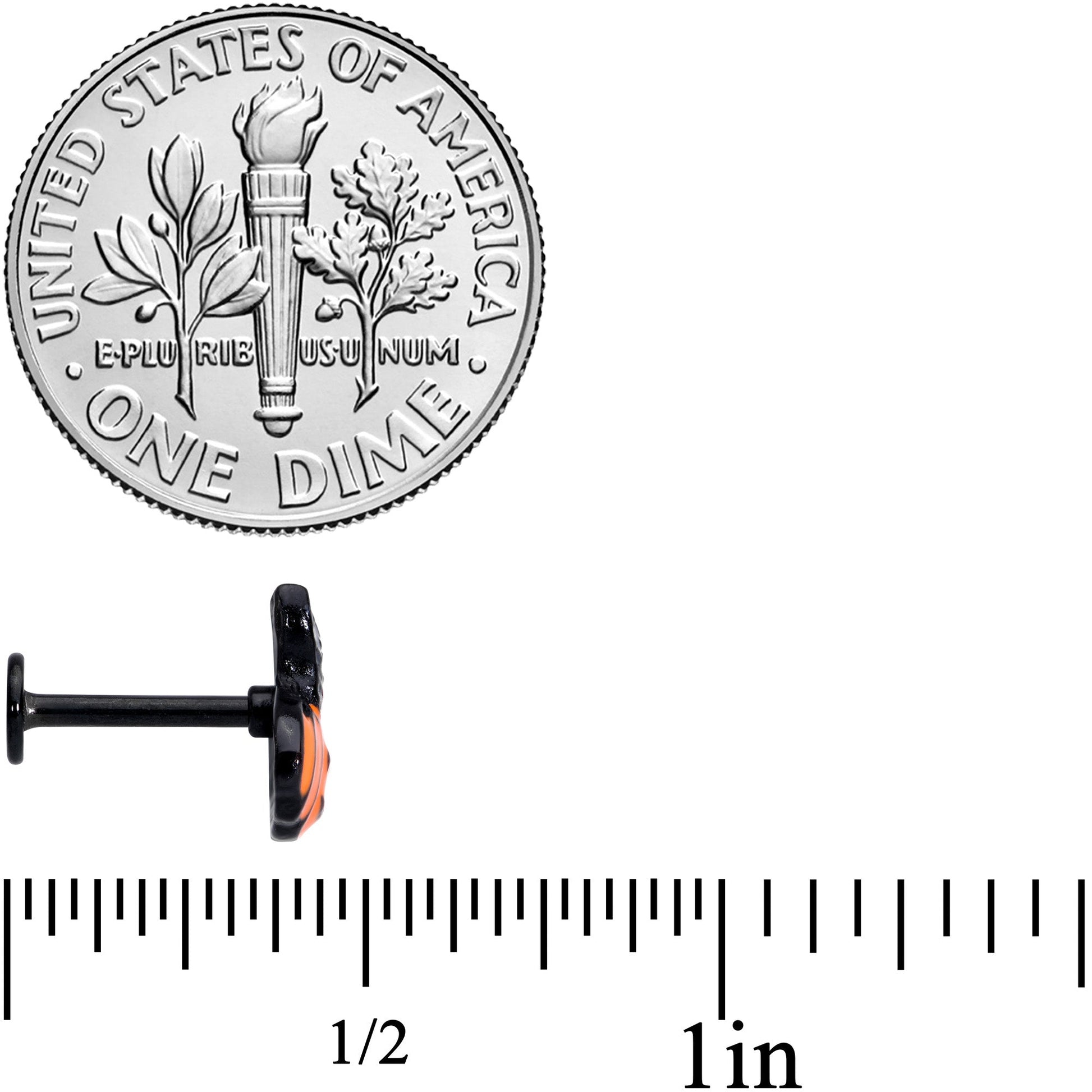 Don't worry about watching out for black cats this Halloween when you wear this 16 gauge lip ring; you'll be wearing one all the time! It's made with an 8mm black PVD over 316L surgical grade stainless steel straight barbell with a flat disc end, this cartilage ring features a black cat charm in a jack 'o lantern that will be a spooky surprise for anyone you meet! It works wonderfully in multiple piercings including lip, monroe, tragus, helix, and some conch piercings. Easy wear, multiple options, an adorable design....the best kind of surprises!Specifications