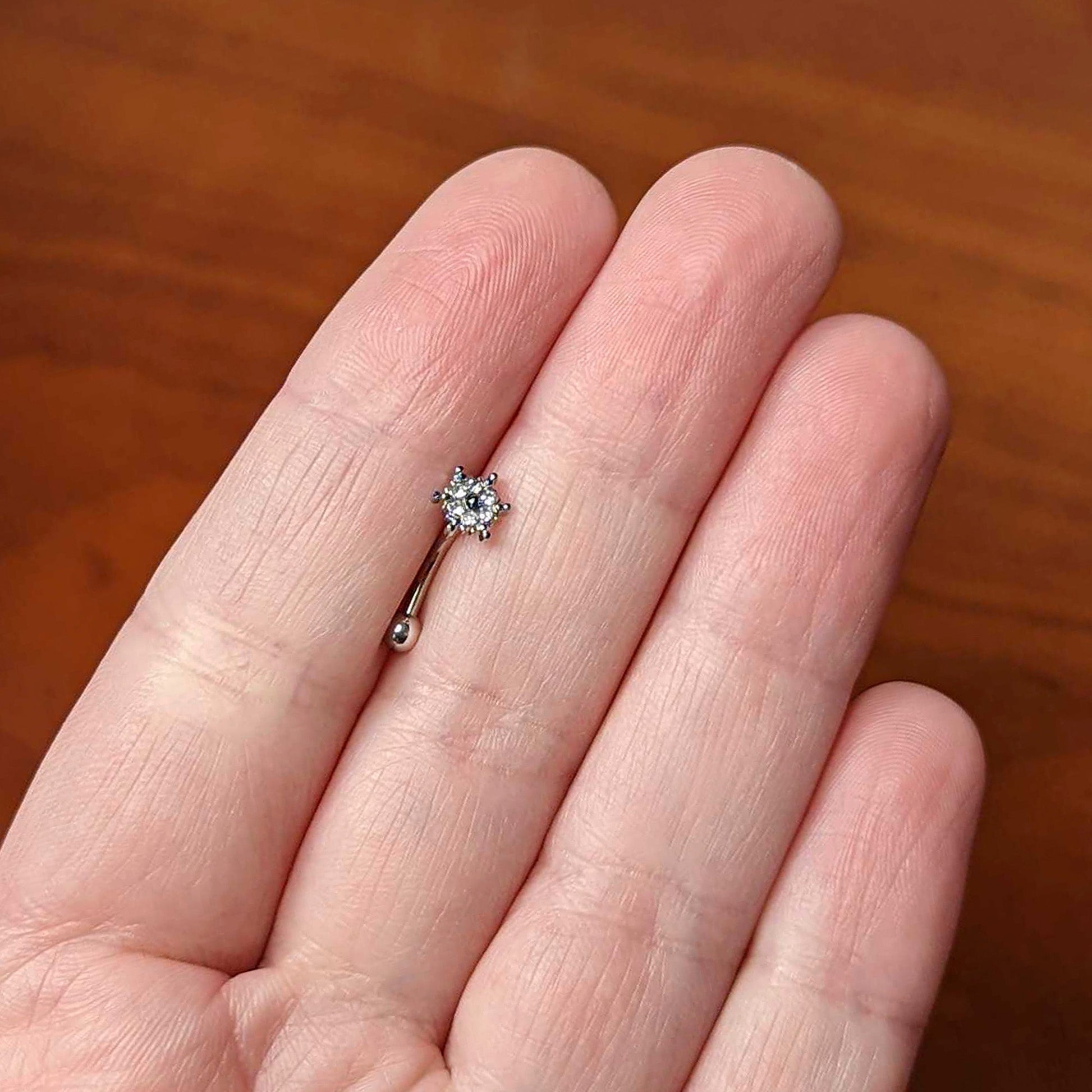 The snowflake on this 16 gauge eyebrow jewelry is one that you'll never let melt away from you whether it's Christmas or not! It's made with an 8mm durable 316L surgical grade stainless steel curved barbell with a 3mm bottom ball end. The top end features an intricate snowflake charm set with clear gems as well as a deep blue gem at its center for a luscious touch of color you'll totally fall for! You can even rock this ring in multiple piercings including eyebrow, tragus, and rook! This winter, let the snow spruce up your cartilage piercing with this sweet and sumptuous eyebrow piercing ring!Specifications
