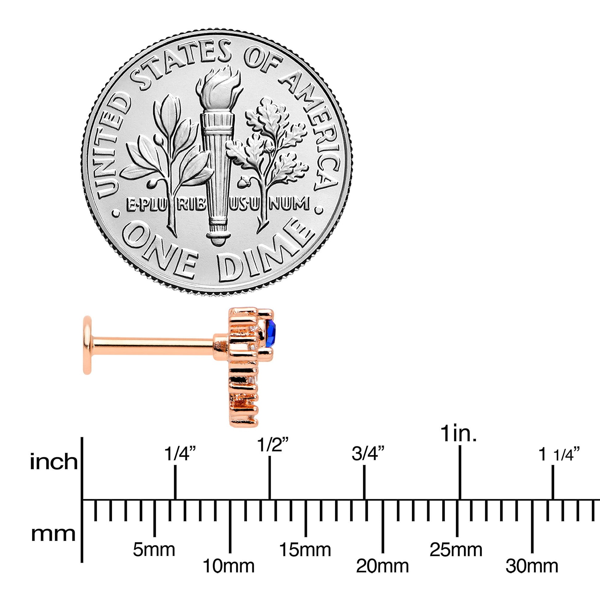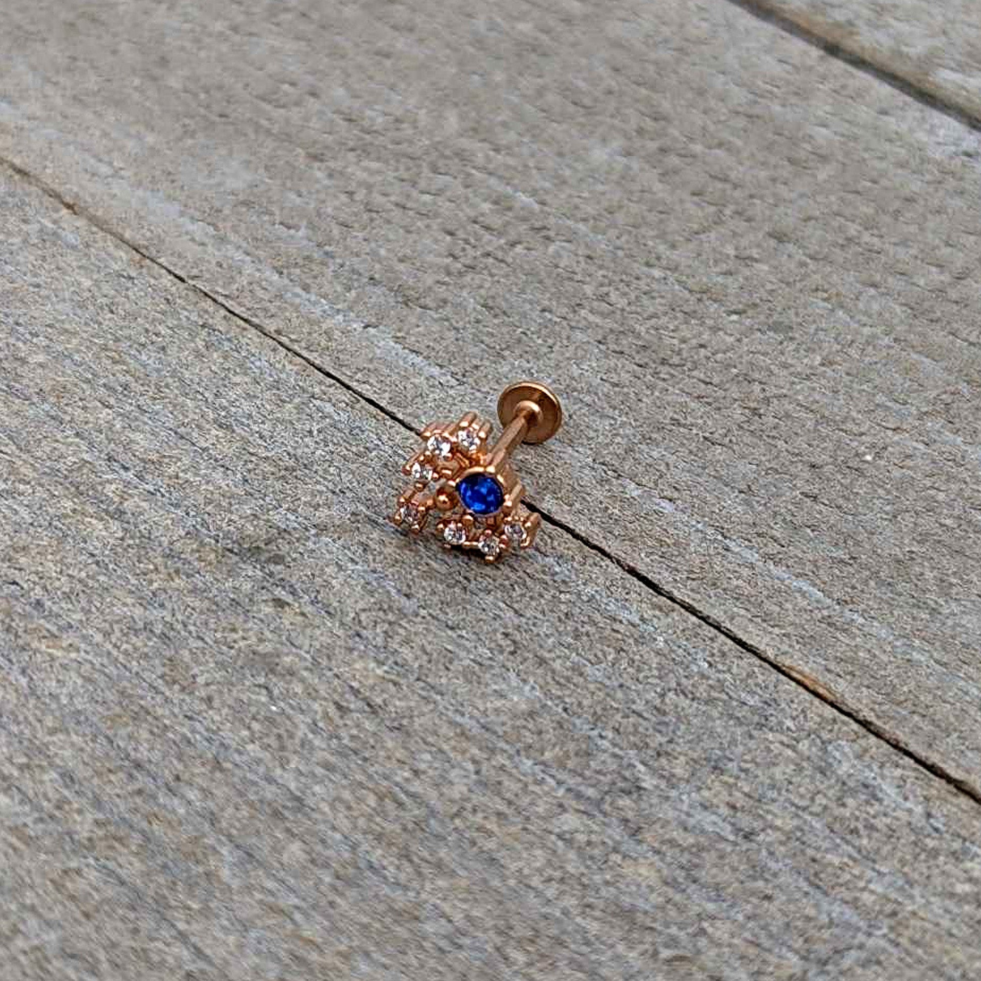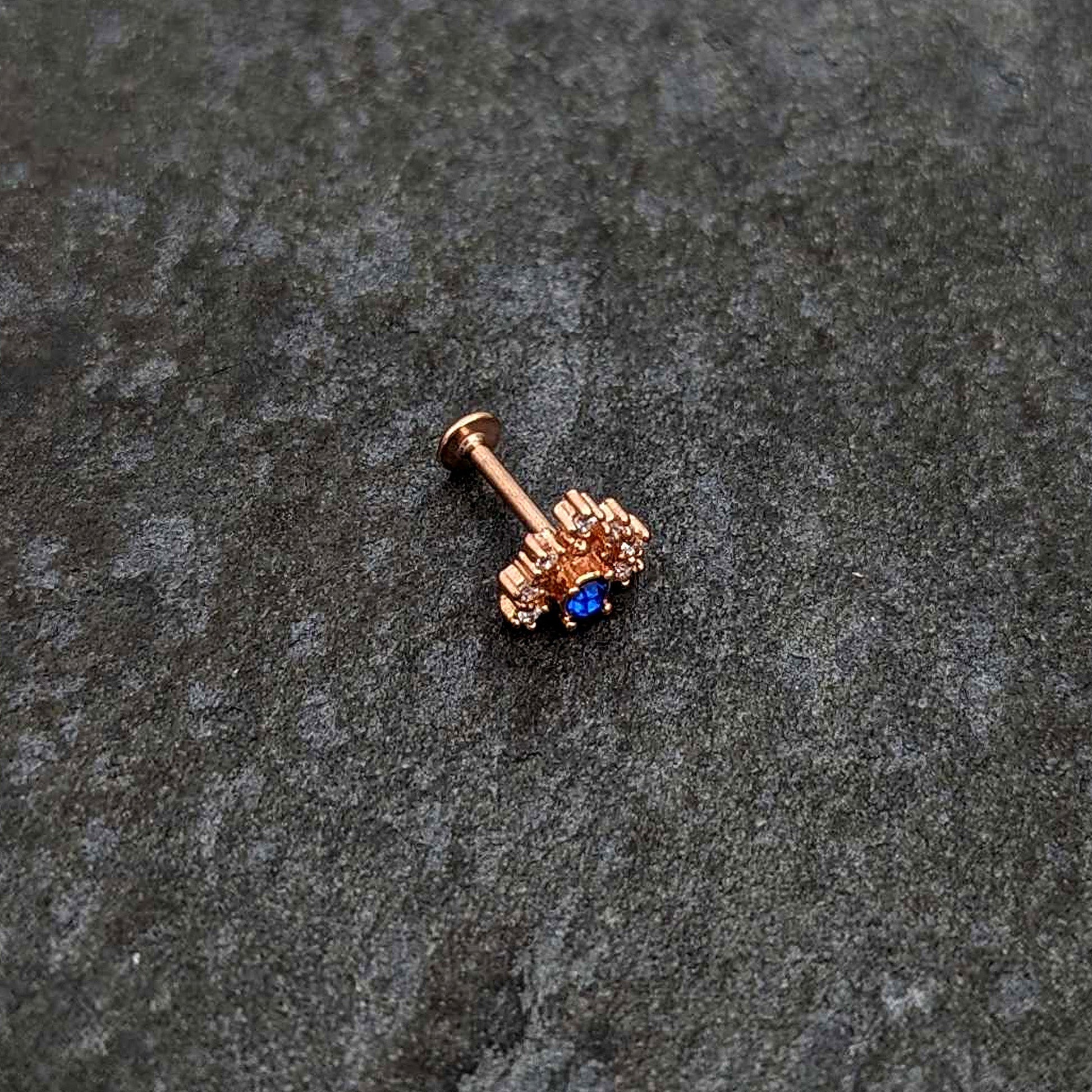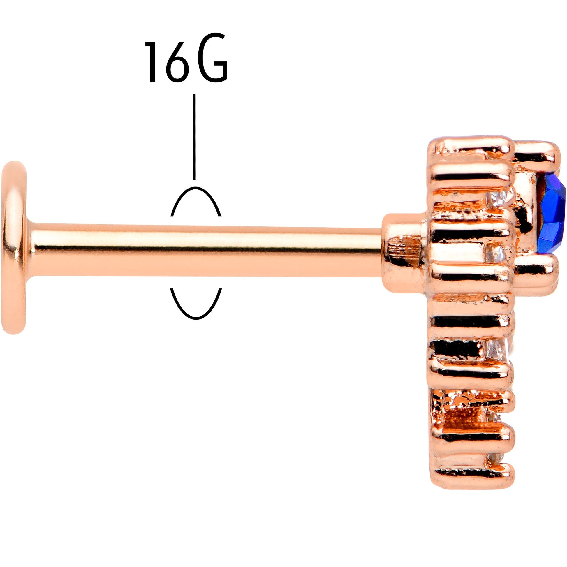 The flare on this 16 gauge lip ring is going to add a ton of flair to your look! It's made with an 8mm rose gold tone PVD over 316L surgical grade stainless steel straight post with a flat disc end. It features a blue gem charm, surrounded by rays tipped with clear gem ends for a firey look! You can even rock it in multiple piercings including lip, monroe, tragus, helix, and some conch piercings. You'll be enjoying a fashion flareup when you're rocking this colorful cartilage piercing ring!Specifications