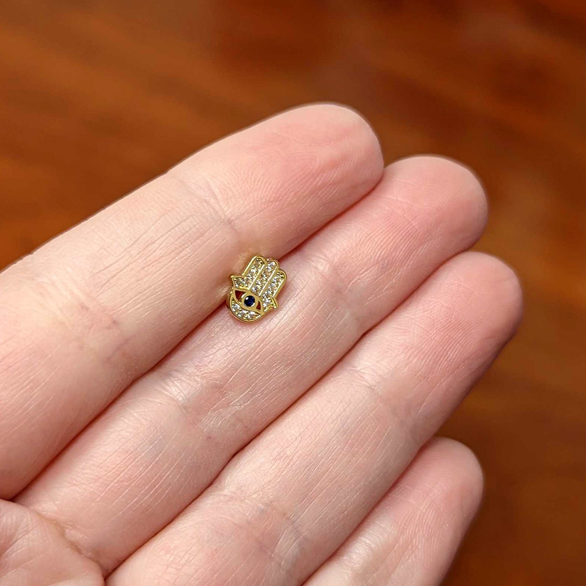 Protect yourself against evil auras with this 16 gauge cosmic Hamsa hand lip ring. It's made with an 8mm gold tone plated over 316L surgical grade stainless steel straight barbell with a flat disc end. It features a blue gem eye in the palm of the Hamsa hand, which is paved with clear gems. You can even rock it in multiple piercings including lip, monroe, tragus, helix, and some conch piercings. Keep the bad vibes away while looking amazing with this stylish and spiritual cartilage jewelry!Specifications