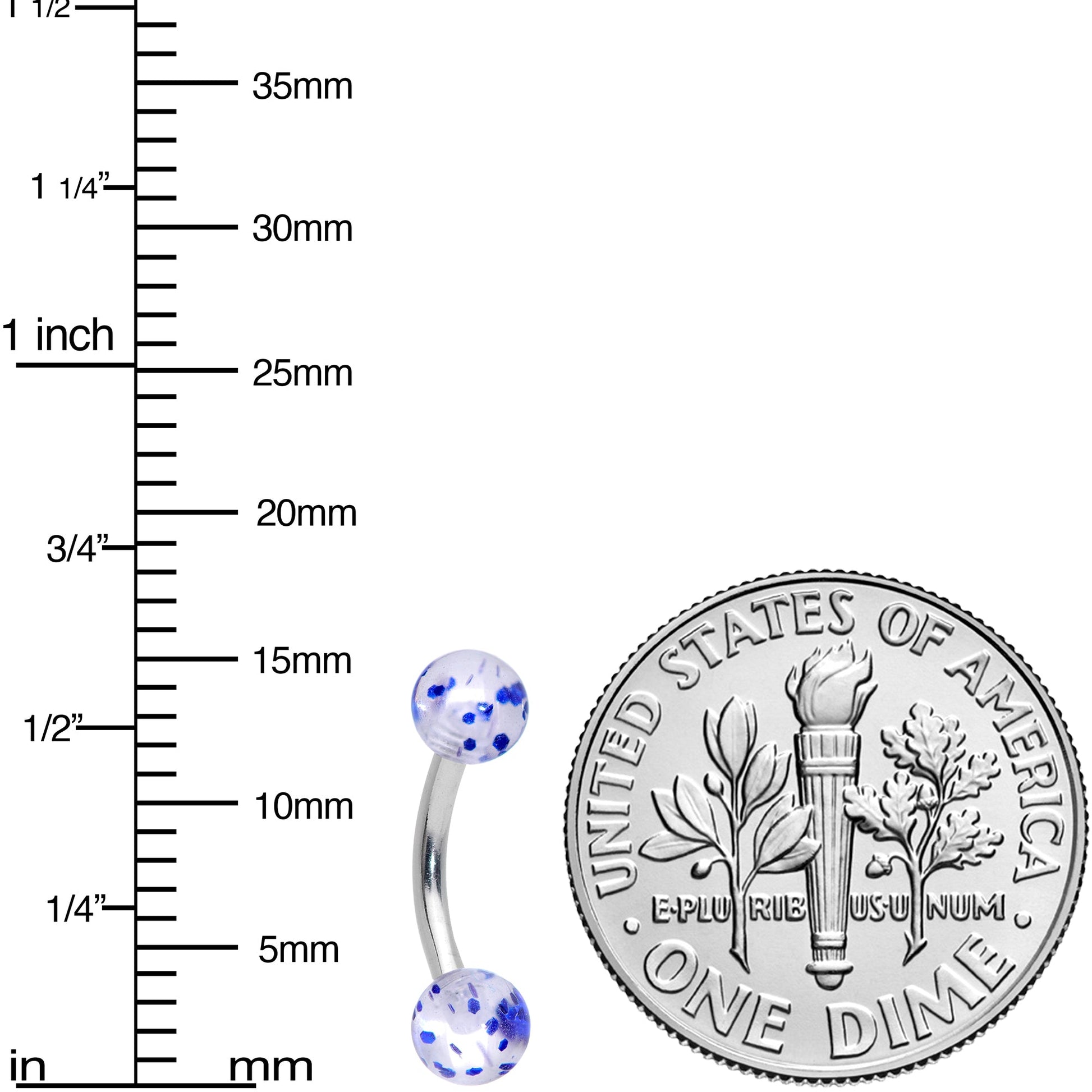 Simple can be stunning with this 16 gauge cartilage jewelry! It's made with an 8mm durable 316L surgical grade stainless steel curved barbell with 4mm ball ends. The ball ends are clear and feature blue glitter inside for a look that turns basic to beautiful! You can wear this in multiple piercings including eyebrow, rook, and tragus too! Keep it basic without looking boring with this charming curved eyebrow ring!Specifications