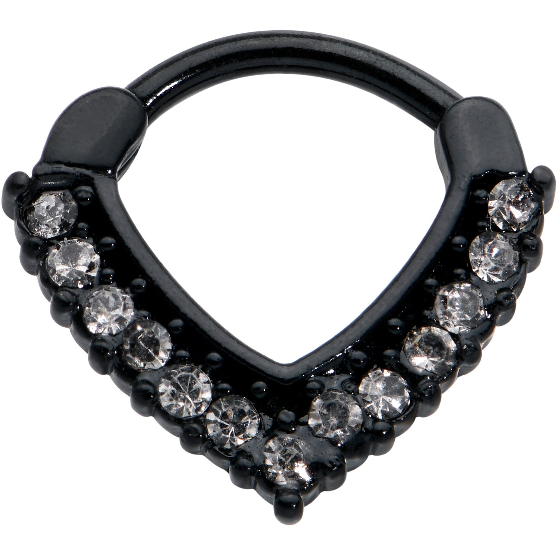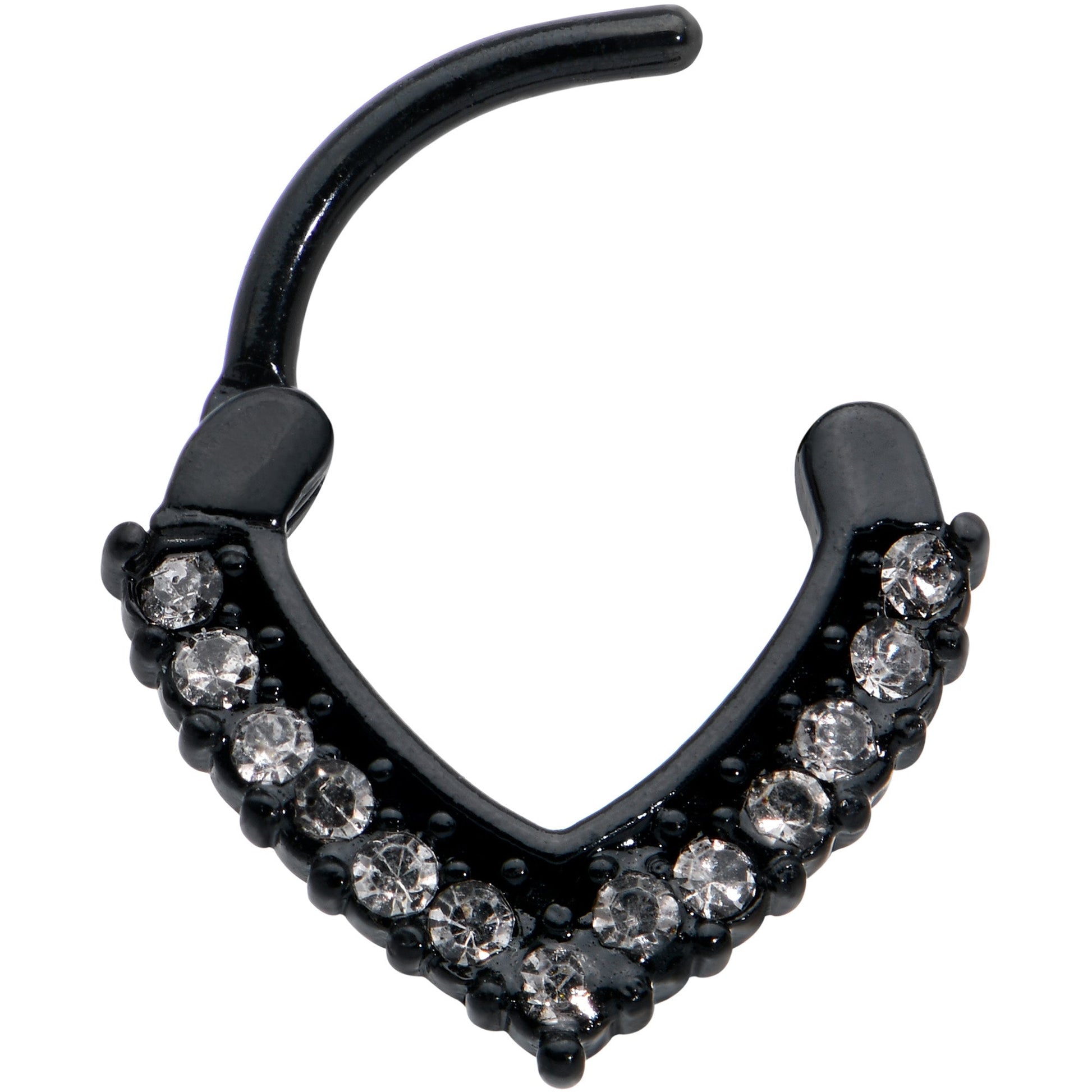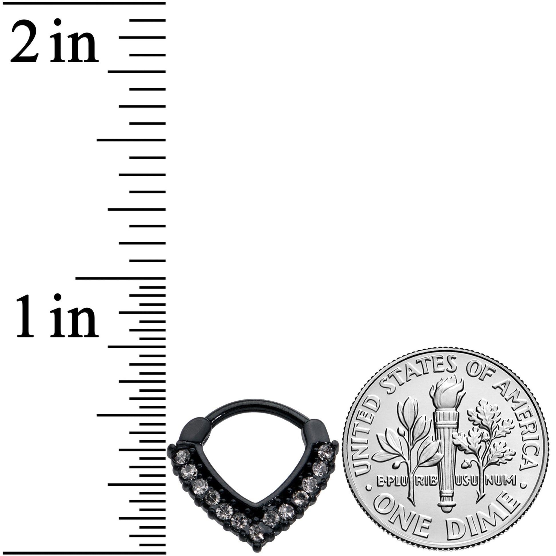 The vee on this 16 gauge cartilage jewelry will have you saying va-va-voom! It's made with an 8mm black PVD over 316L surgical grade stainless steel hinged curved barbell and features a chevron shape on the bottom curve, inlaid with clear cubic zirconia gems. The overall look is ultra luxe and stylish. It also features a clicker design that makes insertion and removal a snap. And you rock this tragus ring in multiple piercings including helix, tragus, and daith. Between the high-fashion quality and high-fashion look, this cartilage ring has everything you need!Specifications