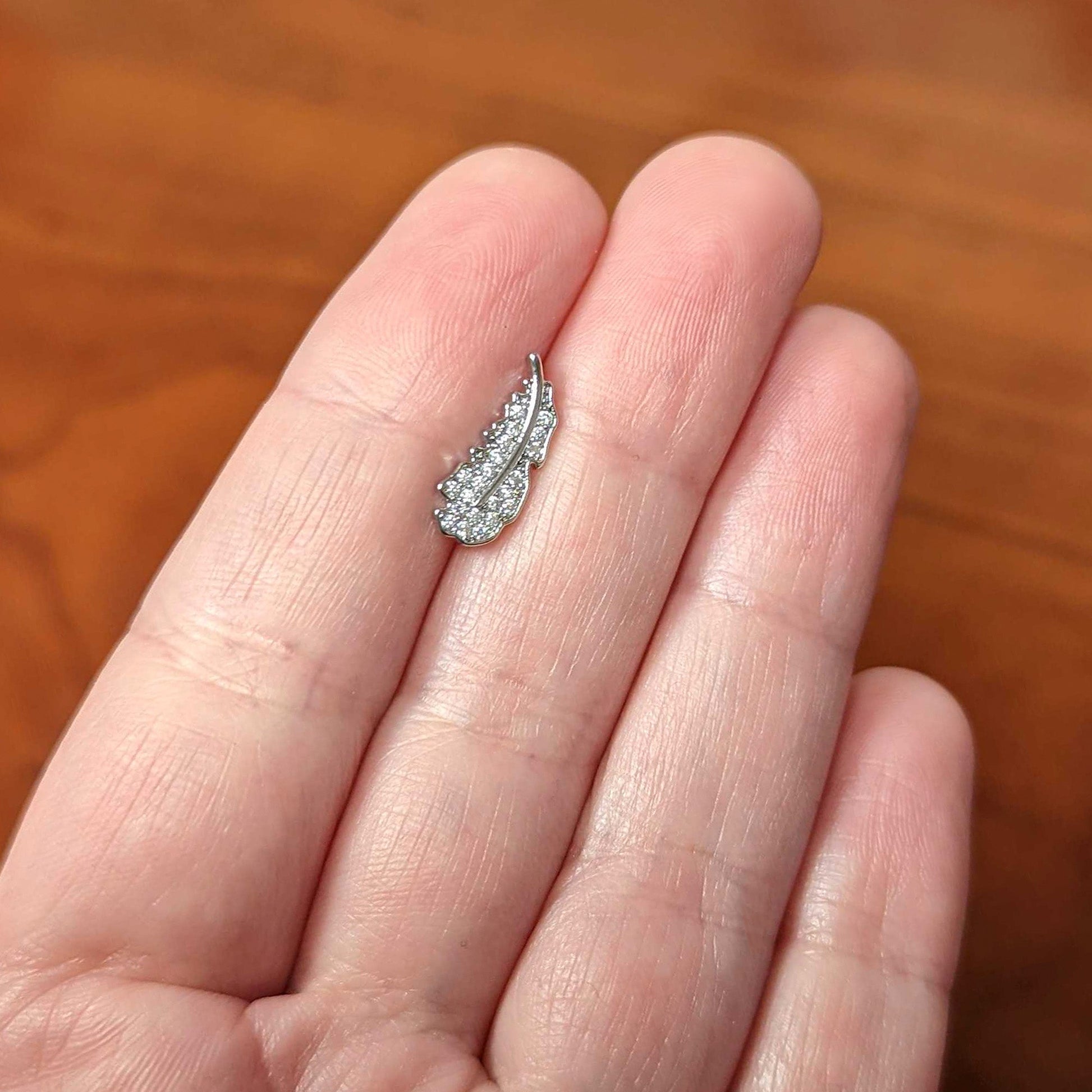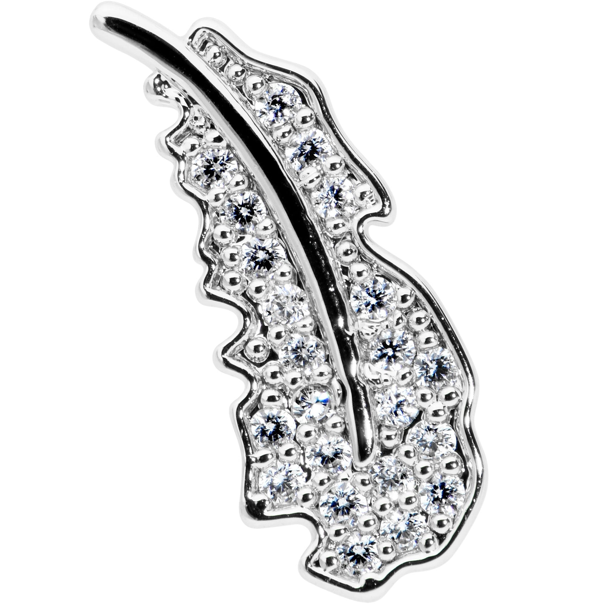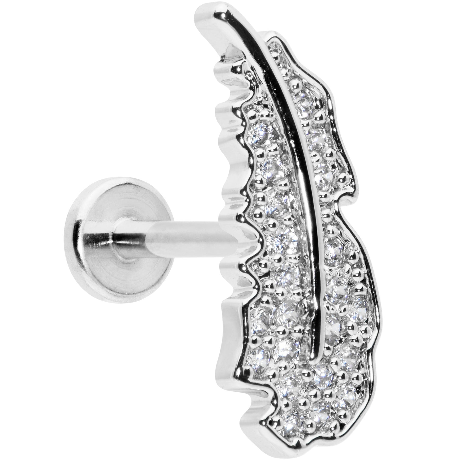 Get a look that makes your heart soar like on this 16 gauge lip ring! It's made with an 8mm durable 316L surgical grade stainless steel straight barbell with a flat disc end. It features a feather charm, with raised central detailing. It's paved in clear cubic zirconia gems for an opulent look that's not going to weigh you down. It's also internally threaded for comfort and ease during insertion and removal and you can rock it in multiple piercings including lip, monroe, tragus, helix, and some conch piercings. Let your piercings soar on wings of style with this fabulous feather cartilage jewelry.Specifications