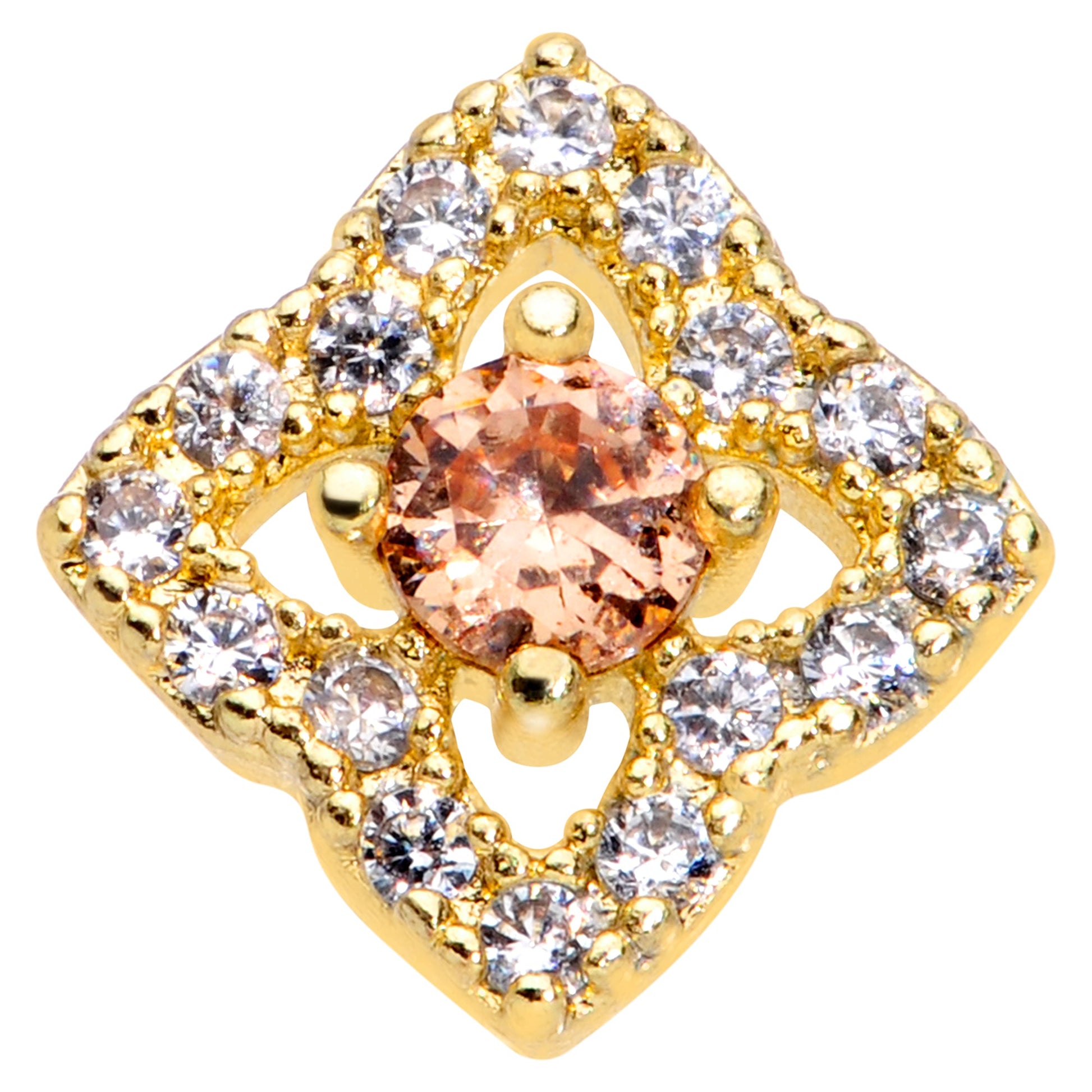 Let your cartilage piercing feel like royalty with this 16 gauge lip ring! It's made with an 8mm gold tone PVD over 316L surgical grade stainless steel straight barbell with a flat disc end. It features a rhombus-shaped charm completely paved with clear cubic zirconia gems and embellished with an open center. Set in the center in a large smoky yellow gem for a look that's rich and cohesive. You can rock this rhombus in multiple piercings including lip, monroe, tragus, helix, and some conch piercings....as befits royalty! You'll be ready to take your throne with this regal rhombus cartilage jewelry!Specifications