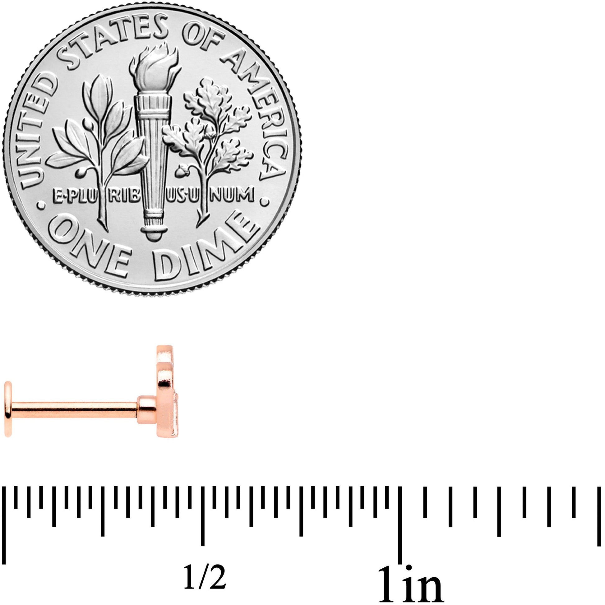 Give your cartilage piercings some butterfly wings with this 16 gauge monroe piercing! It's made with an 8mm rose gold tone PVD over 316L surgical grade stainless steel straight barbell with a flat disc end. The front features a hollow heart charm angled to one side. On the inner side of the heart is a stylized butterfly with clear cubic zirconia gems set into its wings. And of course, you can wear this beautiful butterfly in multiple piercings including your lip, monroe, and cartilage piercings including the tragus, helix, and some conch piercings. Let your love for your cartilage piercings fly this Valentine's Day like a butterfly with this elegant labret jewelry!Specifications