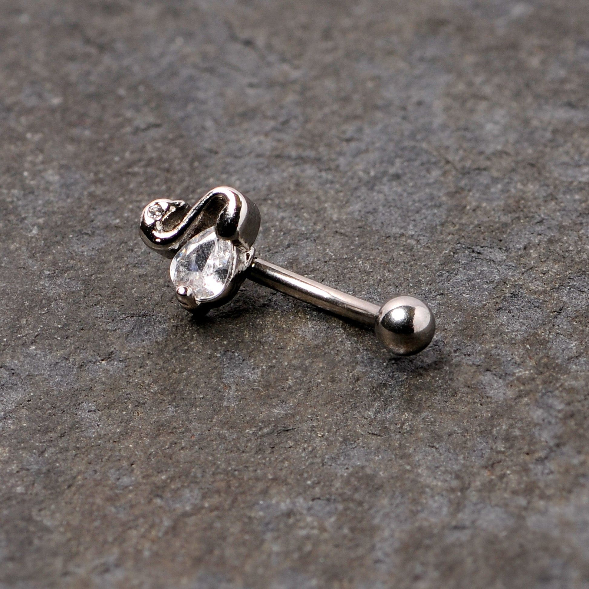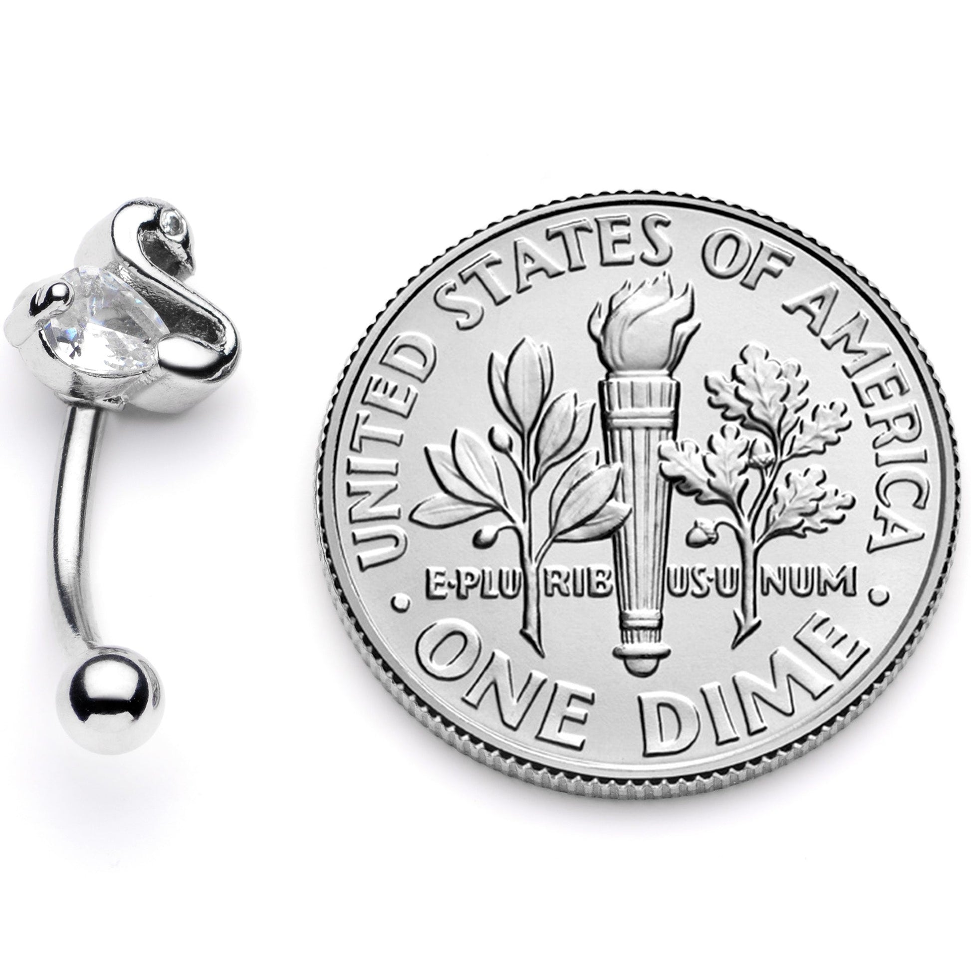Change out your ugly duckling cartilage jewelry for the stately swan on this 16 gauge cartilage ring! It's made with an 8mm durable 316L surgical grade stainless steel curved barbell with a 3mm bottom ball end. The top end features an elegantly uncomplicated swan charm with its body composed of a single clear cubic zirconia gem. This retro-inspired jewelry works well in multiple piercings including eyebrow as well as cartilage piercings like the rook, helix, daith, tragus, and more. This is one bird you won't let fly away!Specifications