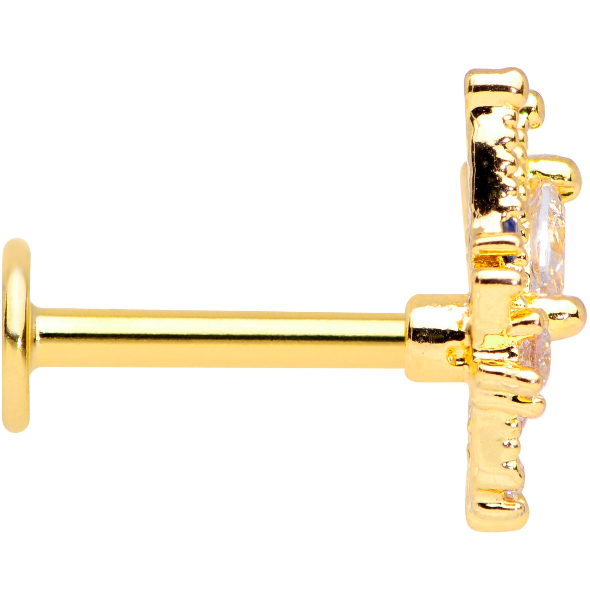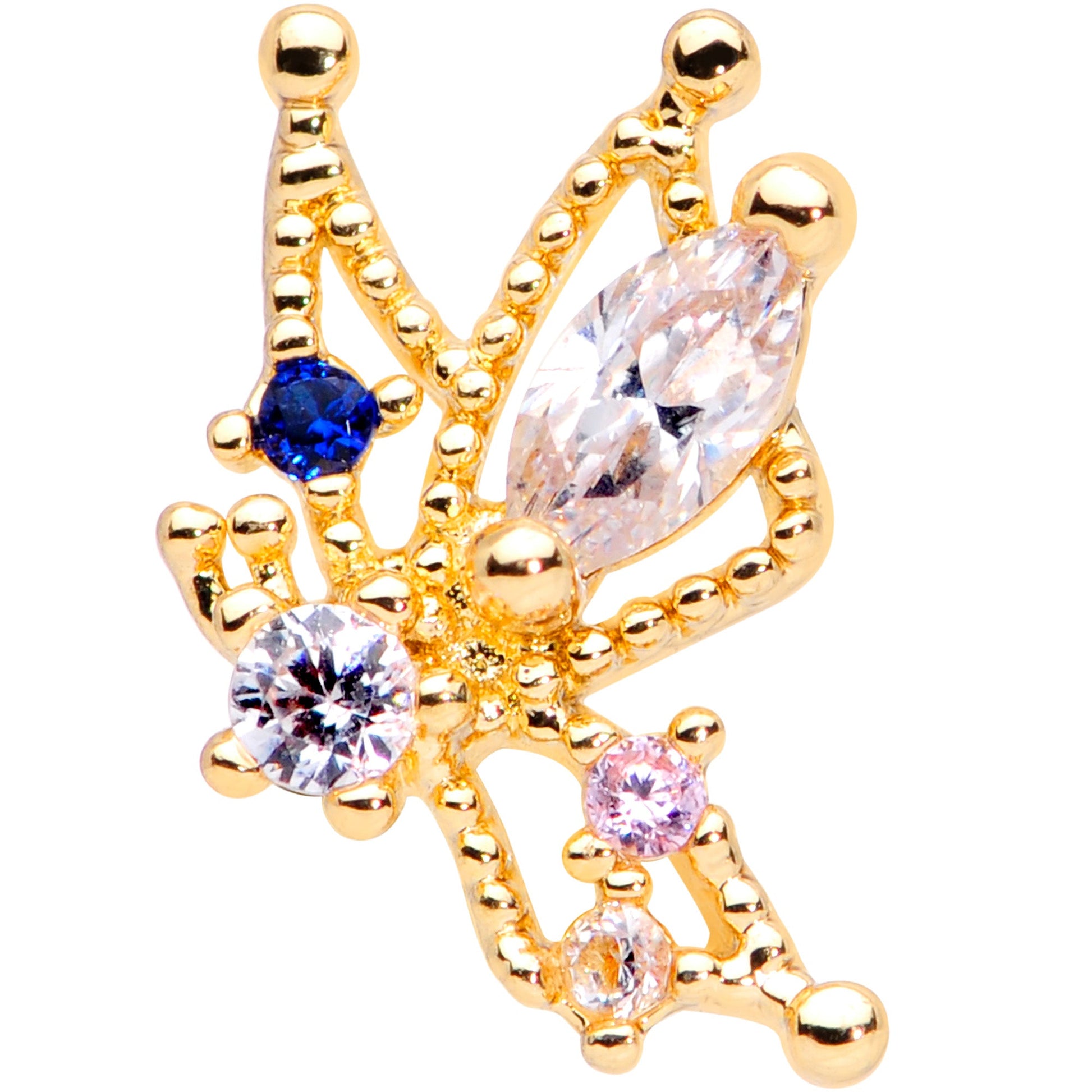 Give your cartilage earring an angel's touch this holiday season with this 16 gauge labret piercing! It's made with an 8mm gold tone PVD over 316L surgical grade stainless steel straight barbell with a flat back end. It features an abstract angel charm formed with clear cubic zirconia gems and a single blue gem above like a Christmas star. This cartilage jewelry can be worn in multiple piercings such as your labret, monroe, helix, tragus, and some conch piercings. Wear your love to the heavens this holiday with this angelic helix earring!Specifications