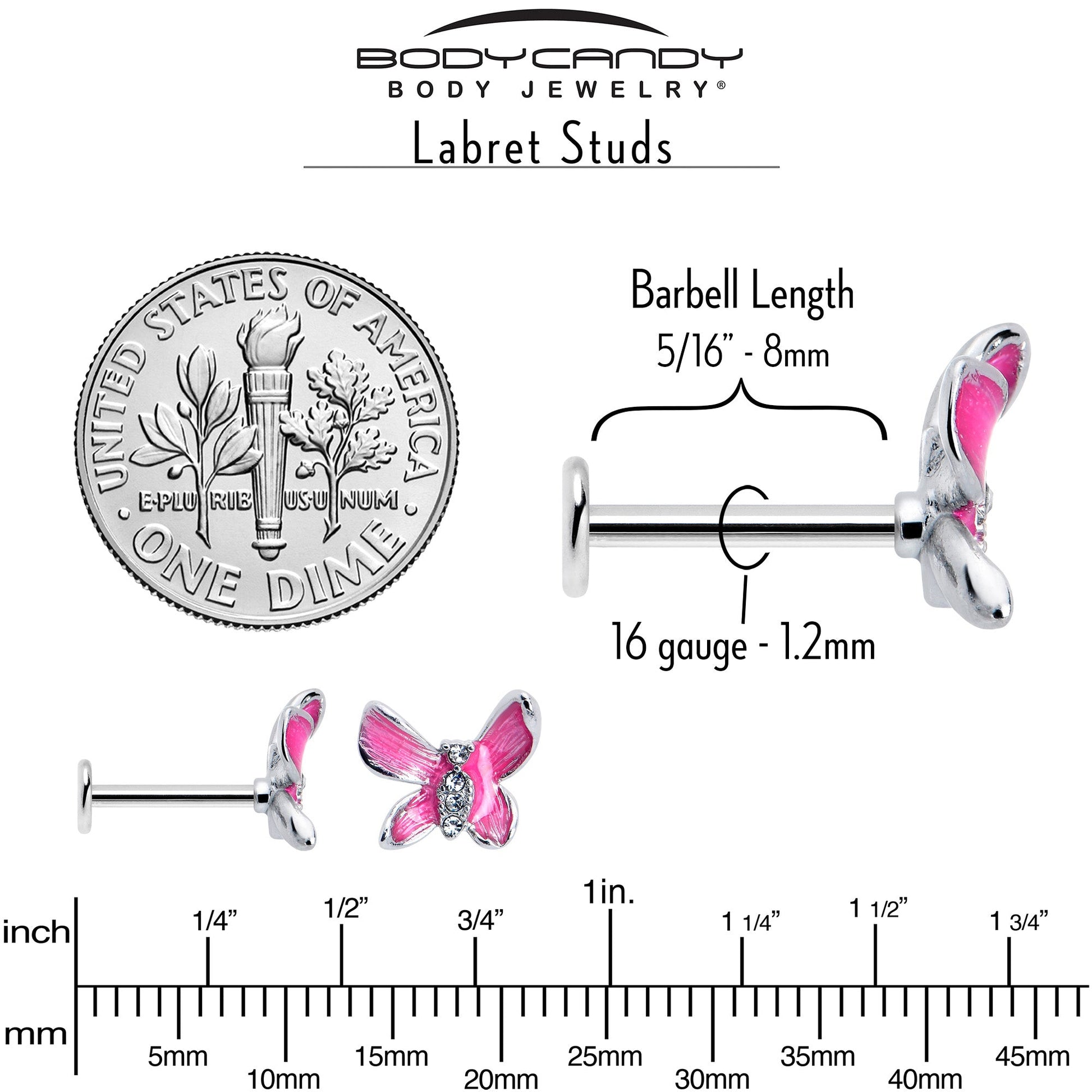 This 16 gauge lip ring is not just a beauty, it is a beautiful butterfly. It is made with an 8mm durable 316L surgical grade stainless steel straight post with a flat disc end. It features an elegantly simple butterfly charm, with hot pink wings and clear gems set into the body. You can even rock it in multiple piercings including lip, monroe, tragus, helix and some conch piercings. Simple details, style, and plenty of elegance - this cartilage piercing jewelry really is a beauty.Specifications