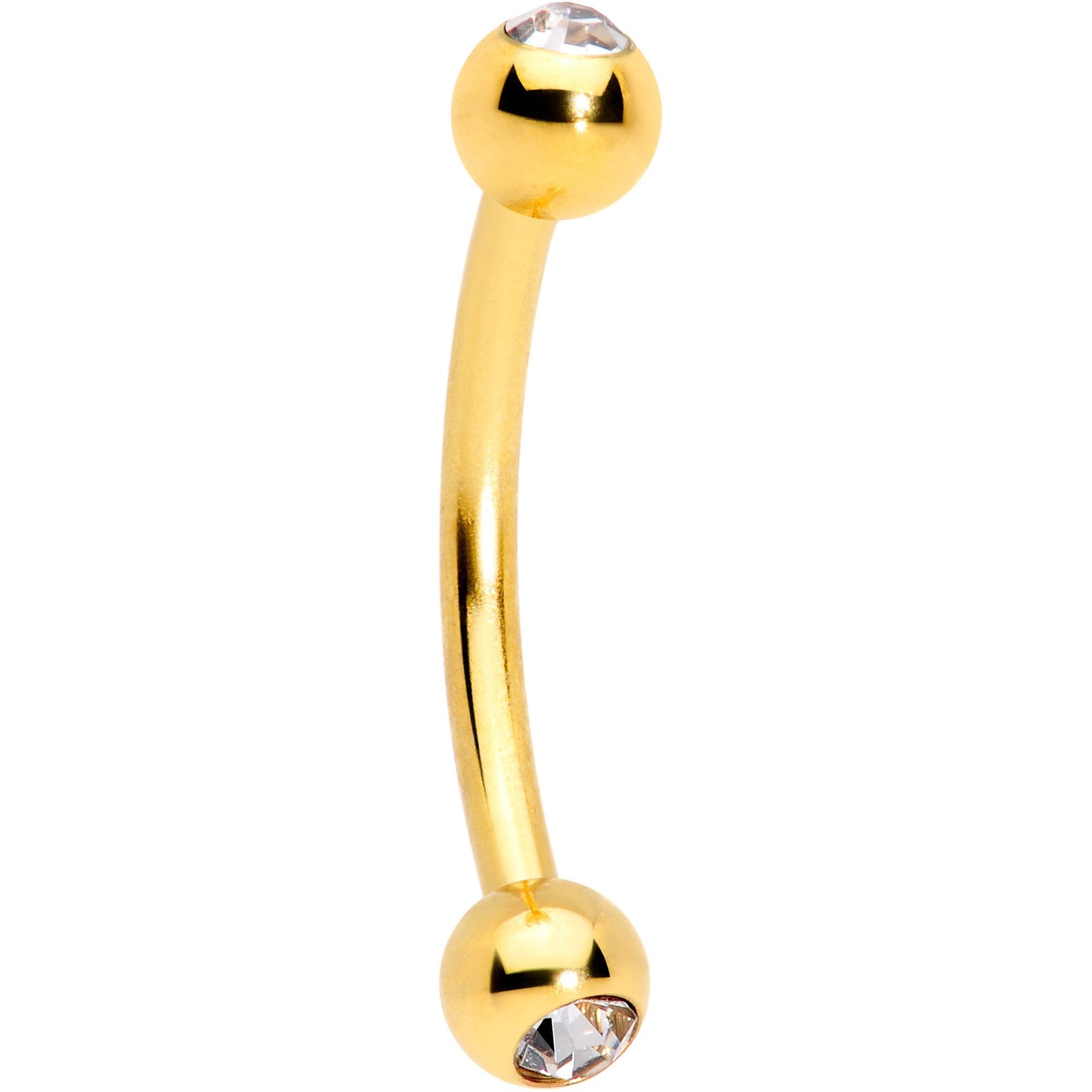 If you love to change up your look and are looking for 16 gauge curved barbell jewelry, this set is just for you. Made with 8mm gold tone anodized over 316L surgical grade stainless steel curved barbells, these eyebrow piercings feature 3mm ball ends and include a plain set, a white orb set, clear gem inlay set, and a clear gem flower end. These curved barbells can be worn in a variety of piercings including your eyebrow and cartilage piercings like your rook, helix, tragus, daith and more, and are sold as a set of four!Specifications