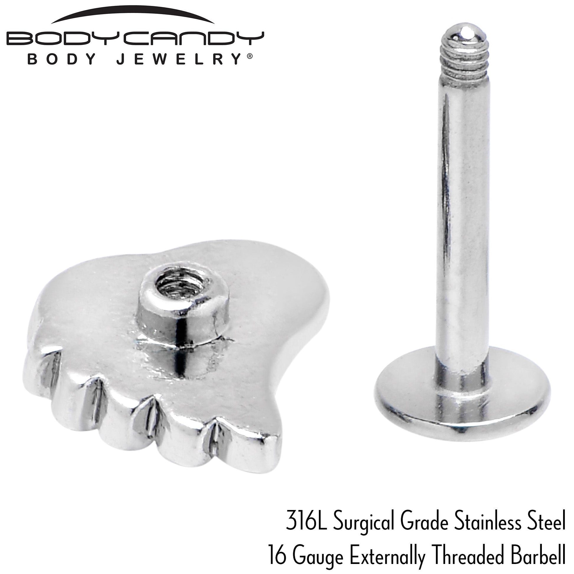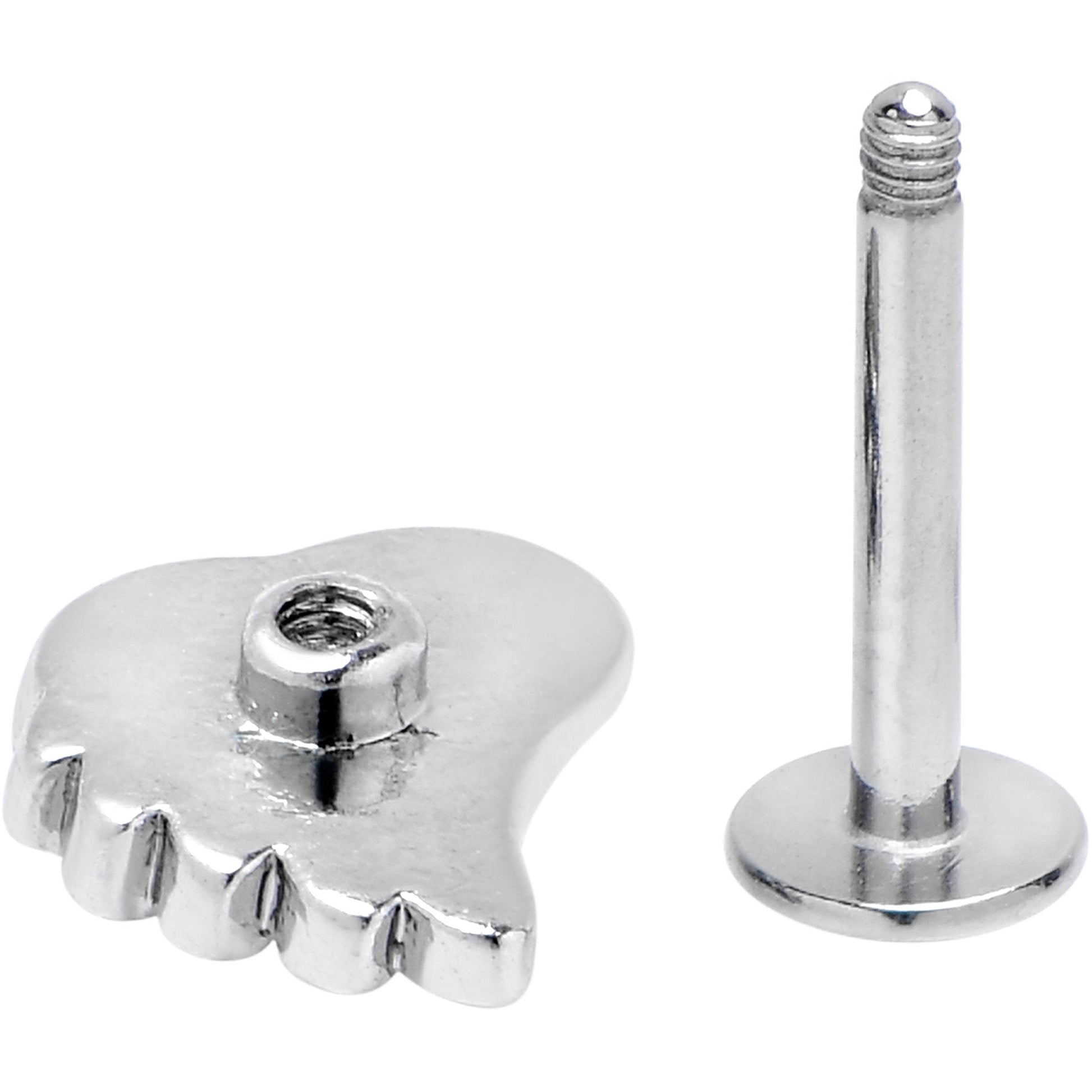 Give yourself a heavenly new look with this 16 gauge lip ring. It's made with an 8mm durable 316L surgical grade stainless steel straight post with a flat disc end. It features a heart shaped charm featuring an angel's wings, with one side paved with clear gems. The other side features black inlay and simply styled feather details and you can rock it in multiple piercings including lip, monroe, tragus, helix, and some conch piercings. Let your look and your spirit soar with this stylish and spiritual cartilage piercing jewelry.Specifications