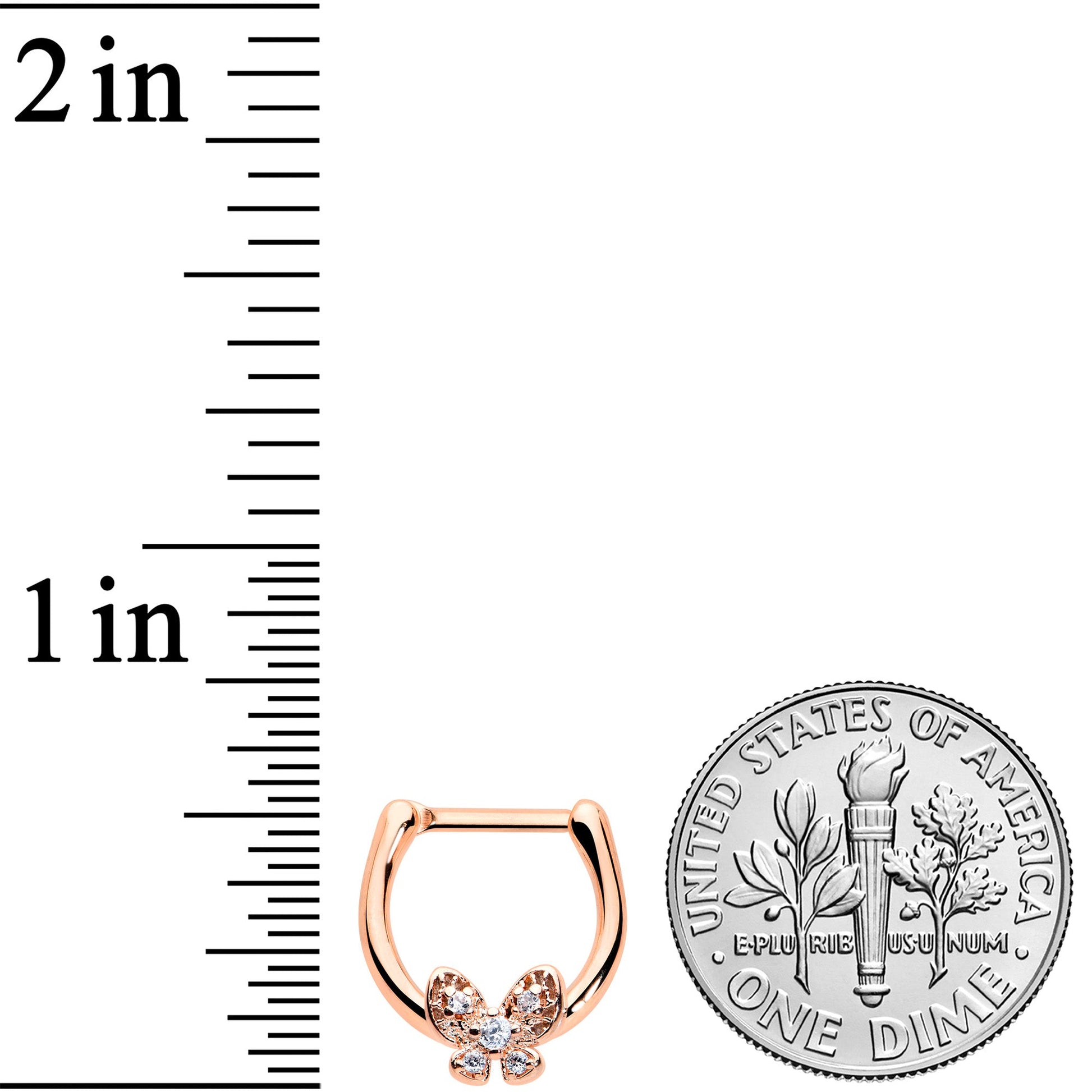 The butterfly on this 16 gauge tragus ring will have you feeling like you're walking on air! It's made with an 8mm rose gold tone PVD over 316L surgical grade stainless steel hinged straight barbell. It features a butterfly charm, with openwork wings for an airy feel. The butterfly is further embellished with clear gems for an elegant appearance. It also features a hinged, clicker design that makes insertion and removal a snap and you can even boast this butterfly in multiple piercings including tragus, helix, and some conch piercings. This elegant butterfly cartilage piercing ring will make you want to fly!Specifications