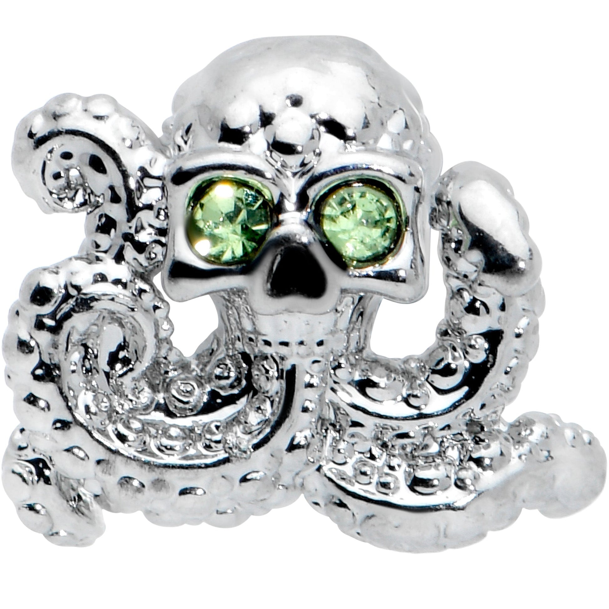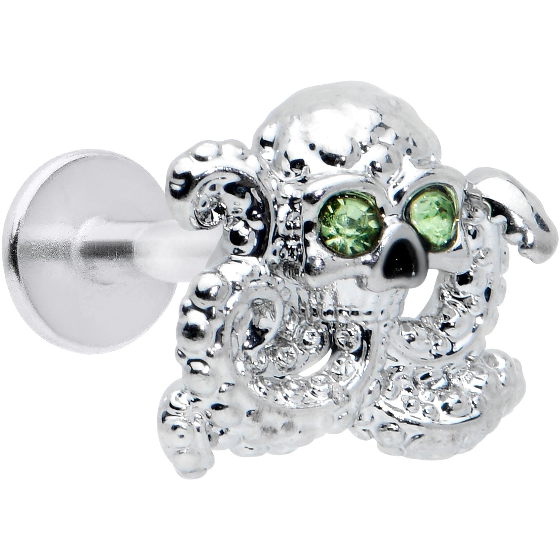 The light gets bright, even under the sea - just ask the leggy fellow on this 16 gauge lip ring! It's made with an 8mm durable 316L surgical grade stainless steel straight barbell with a flat disc end. It features an octopus charm, embellished with tiny clear gems. It's further embellished with green gem aviator sunglasses, for that extra look of hip. You can even sport this cephalopod in multiple piercings including lip, monroe, tragus, helix, and some conch piercings. Whether you're a sailor, a siren, or simply smitten with our eight-legged swimmer friends, this cartilage jewelry is sure to add a whimsical touch of style to your look!Specifications