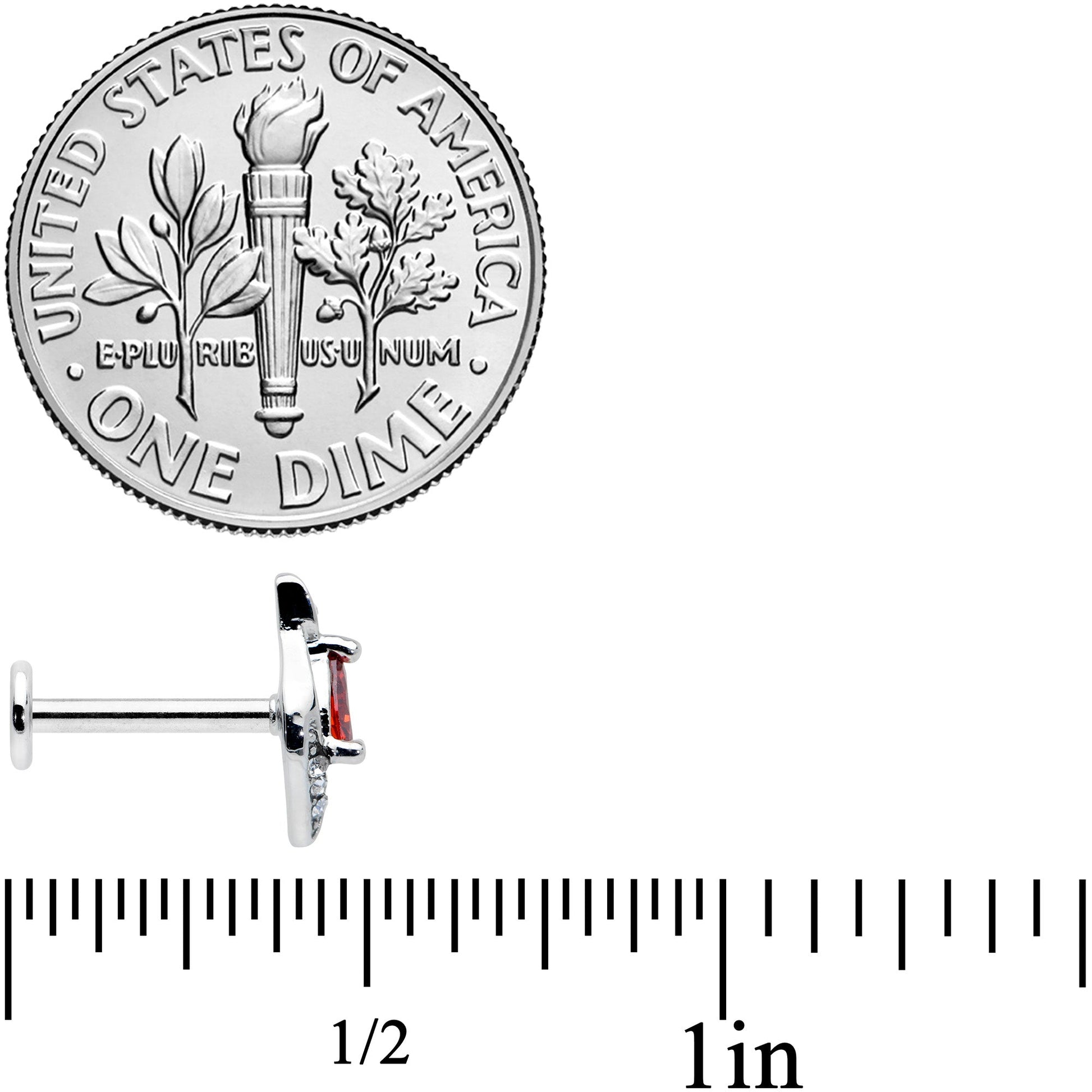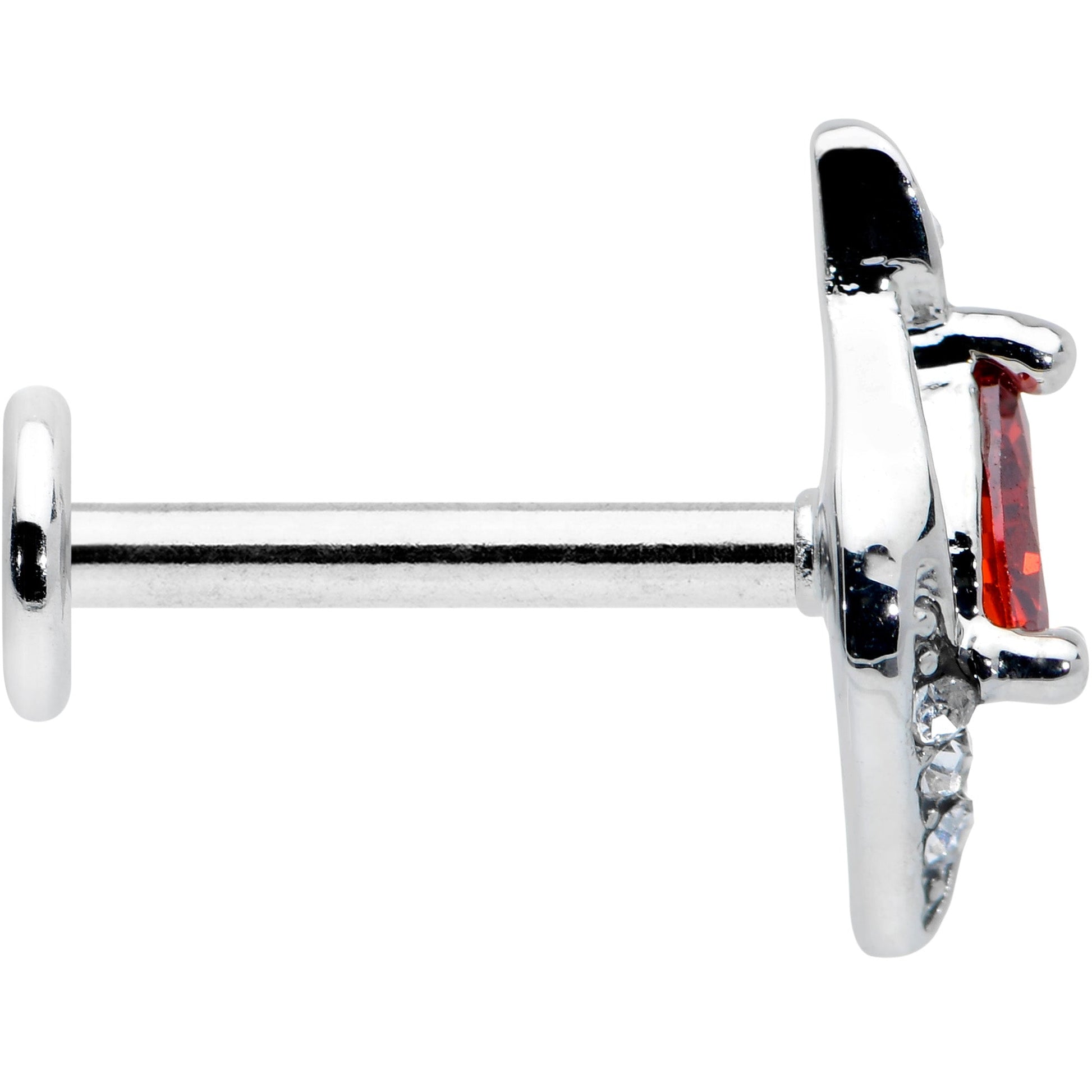 Add a bit of color to your cartilage piercings with this 16 gauge lip ring! It's made with an 8mm durable 316L surgical grade stainless steel straight barbell with a flat disc end. It features an oval charm. The oval has clear gems along the sides in an asymmetrical pattern. The oval is further embellished with a large red gem in the center. You can even sport this swirl in multiple piercings including lip, monroe, tragus, helix, and some conch piercings! Give a new impact to your look when you're rocking this opulent, oval-themed cartilage jewelry.Specifications