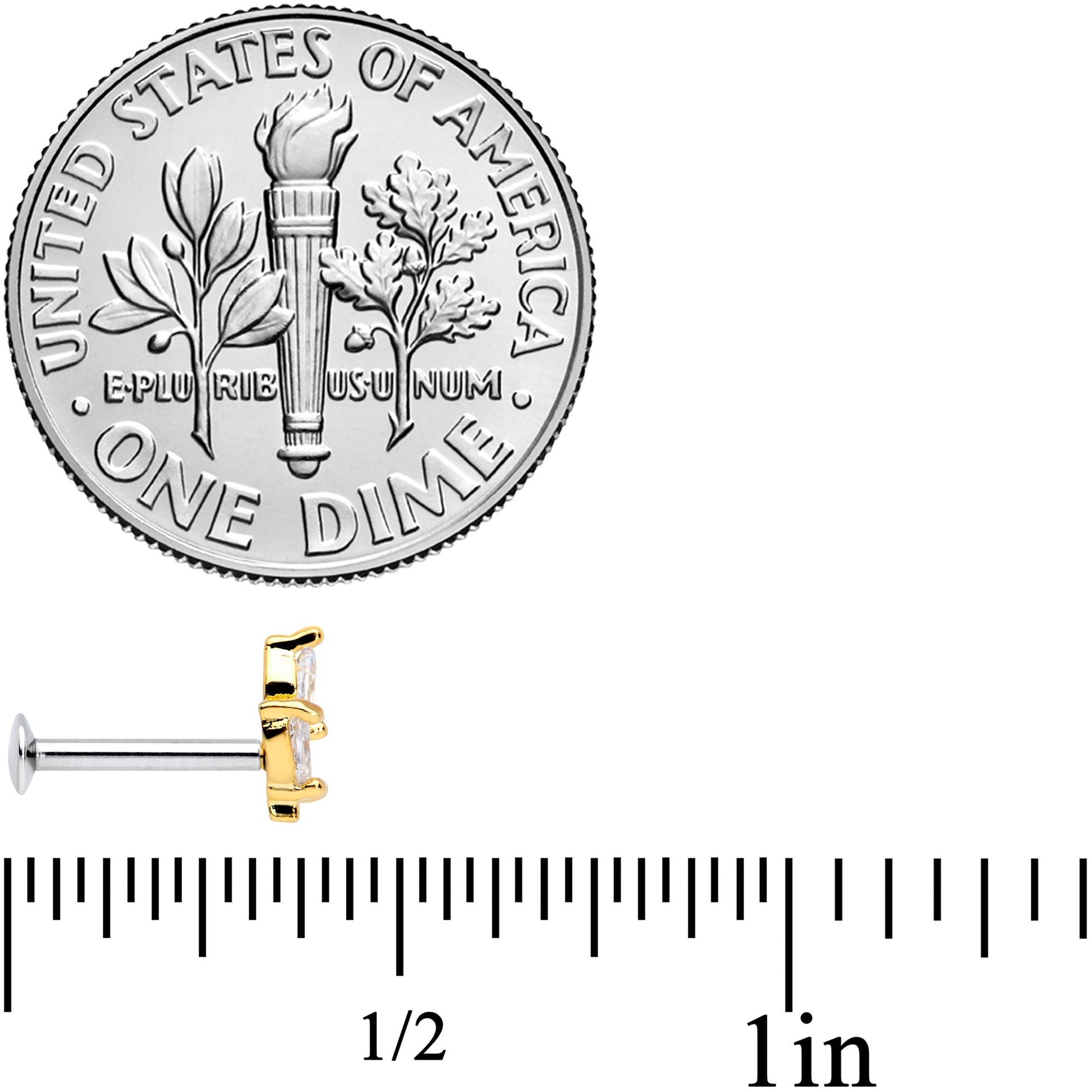 Simple and classic body jewelry is always in style, like this 16 gauge cartilage jewelry that's made with an 8mm durable 316L surgical grade stainless steel straight barbell with a flat disc back. This tragus stud also has a clear cubic zirconia gem gold tone leaf charm top that features a threadless design, allowing the top to be pushed into the barbell instead of requiring you to screw it on and off. Best of all, you can wear this monroe jewelry in multiple piercings including your labret, monroe, and cartilage piercings like the helix, tragus, and some conch piercings.Specifications