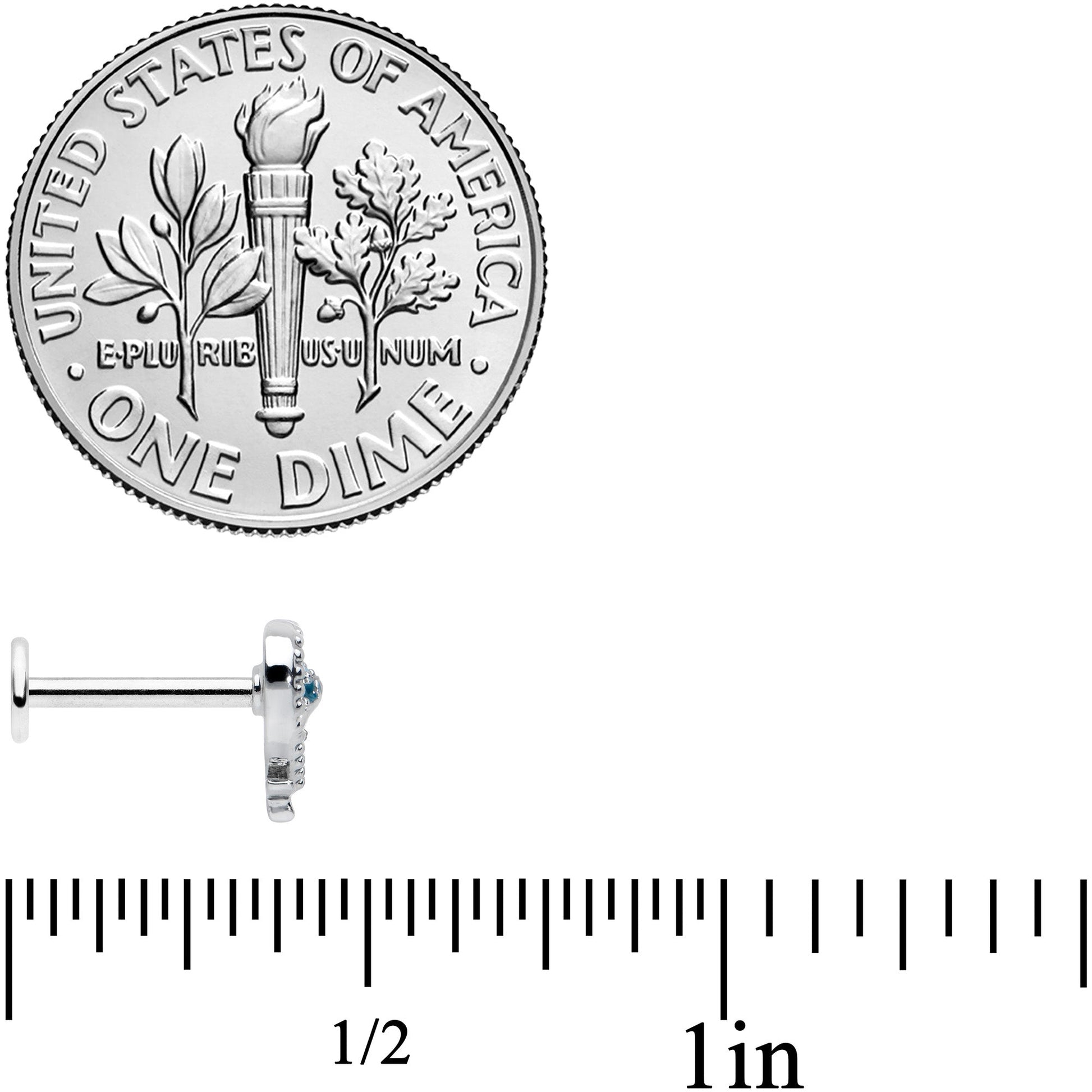If your heart is devoted to dolphins, show it off with this 16 gauge lip ring! It's made with an 8mm durable 316L surgical grade stainless steel straight barbell with a flat disc end. It features a heart charm, set with textured embellishment. Within the heart is a dolphin, with blue embellishments set into its body and a black eye embellishment. The dolphin appears to be twining with the heart so that their tail forms a portion of the heart itself and you can even rock it in multiple piercings including lip, monroe, tragus, helix, and some conch piercings. Fall in love with the creatures of the sea when you're rocking this awesome, aquatic cartilage piercing ring!Specifications