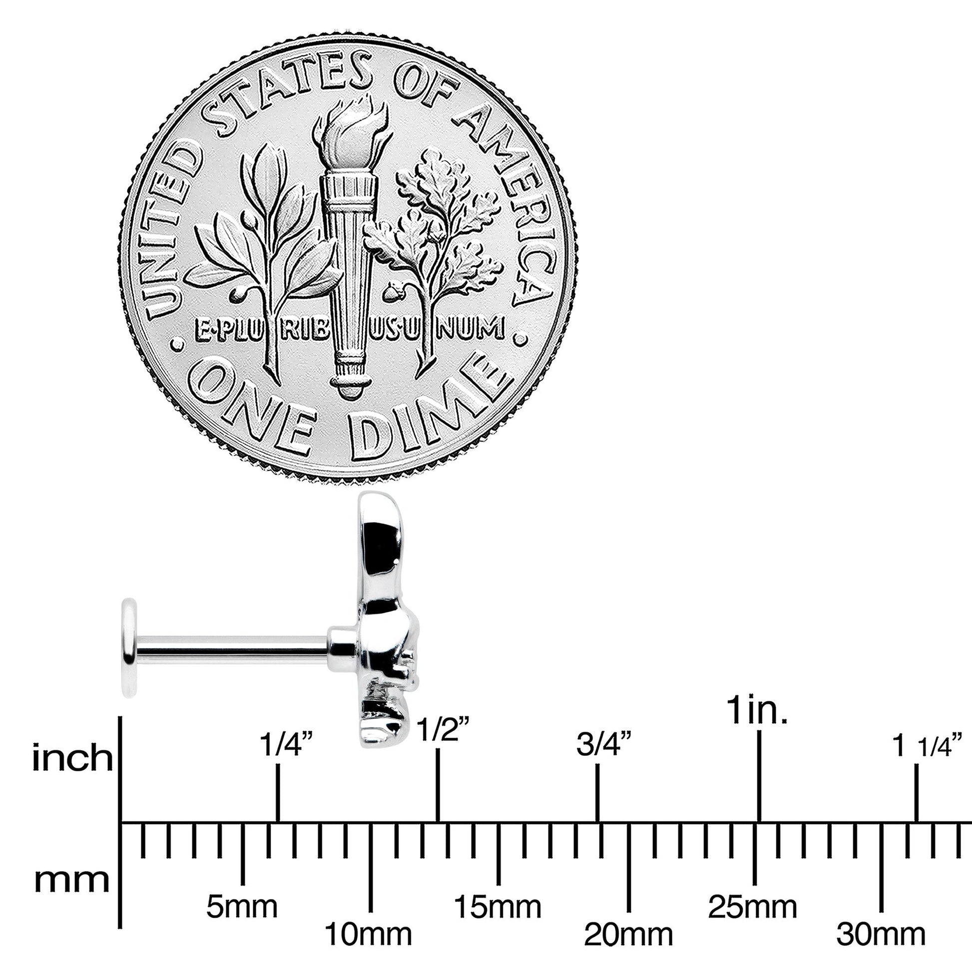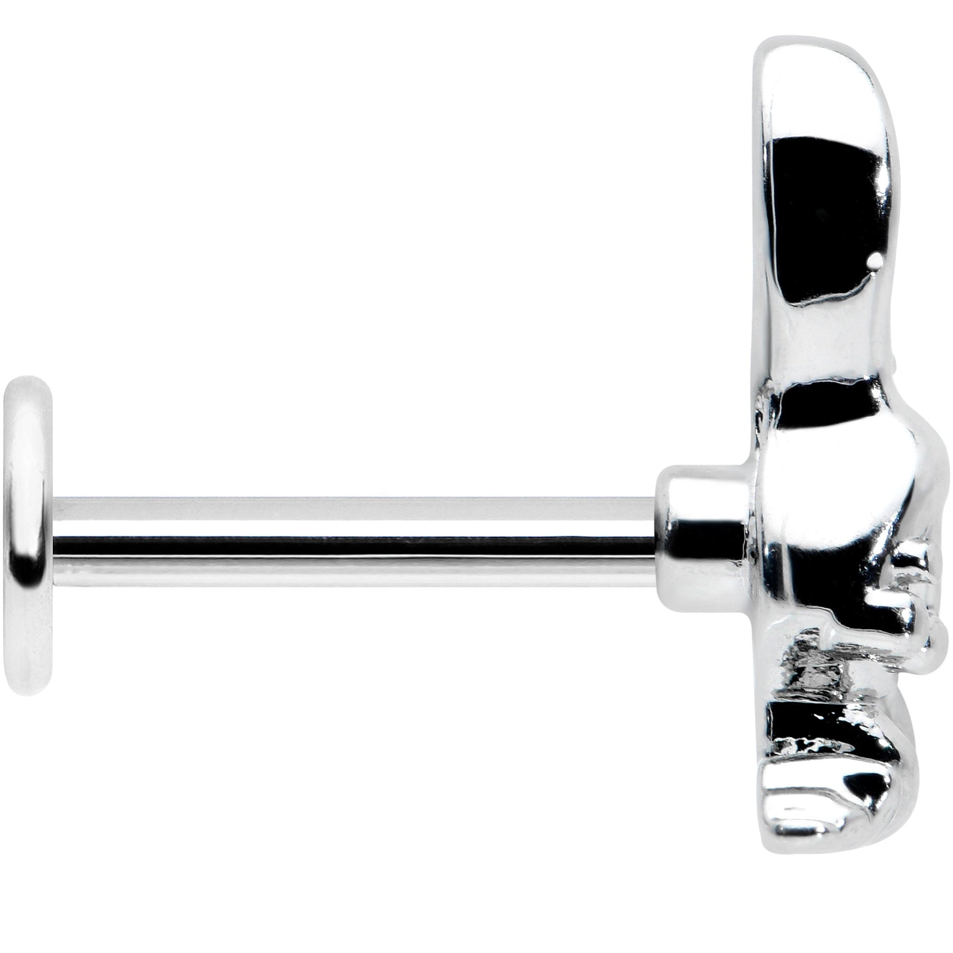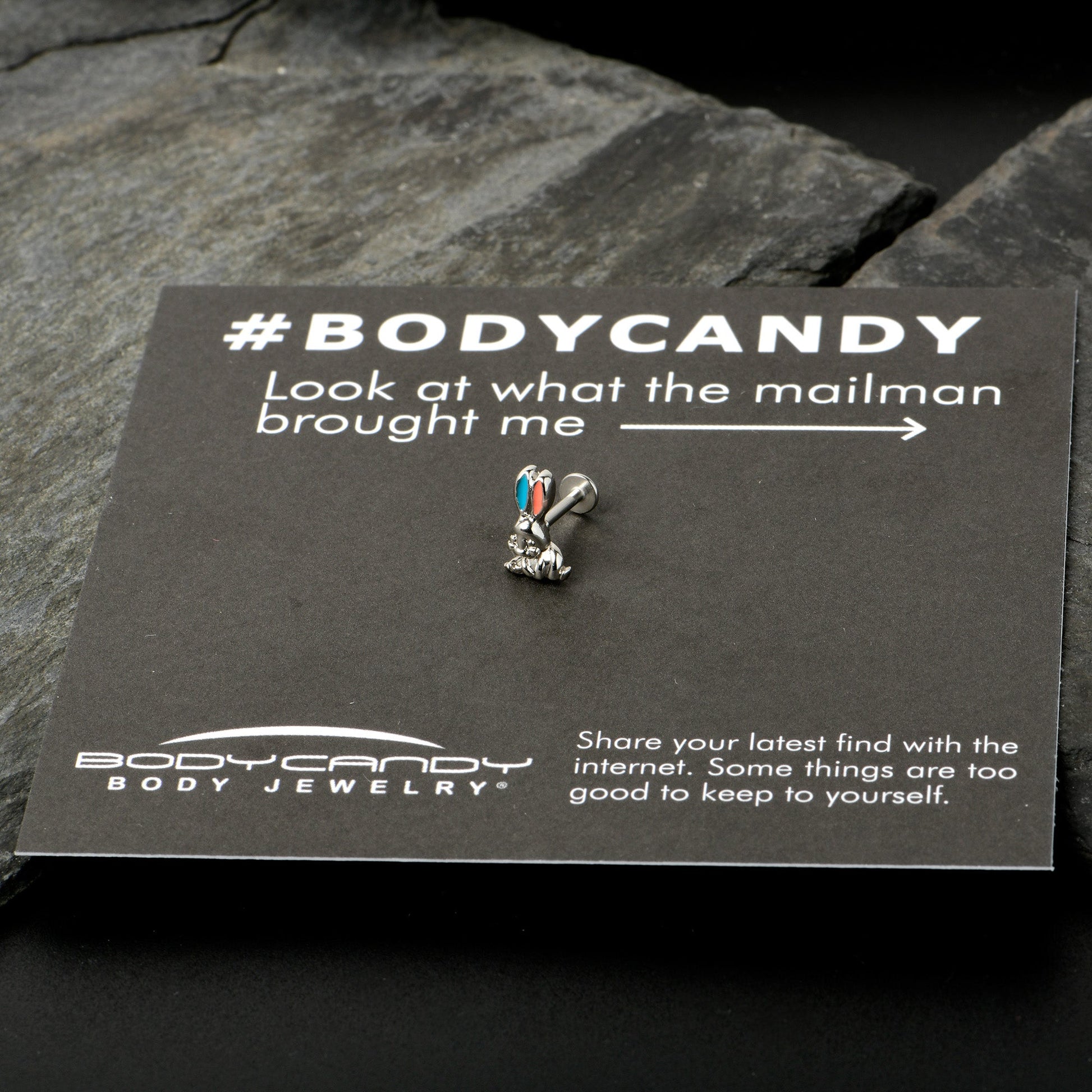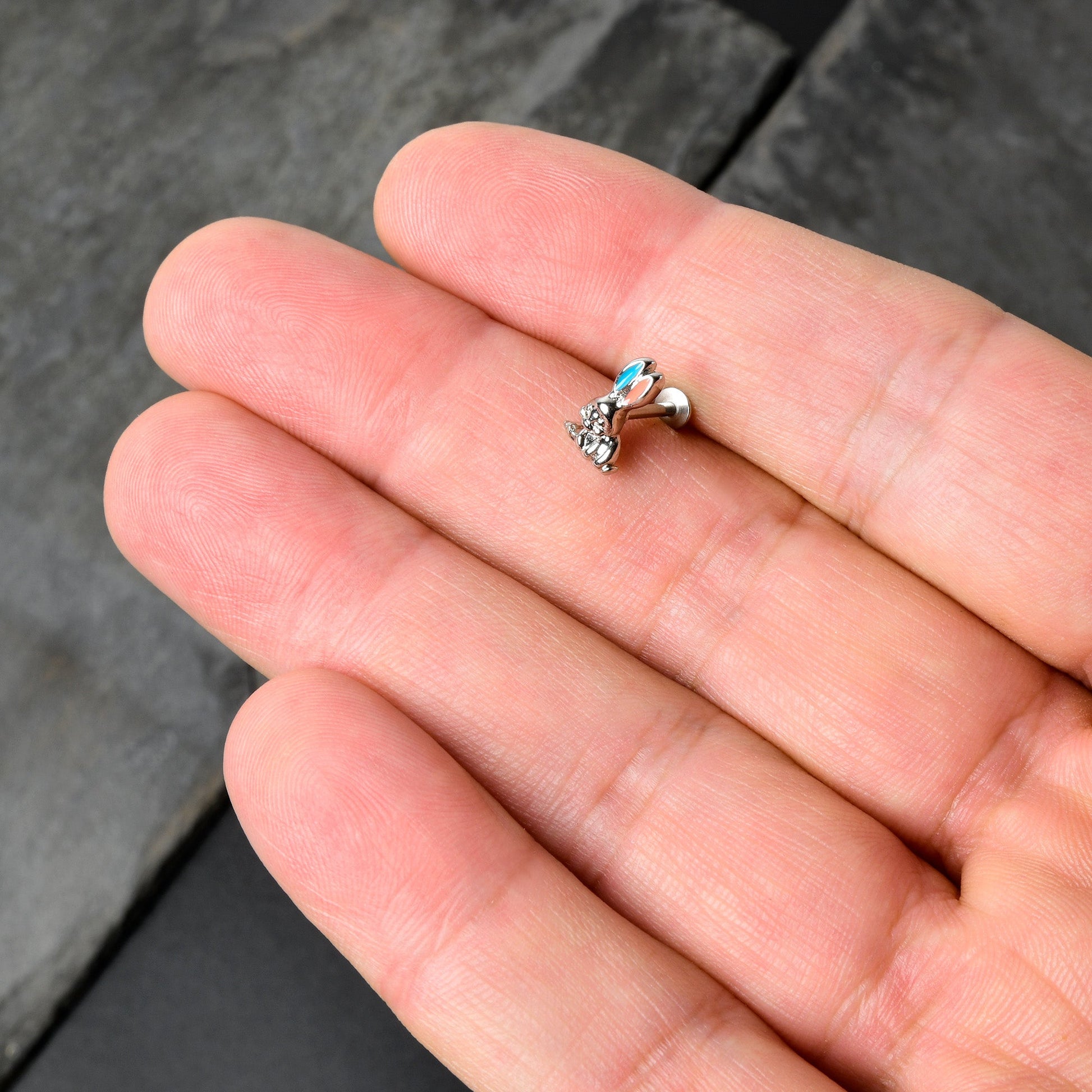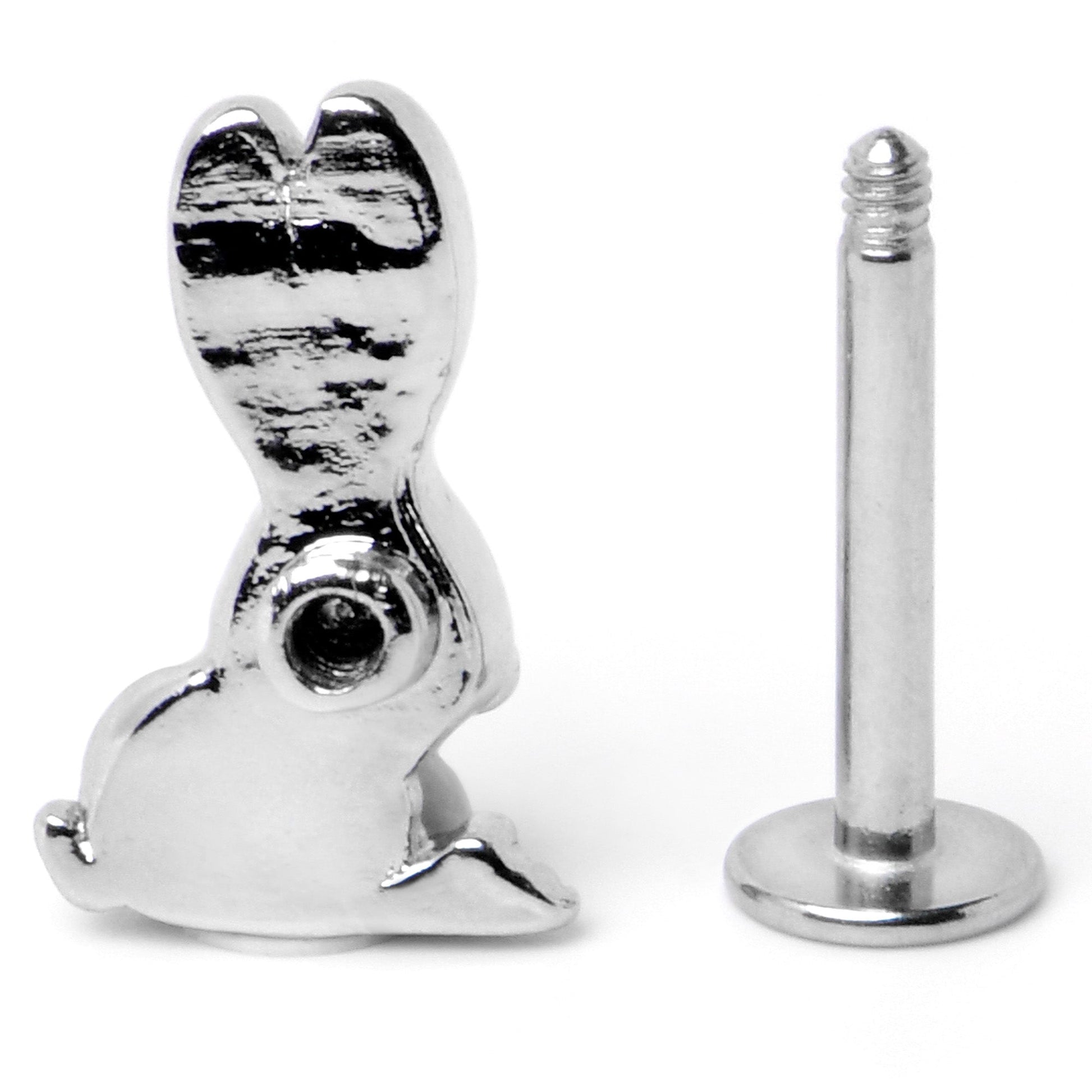 Hop into holiday style with this 16 gauge lip ring! It's made with an 8mm durable 316L surgical grade stainless steel straight post with a flat disc end. It features an Easter bunny charm. The bunny is embellished with red inlay in one ear and blue inlay in the other ear, for a festive splash of color you can't ignore. You can even rock this rabbit in multiple piercings including lip, monroe, tragus, helix, and some conch piercings. Go down a rabbit hole of color and fashion with this festive Easter cartilage piercing ring.Specifications