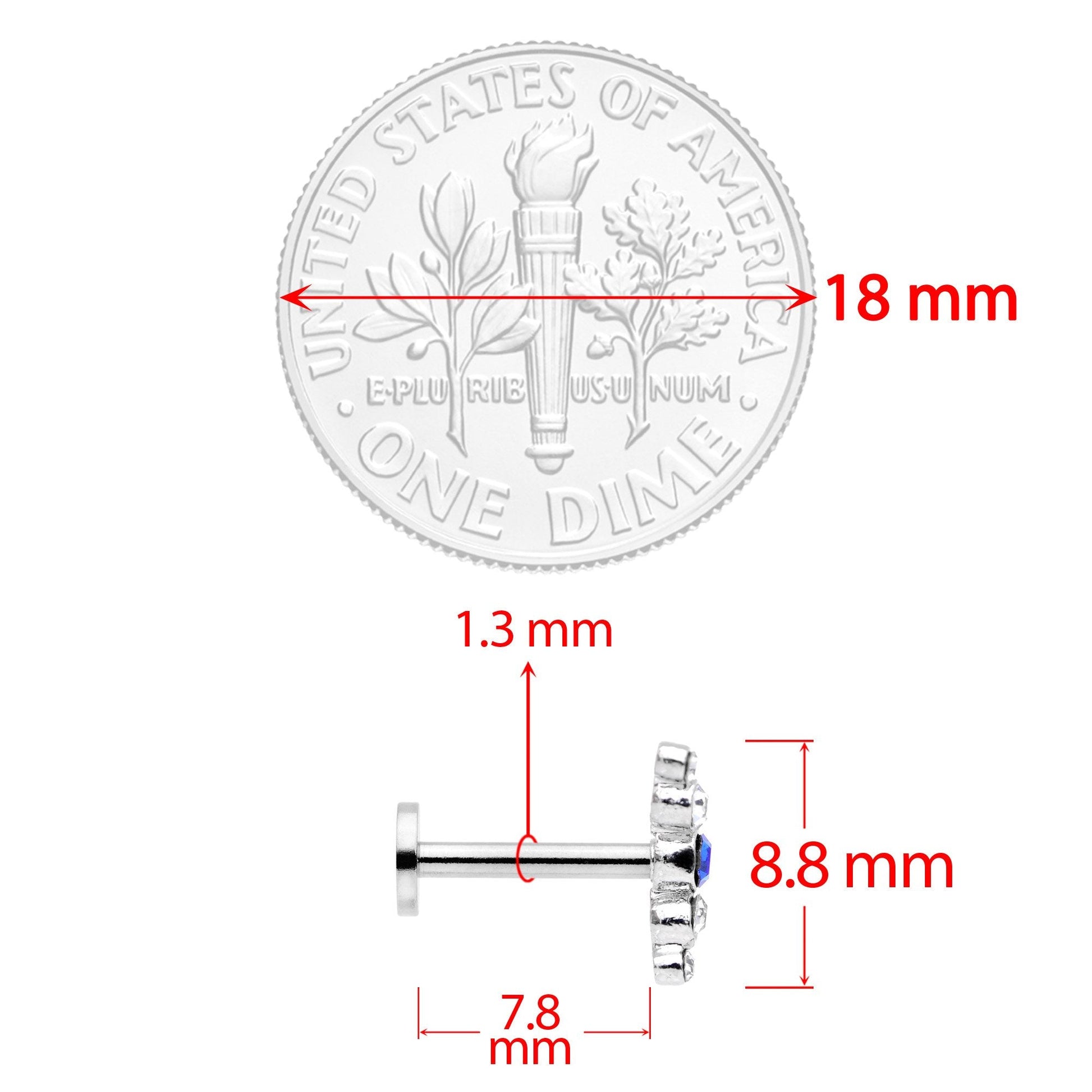 You'll be delighted to have the blues with this set of labret jewelry! You get one made with an 8mm black PVD plated over 316L surgical grade stainless steel with a 3mm black ball end. You get also get two made with internally threaded 8mm durable 316L surgical grade stainless steel posts. One features a 3mm faux turquoise ball end for an exciting pop of bright color. The other features a curved embellishment that has a deep blue cubic zirconia flanked by four clear cubic zirconias. These can be worn in cartilage piercings like your tragus, helix, and conch as well as the monroe piercing. Sold as a set of three.Specifications
