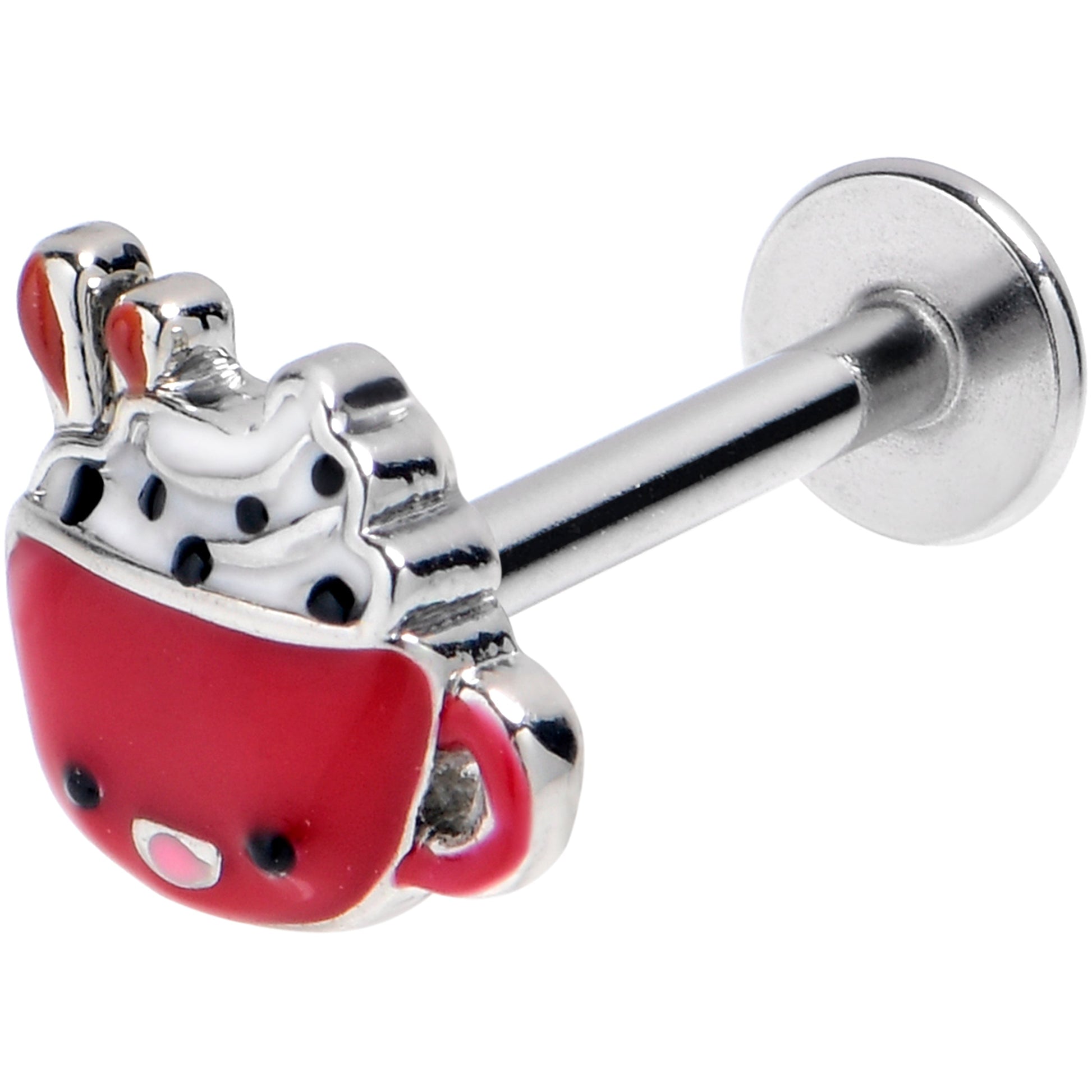 This 16 gauge lip ring will keep you looking sweet and feeling warm at heart for the holiday season. It's made with an 8mm durable 316L surgical grade stainless steel straight post with a flat disc end. It features a mug of cocoa charm, inlaid in red. The mug has an endearingly sweet smiling face. It is embellished with whipped cream and candy detailing for a truly festive feel. You can even rock it in multiple piercings including lip, monroe, tragus, helix, and some conch piercings. Get a look that is as sweet and as hot as you could want with this charming cocoa cartilage piercing jewelry.Specifications