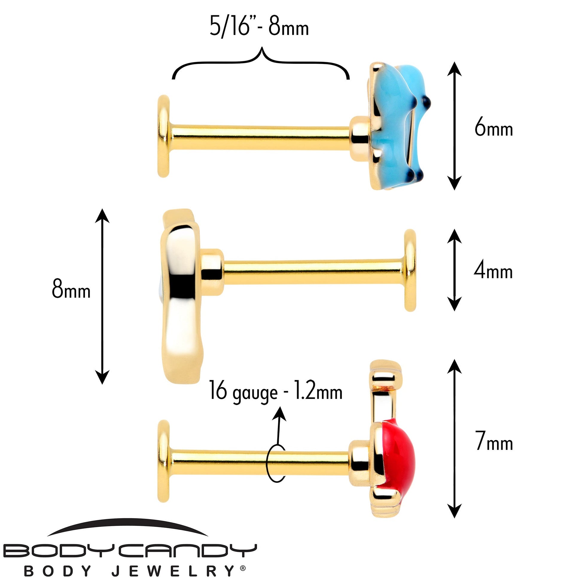 Put a little Spring in your piercings with this set of 16 gauge lip rings. They're made with 8mm gold tone PVD over 316L surgical grade stainless steel straight posts with flat disc ends ends. You get one featuring a delicious looking red cherries charm. The second one features a white flower charm with green leaf detailing. The third one features a blue butterfly charm embellished with dark blue polka dot embellishments. You can even rock them in multiple piercings including lip, monroe, helix, tragus, and some conch piercings. Make your cartilage piercings feel like Springtime with this cheerful, colorful cartilage piercing jewelry. Sold as a set of three.Specifications