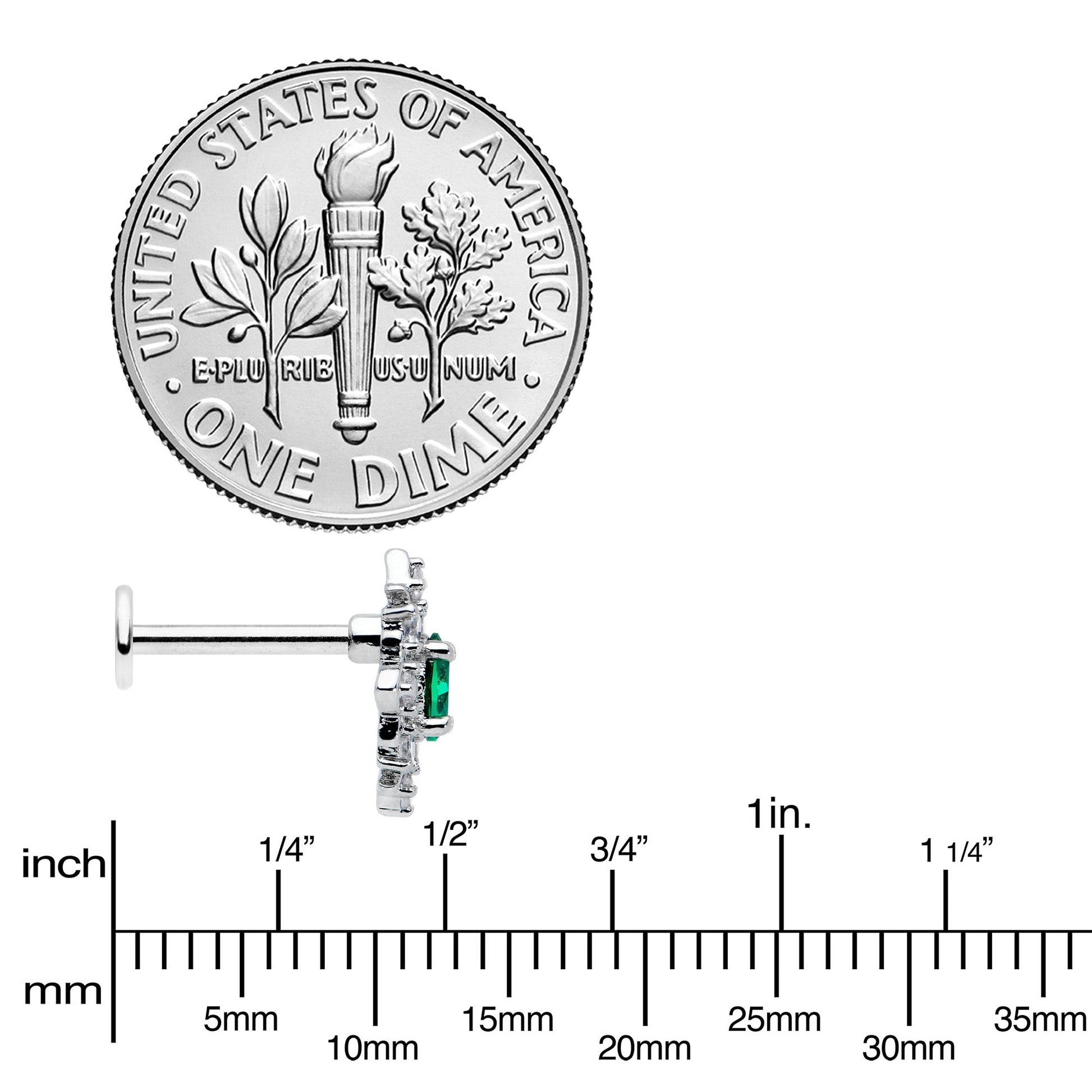 Take your cartilage piercings back in time with this antique-inspired 16 gauge lip ring! It's made with an 8mm durable 316L surgical grade stainless steel straight post with a flat disc end. It features a large, oval green gem charm, set in a stylized rhombus that's embellished with clear gems for an elegantly retro appearance. You can even rock this rhombus in multiple piercings including lip, monroe, tragus, helix, and some conch piercings. Give an antique-inspired look to a modern piercing with this Art Deco styled cartilage jewelry!Specifications