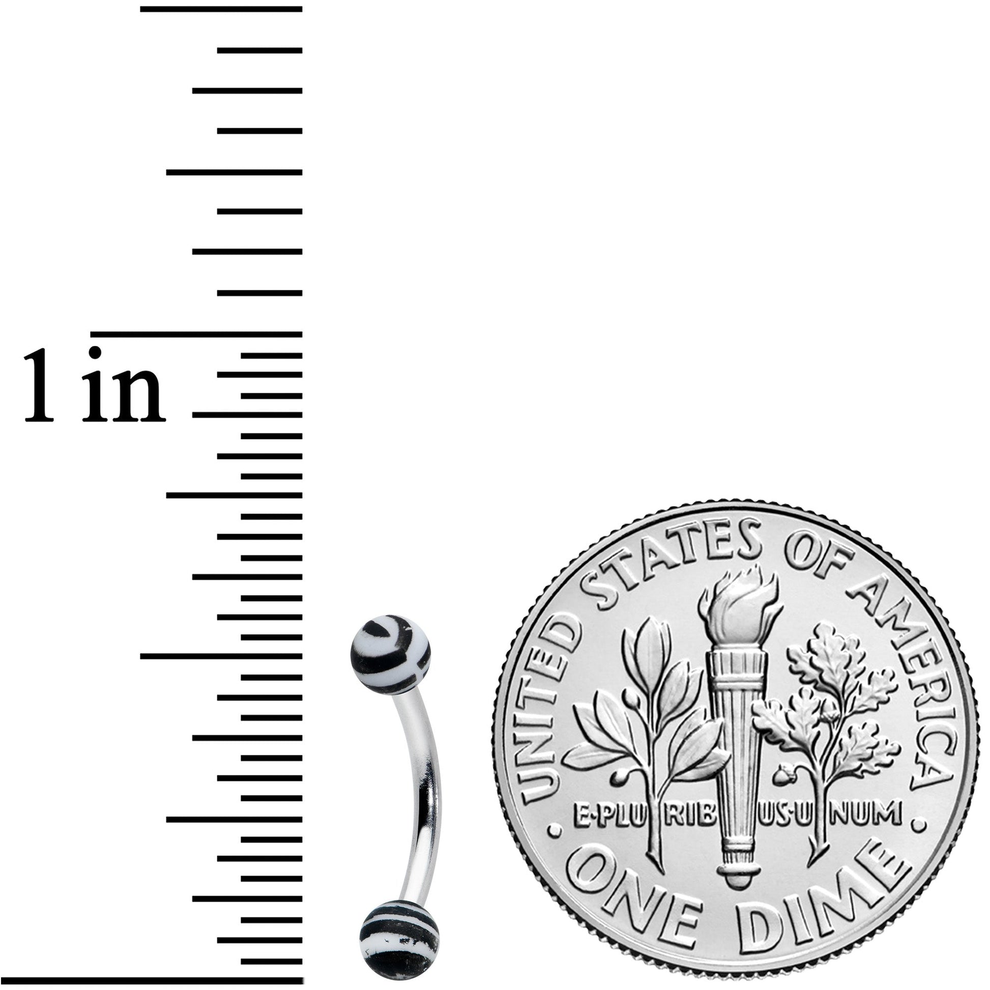 Add some zany zebra style to your look with this 16 gauge eyebrow jewelry! It's made with an 8mm durable 316L surgical grade stainless steel curved barbell with 3mm ball ends. The ball ends are made with acrylic and feature a white and black zebra-striped pattern. It also features a matte finish for a look that stands out without overwhelming and you can rock it in multiple piercings including rook, helix and eyebrow piercings. You'll definitely love the look of this cartilage jewelry!Specifications