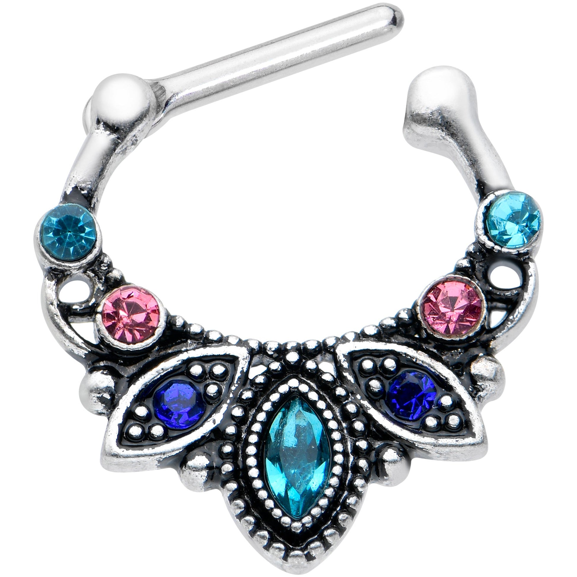 Every day's a party with this 16 gauge cartilage ring! It's made with an 8mm durable 316L surgical grade stainless steel hinged straight barbell. It features a festive charm of pink and blue gems in round and oval shapes. It's further embellished with textured detailing and heavily burnished to make every detail pop! It also features a hinged, clicker design that makes insertion and removal a snap and you can wear it in multiple piercings such as tragus, helix, and daith. Add a festive touch of colorful style to your cartilage piercings with this fun and fashionable cartilage ring!Specifications