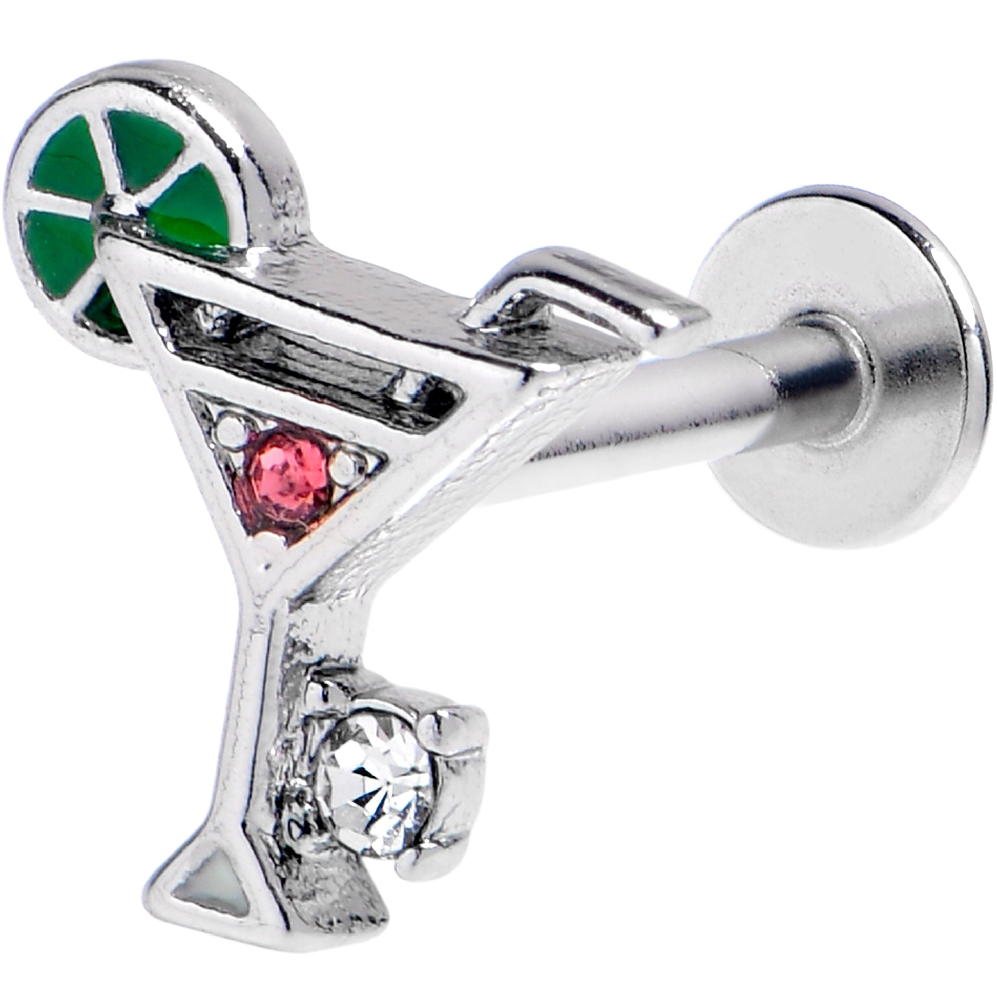 Bottoms up for style, with this 16 gauge lip ring. It is made with an 8mm durable 316L surgical grade stainless steel straight post with a flat disc end. It features a martini glass charm, with a pink gem center and green fruit slice embellishment. It also features a clear gem to one side to give the look of a stray ice cube and you can rock it in multiple piercings including lip, monroe, tragus, helix, and some conch piercings. Drink in the compliments when you're rocking this cocktail-themed cartilage piercing jewelry.Specifications